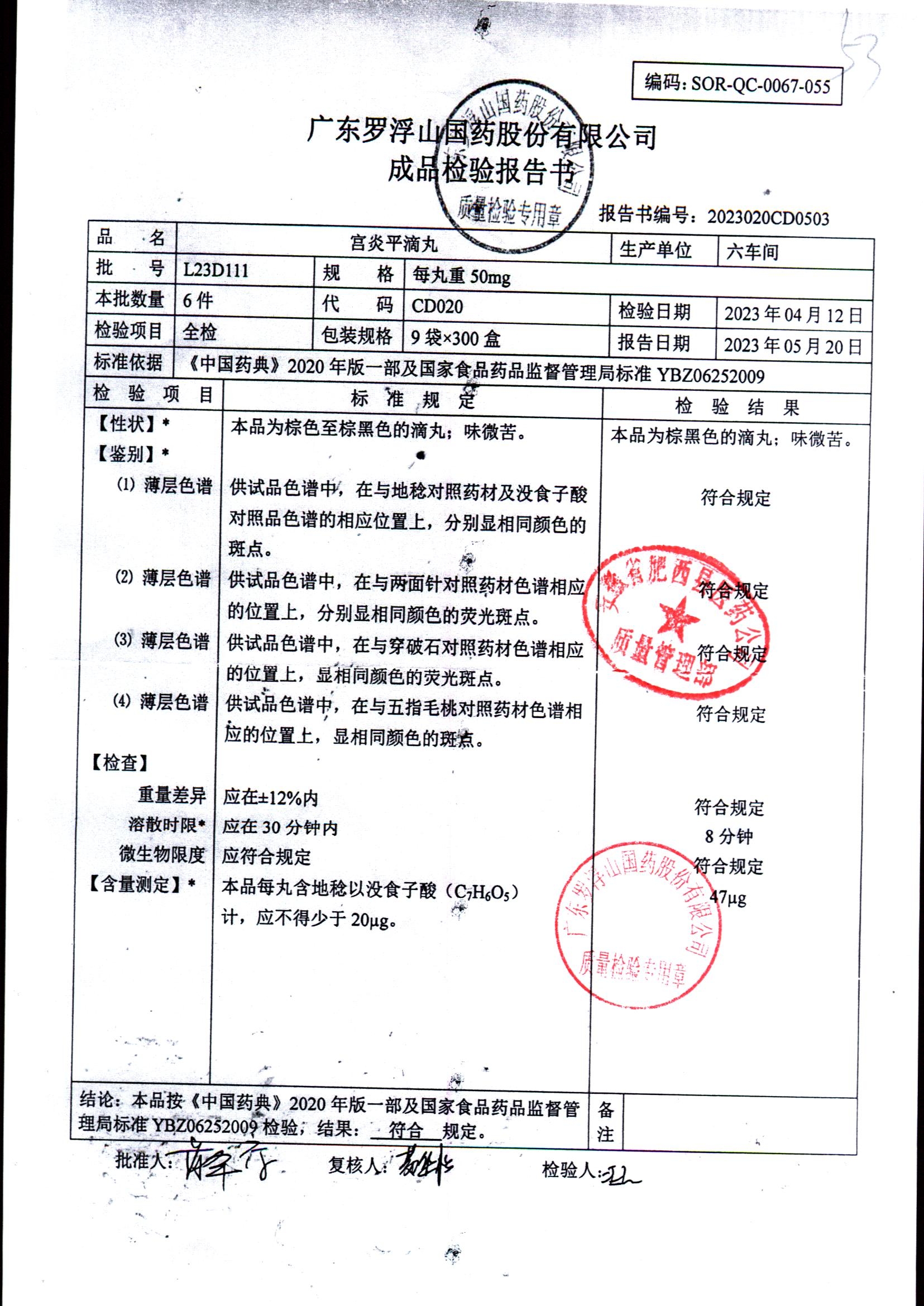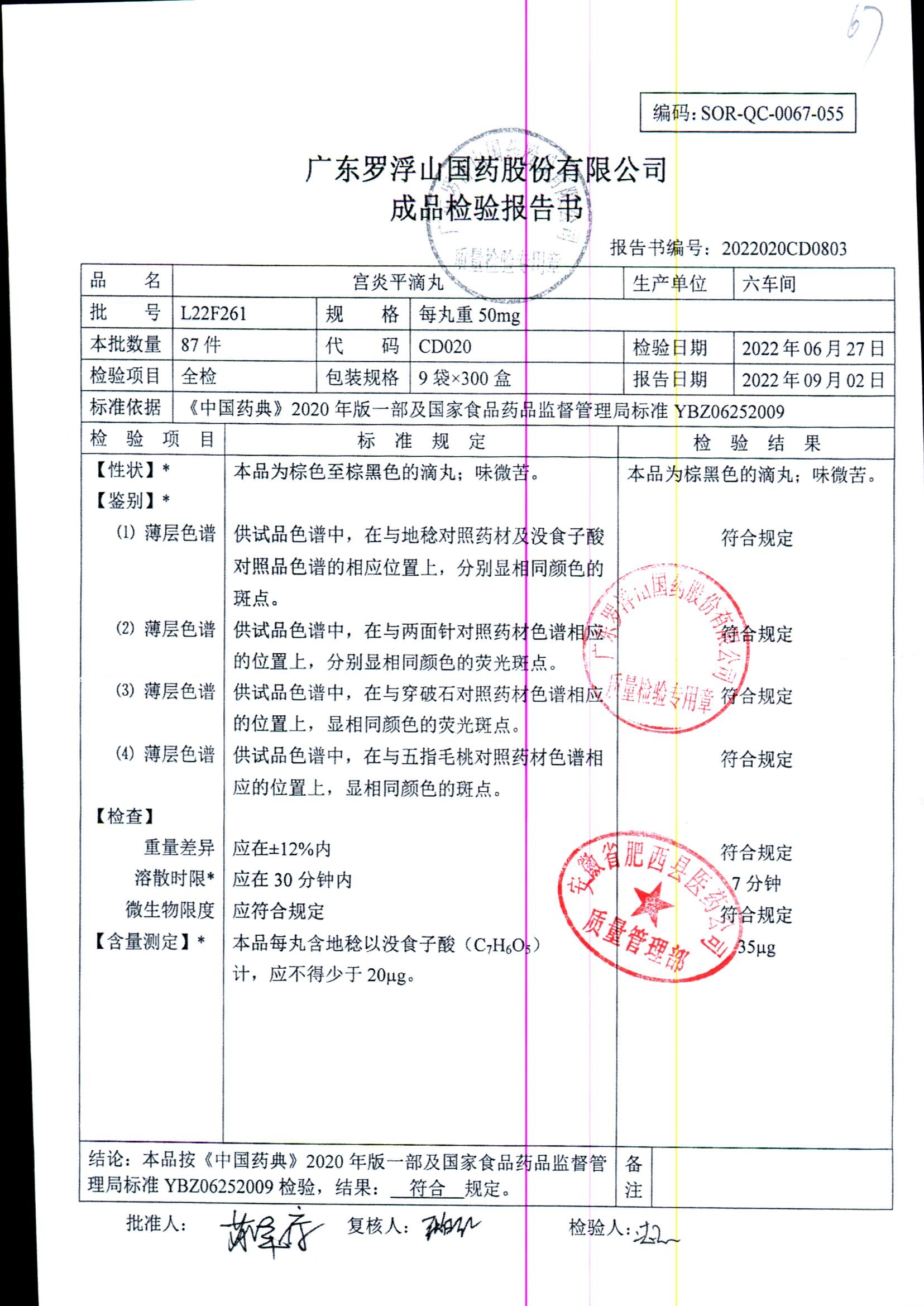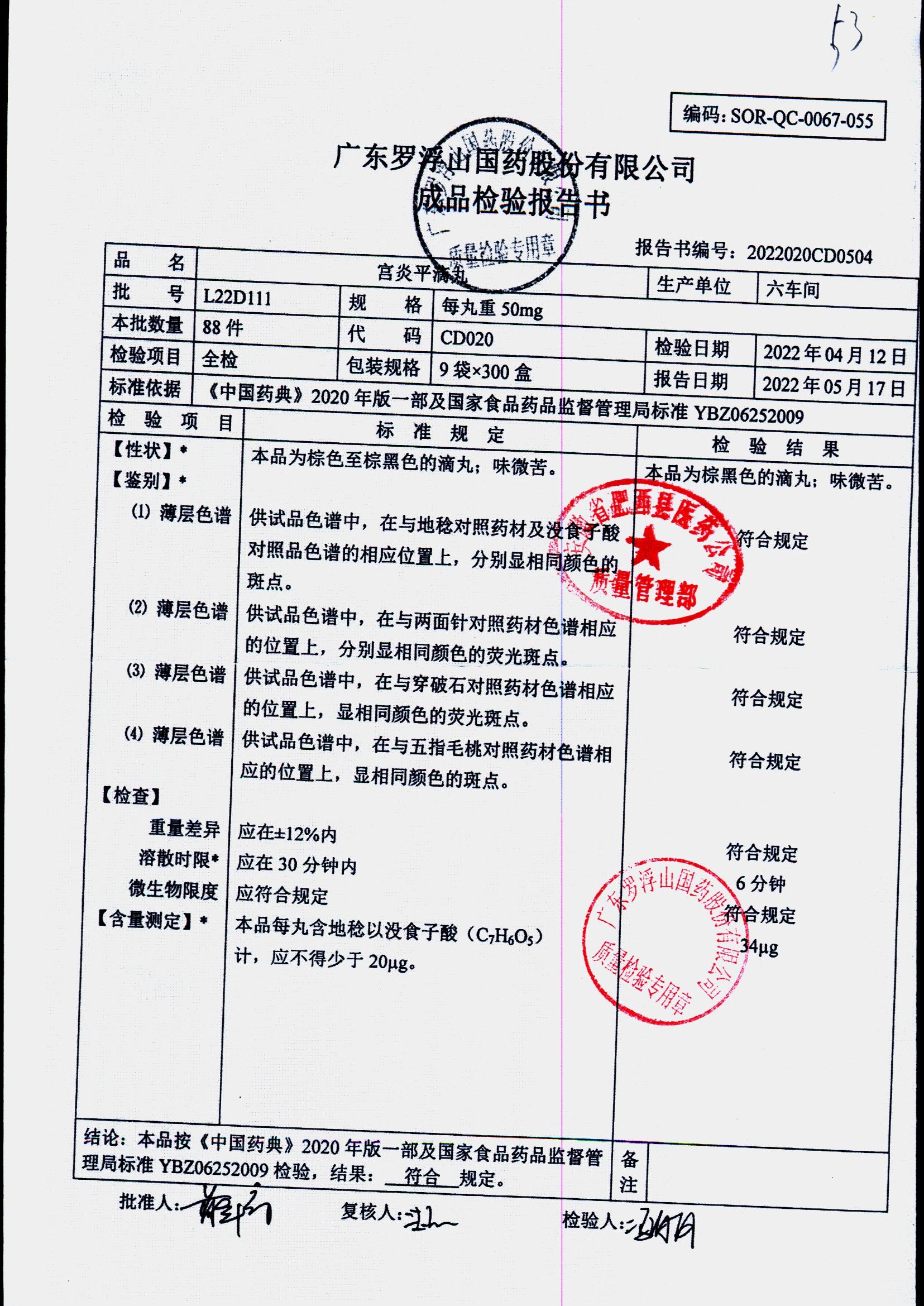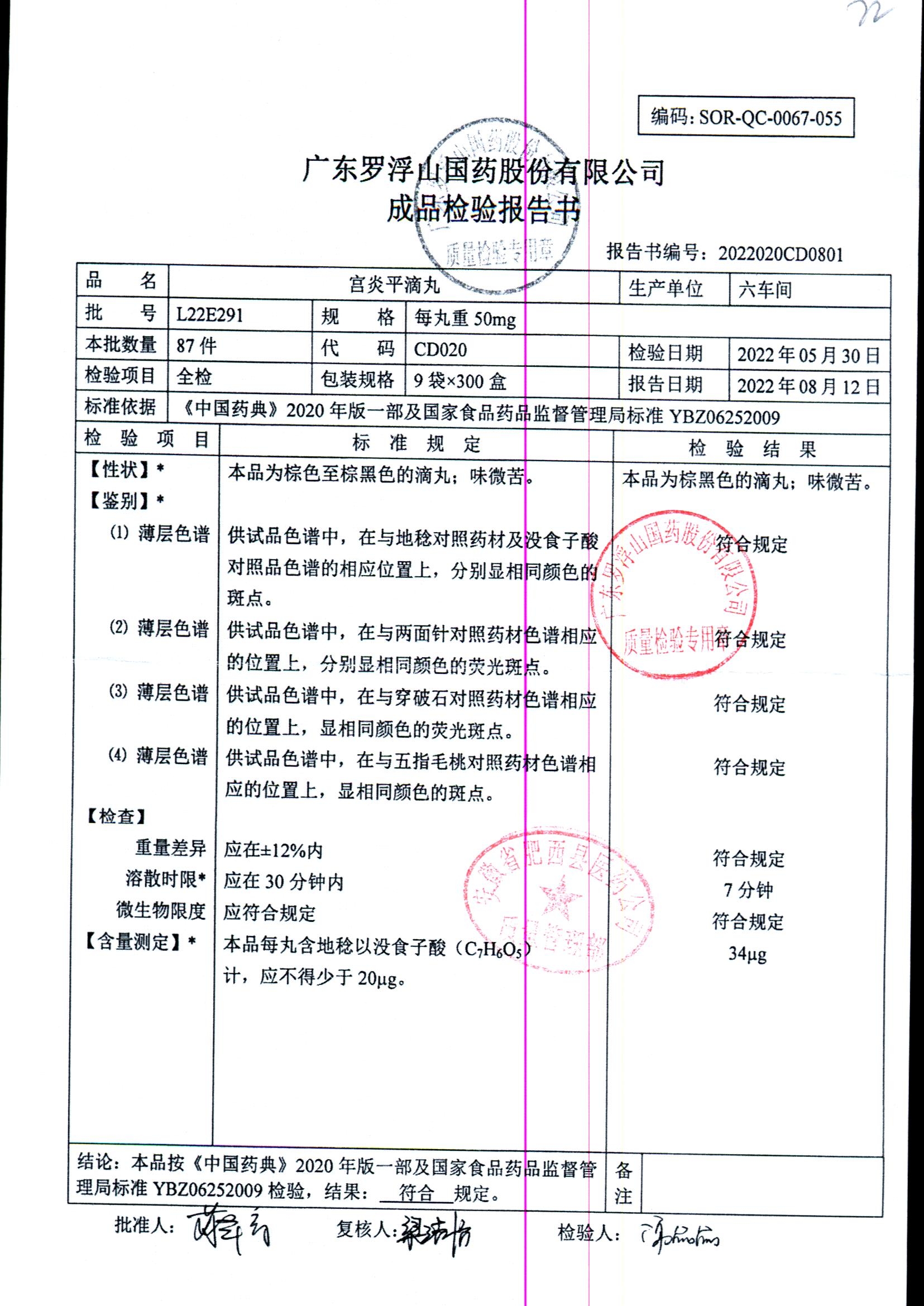 宫炎平滴丸 | 50mg*9袋 | L221111 | 查看详情 |
