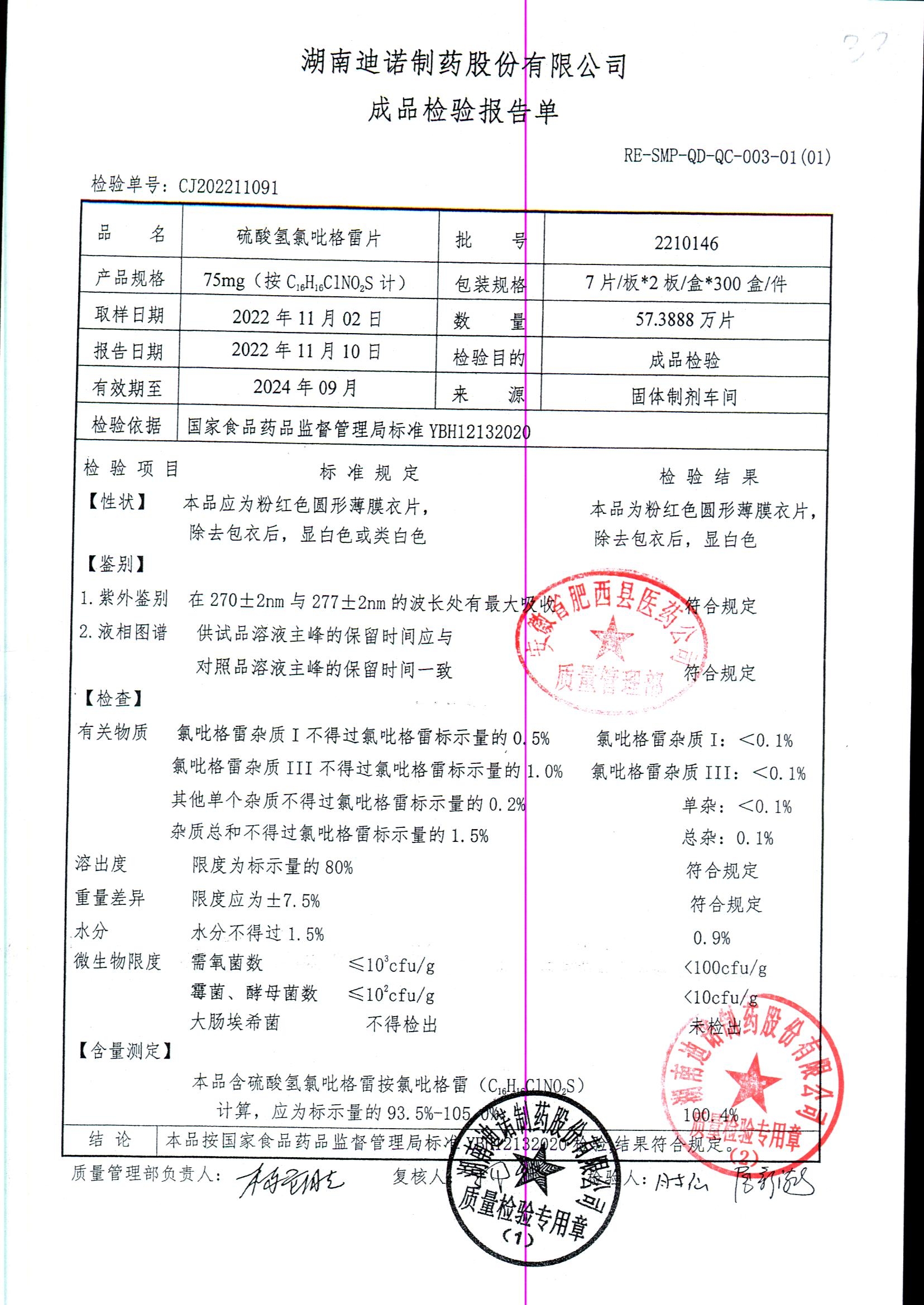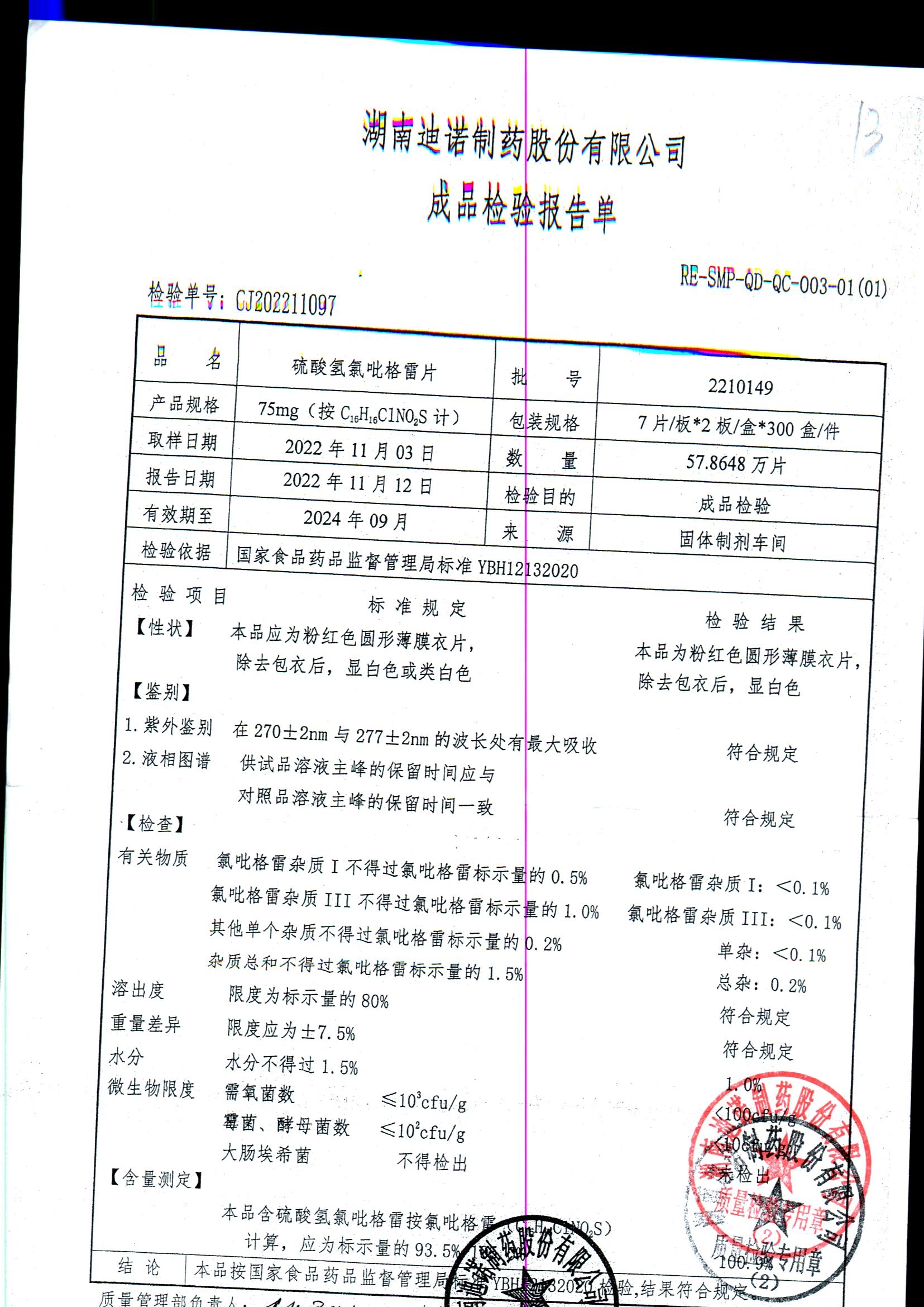 硫酸氢氯吡格雷片 | 75mg:7片*2板 | 2210146 | 查看详情 |