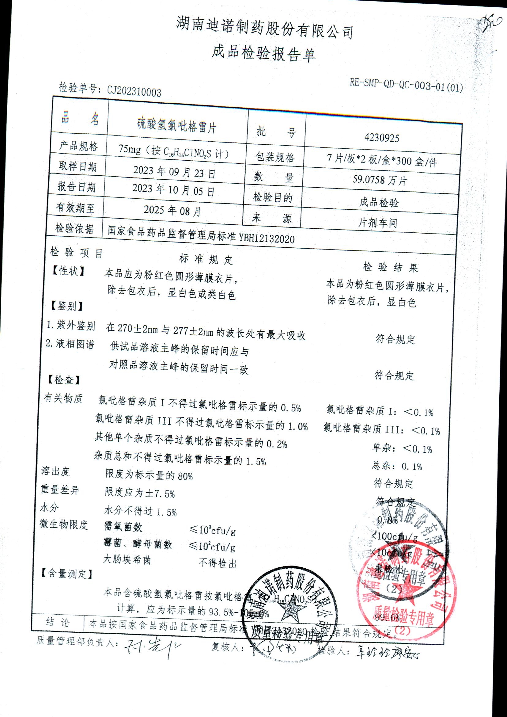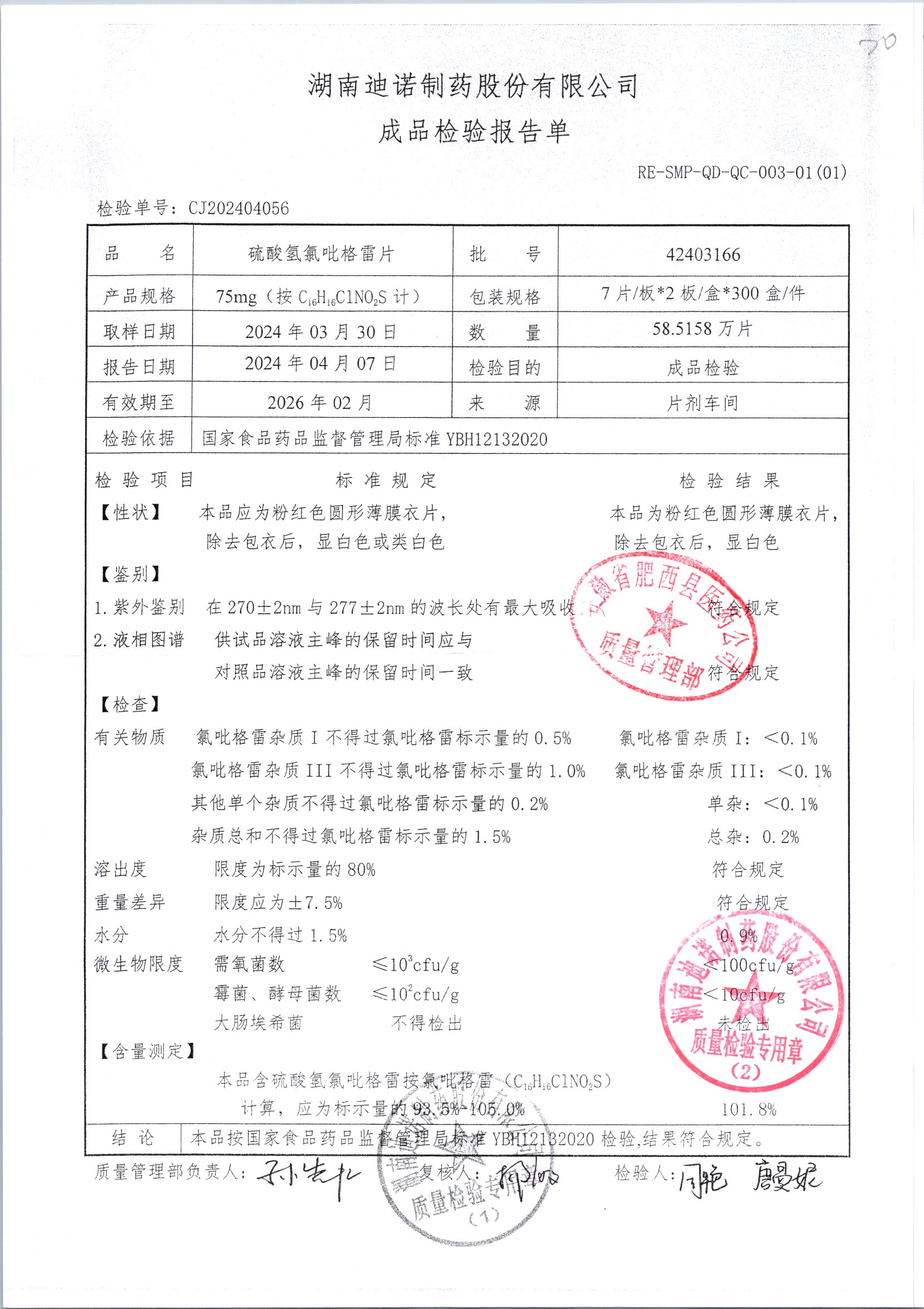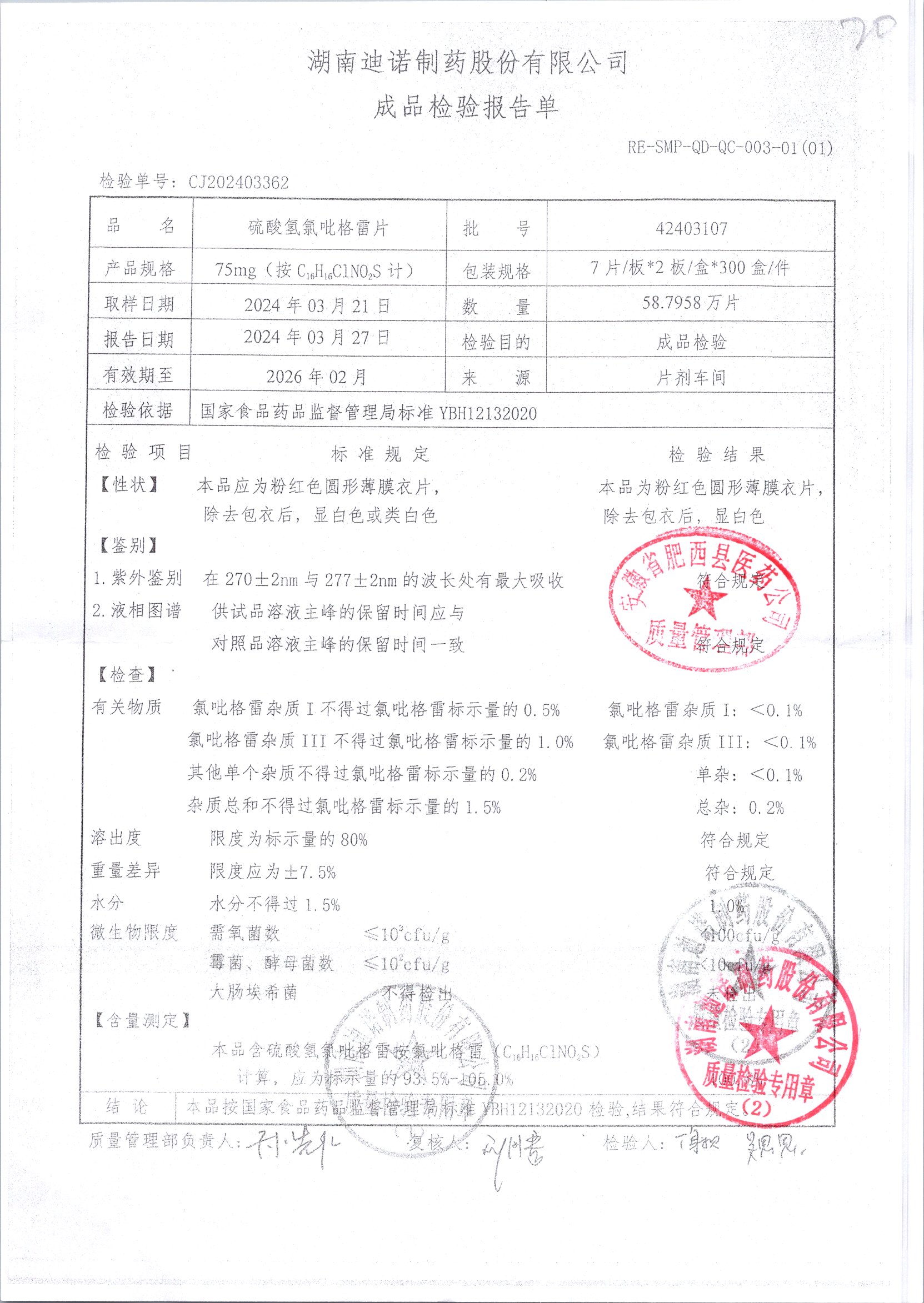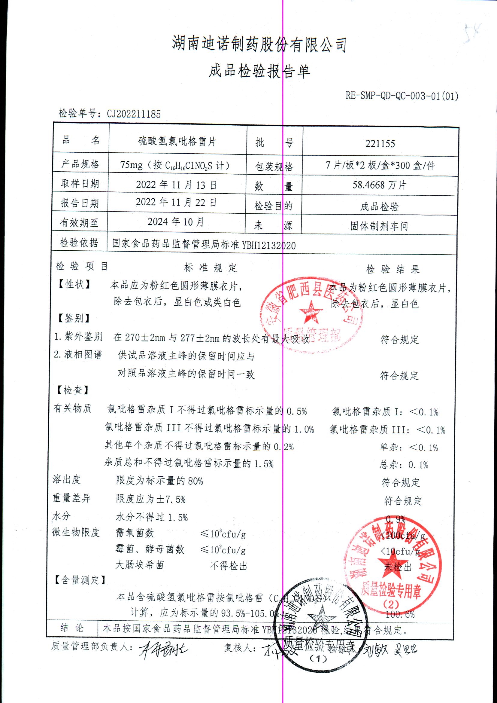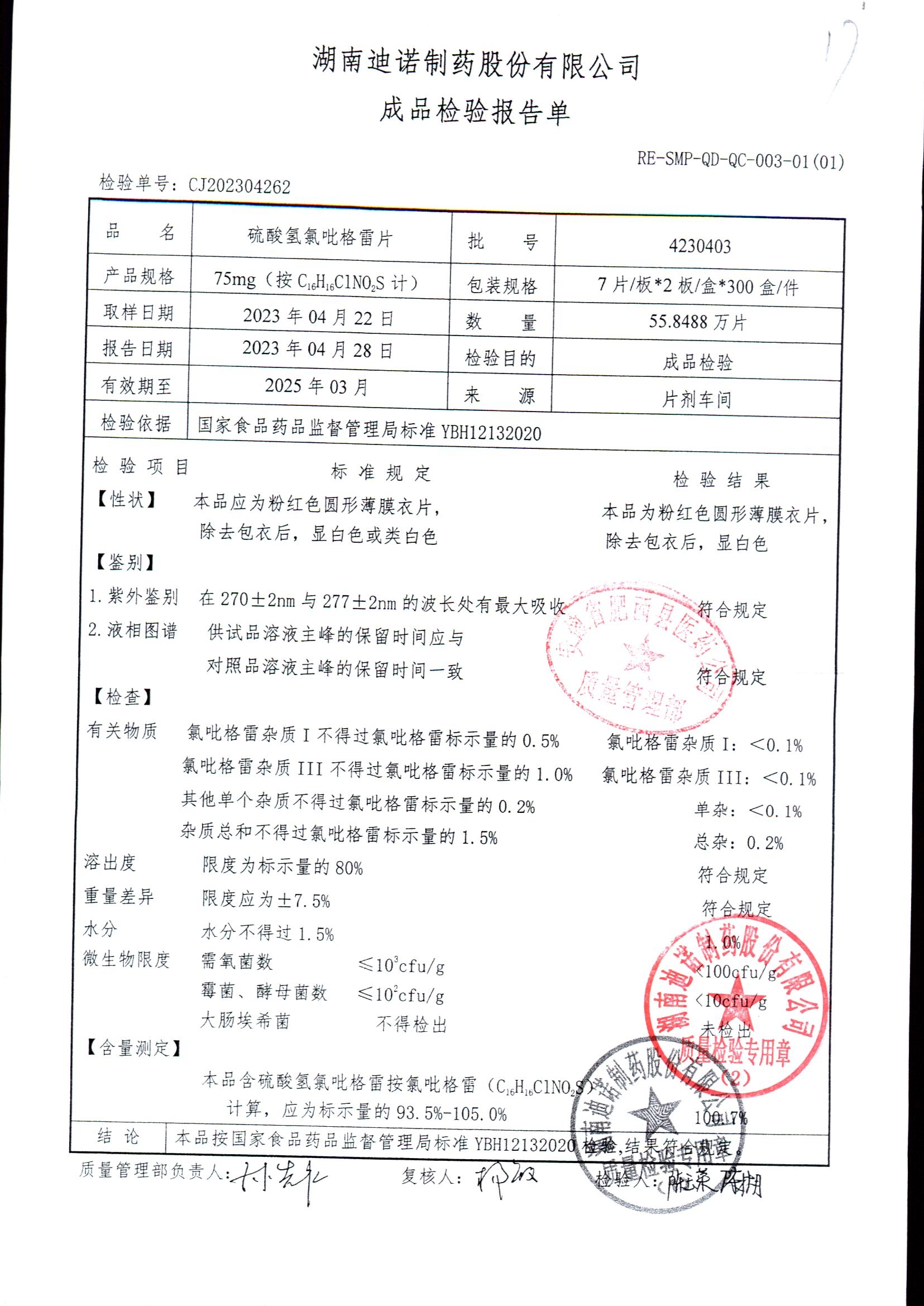 硫酸氢氯吡格雷片 | 75mg:7片*2板 | 221155 | 查看详情 |