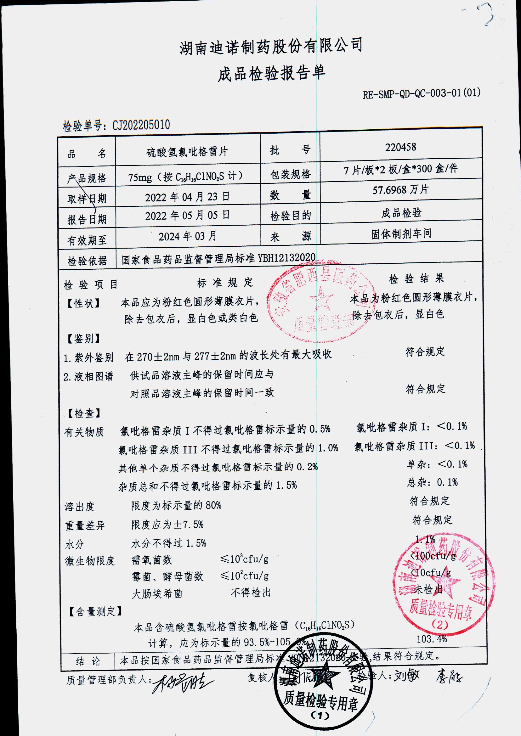 硫酸氢氯吡格雷片 | 75mg:7片*2板 | 220458 | 查看详情 |