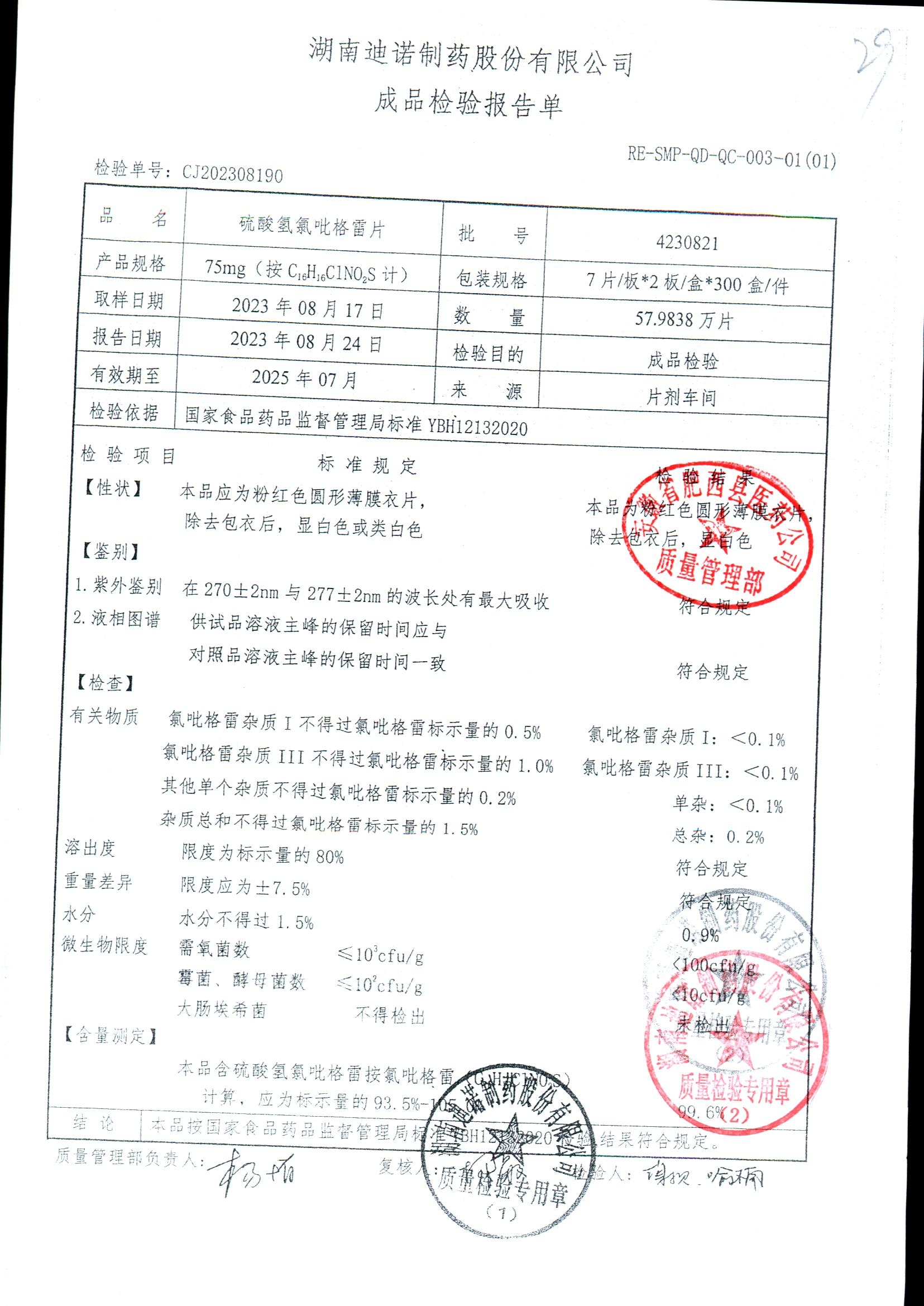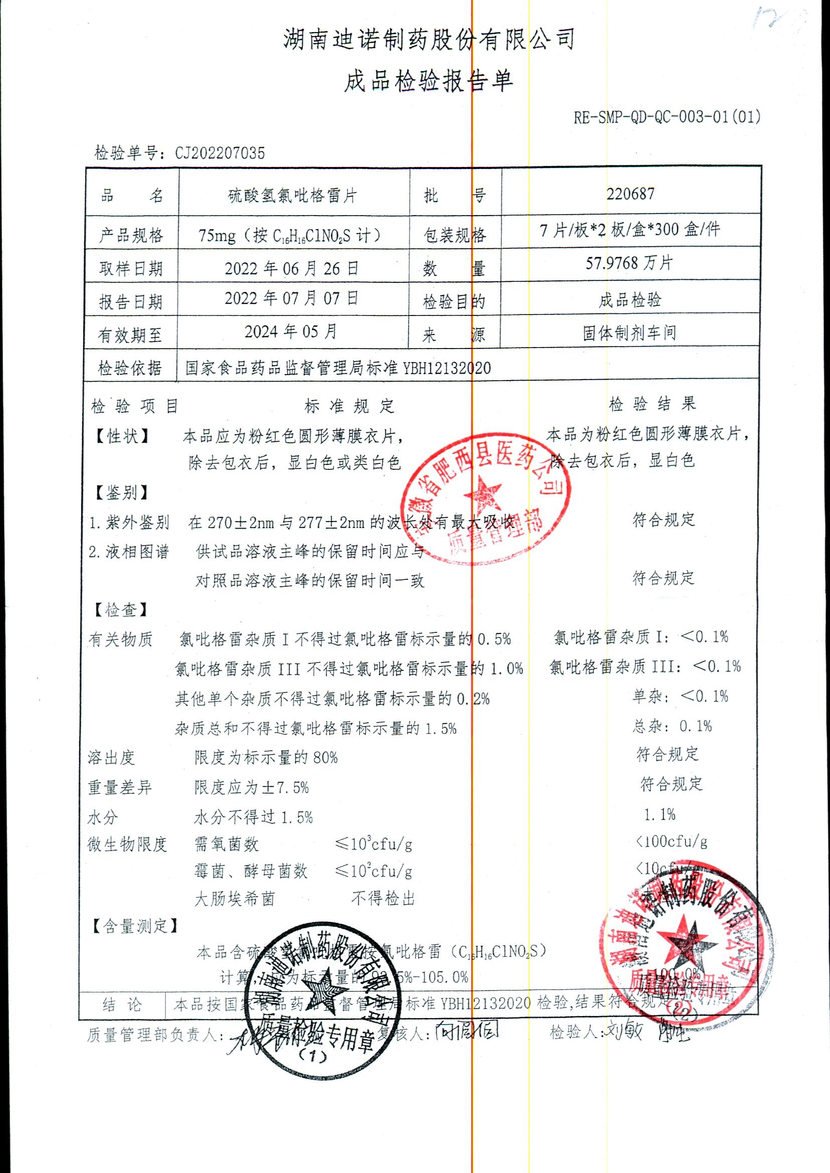 硫酸氢氯吡格雷片 | 75mg:7片*2板 | 220687 | 查看详情 |