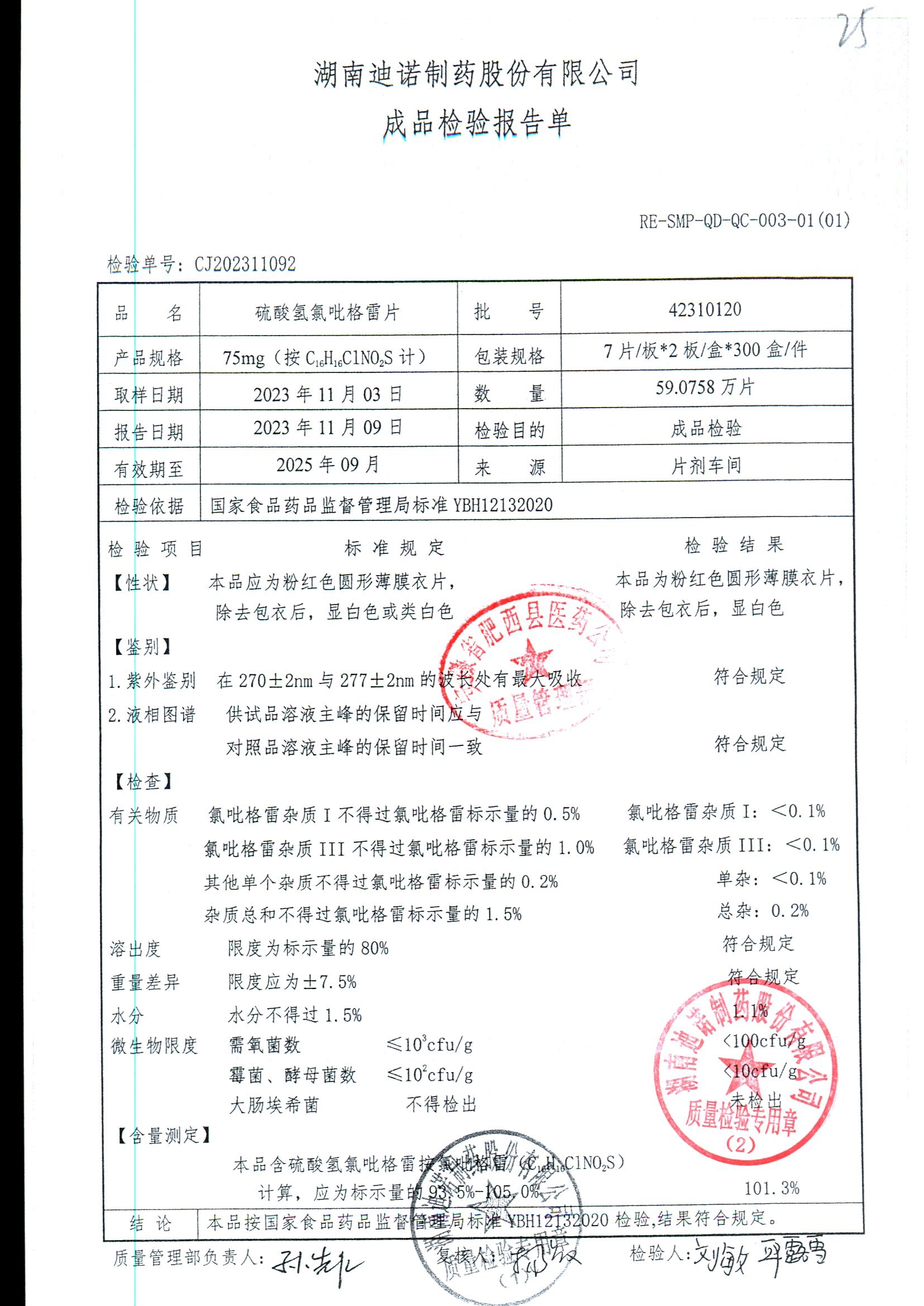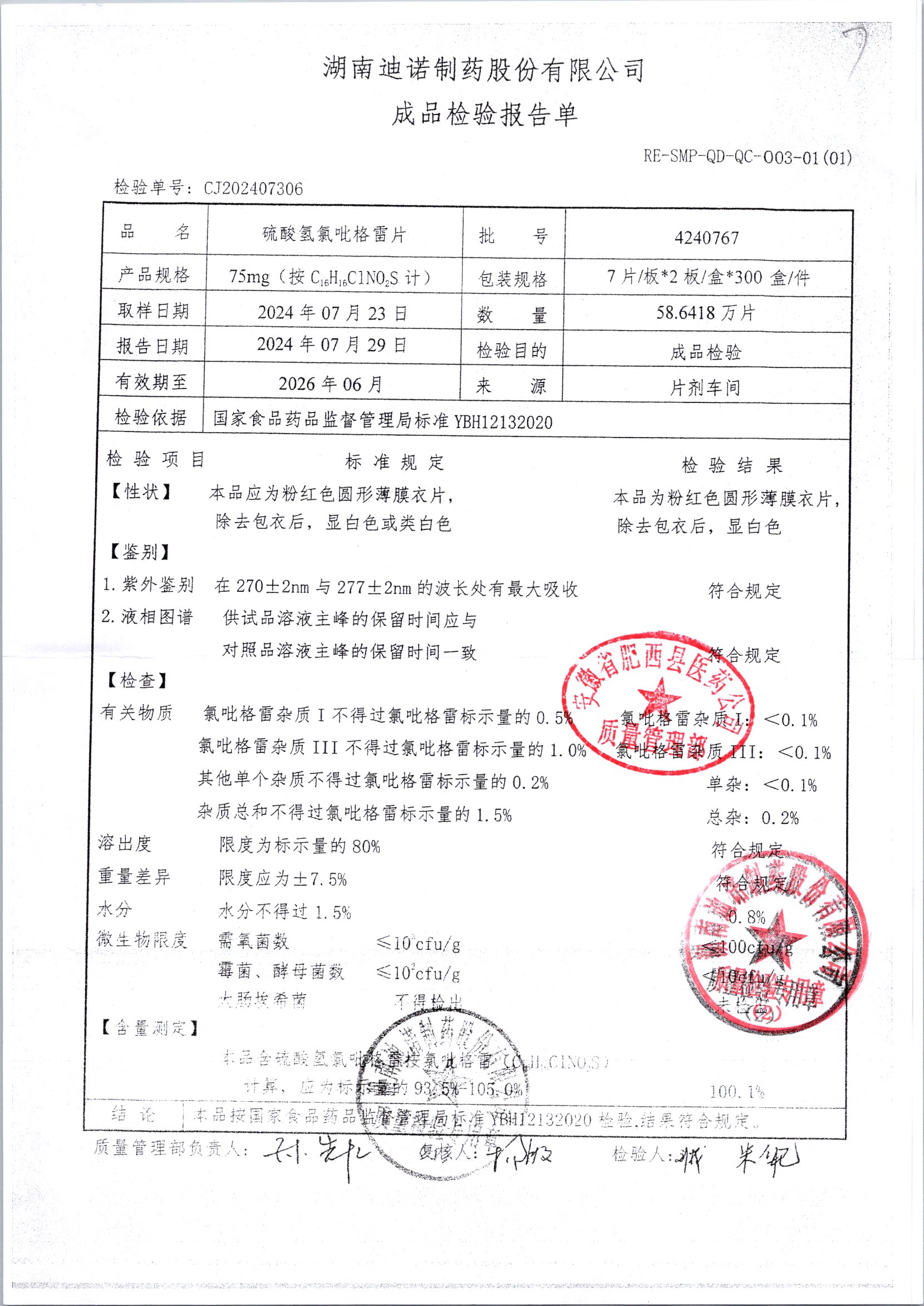 硫酸氢氯吡格雷片 | 75mg:7片*2板 | 42310120 | 查看详情 |