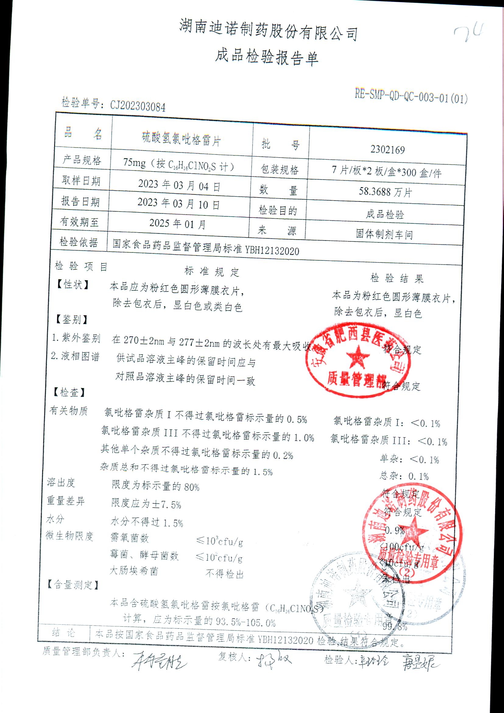 硫酸氢氯吡格雷片 | 75mg:7片*2板 | 230261 | 查看详情 |