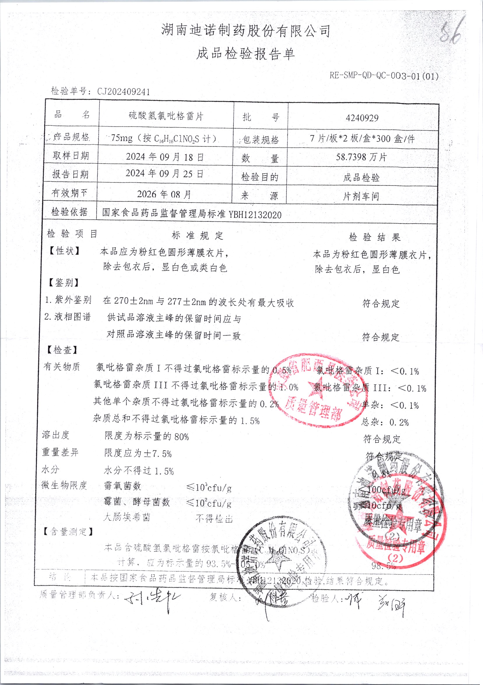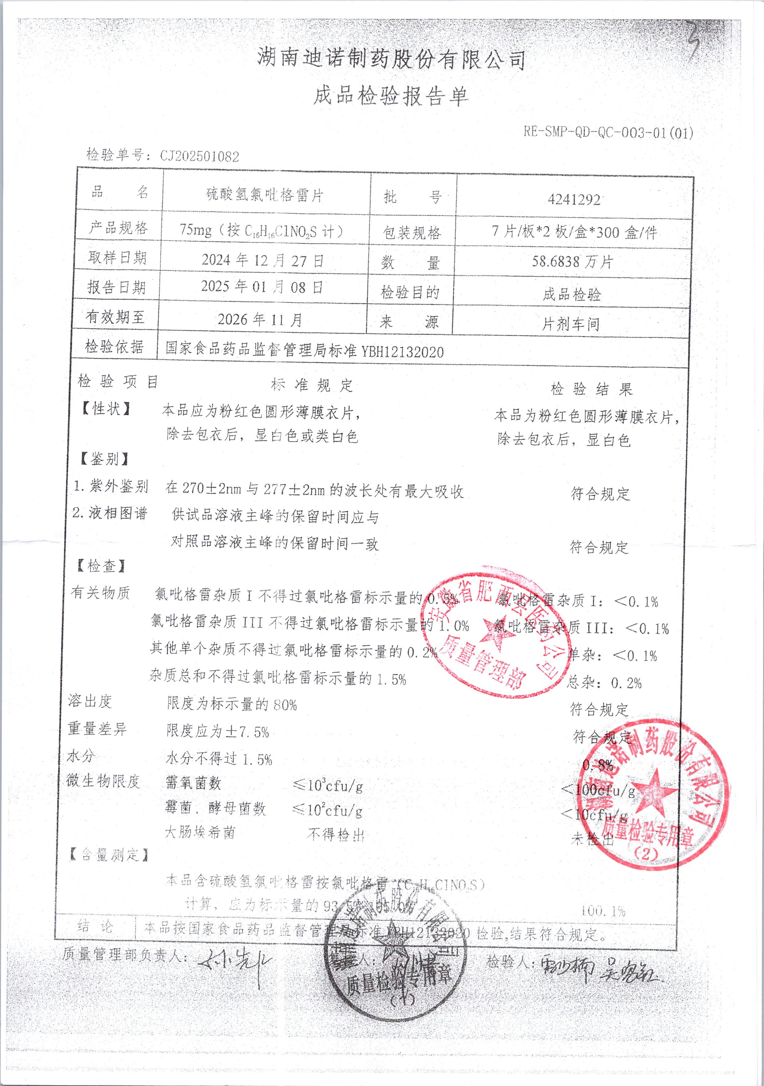 硫酸氢氯吡格雷片 | 75mg:7片*2板 | 4250107 | 查看详情 |