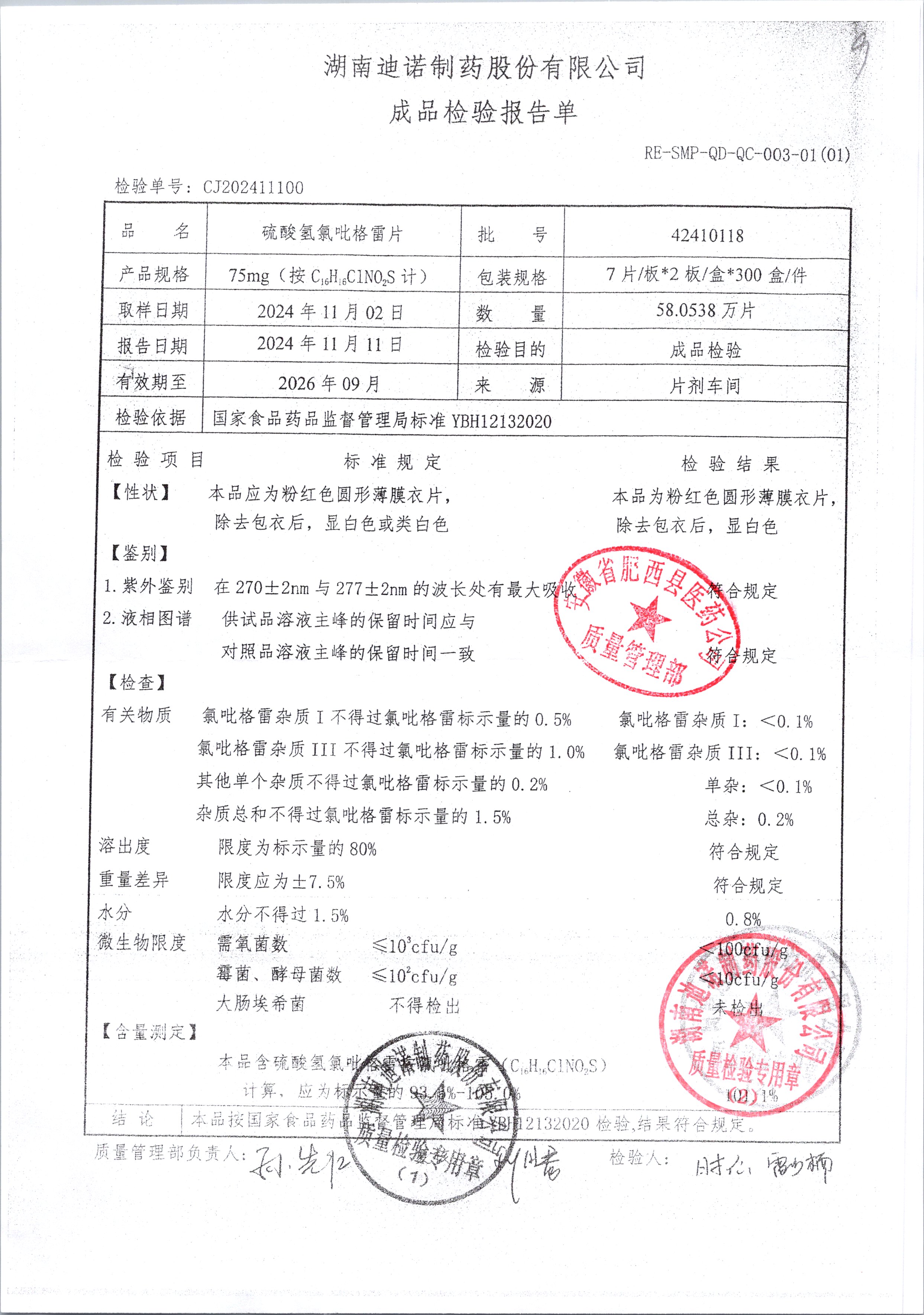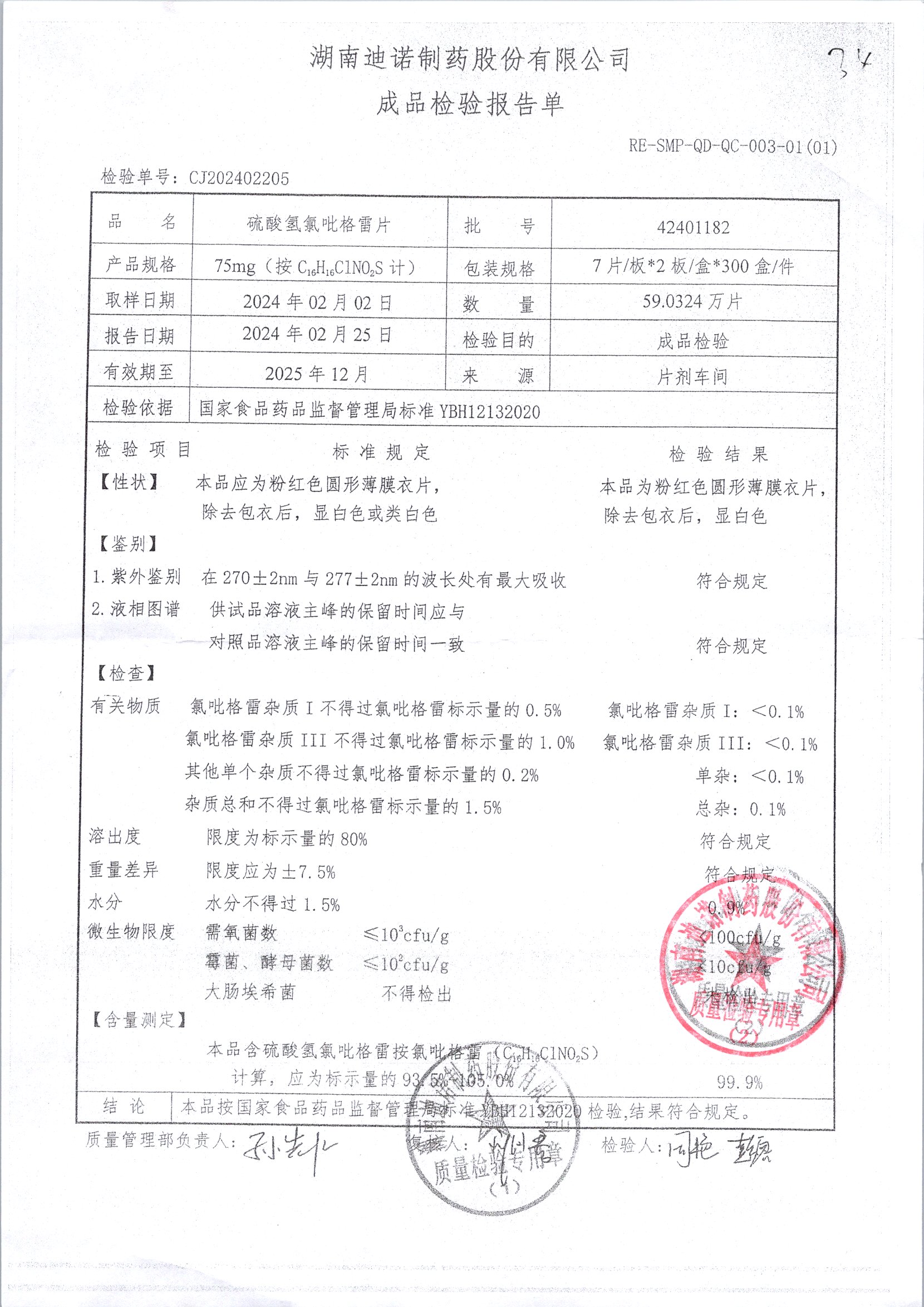 硫酸氢氯吡格雷片 | 75mg:7片*2板 | DB2241002 | 查看详情 |