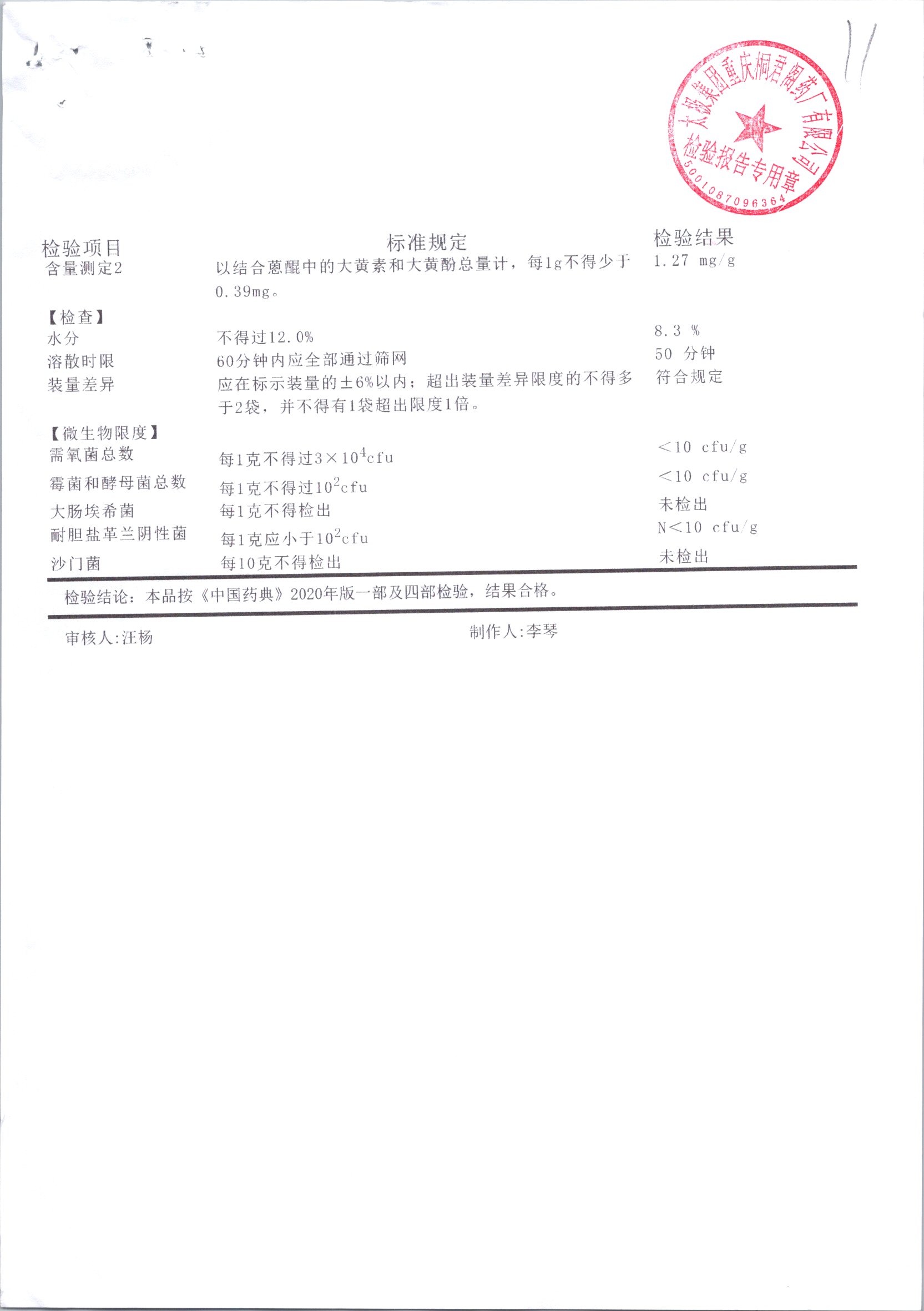 名称 | 规格 | 批号 | 药检报告 |