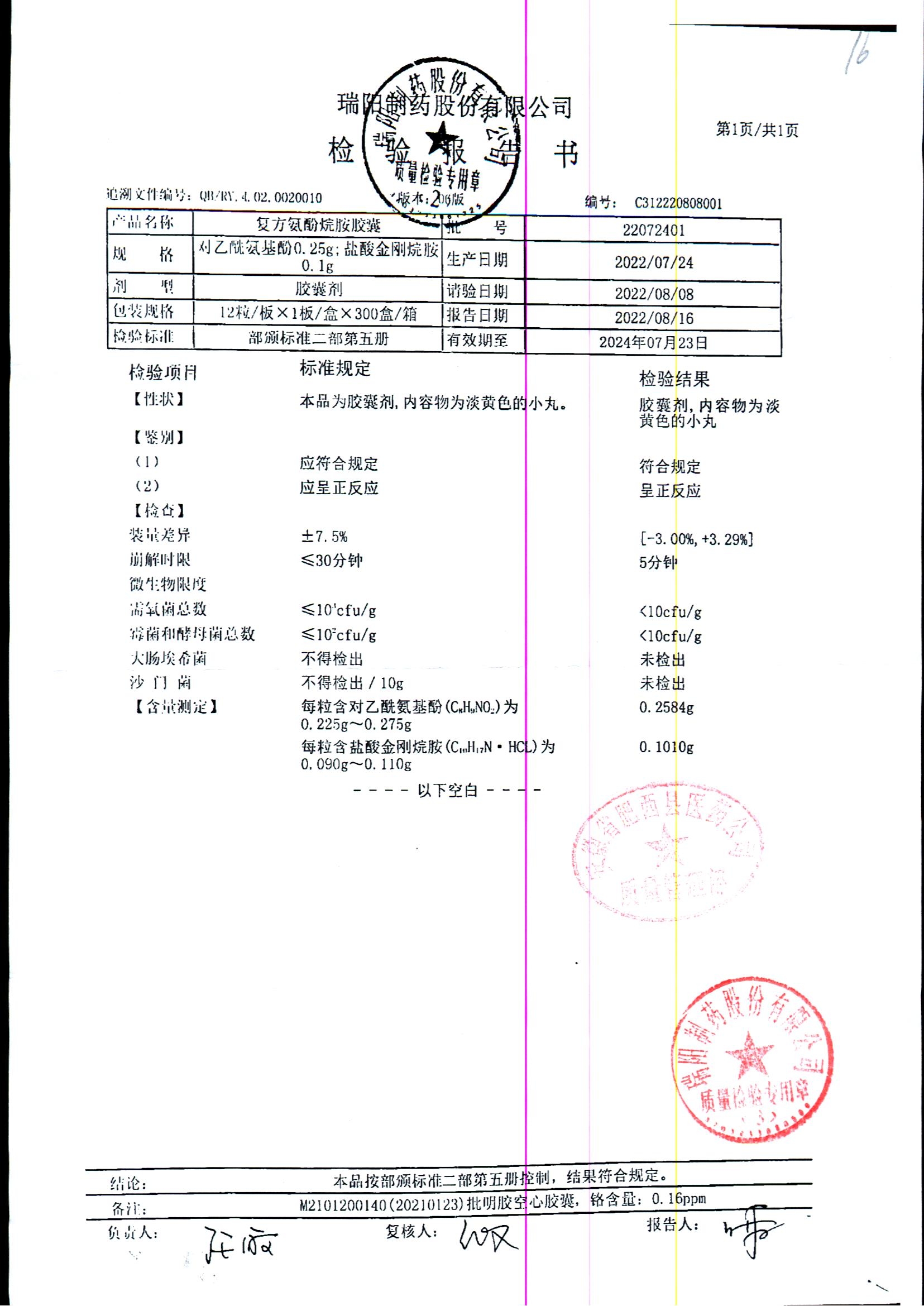 复方氨酚烷胺胶囊 | 0.25g:0.1g*12粒 | 22072401 | 查看详情 |