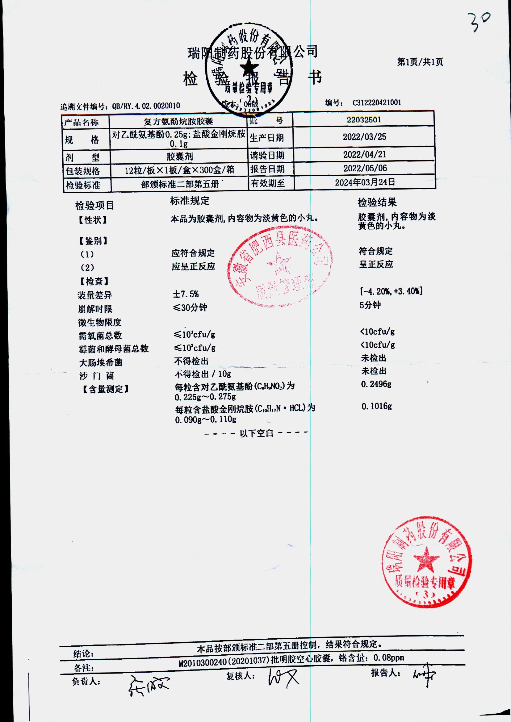 复方氨酚烷胺胶囊 | 0.25g:0.1g*12粒 | 22032501 | 查看详情 |