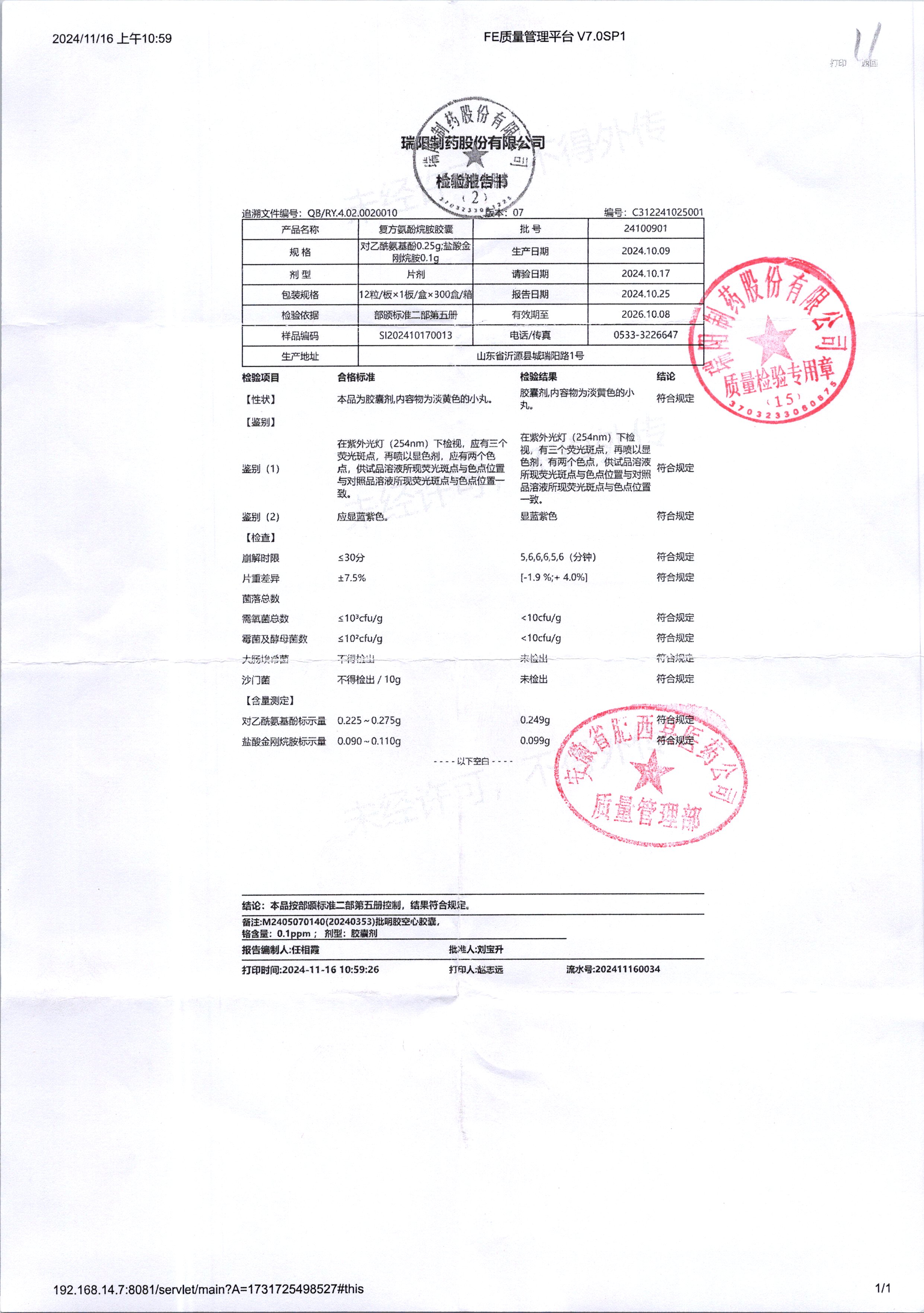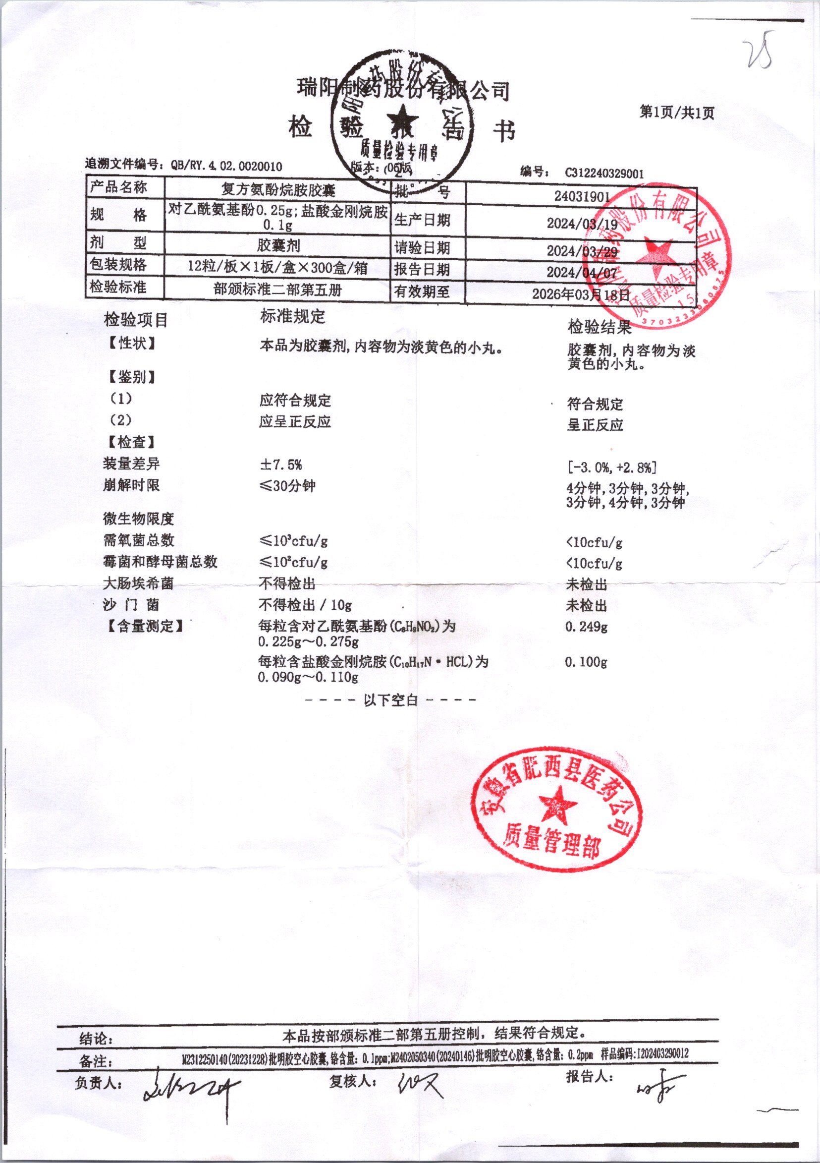 复方氨酚烷胺胶囊 | 0.25g:0.1g*12粒 | 24031901 | 查看详情 |