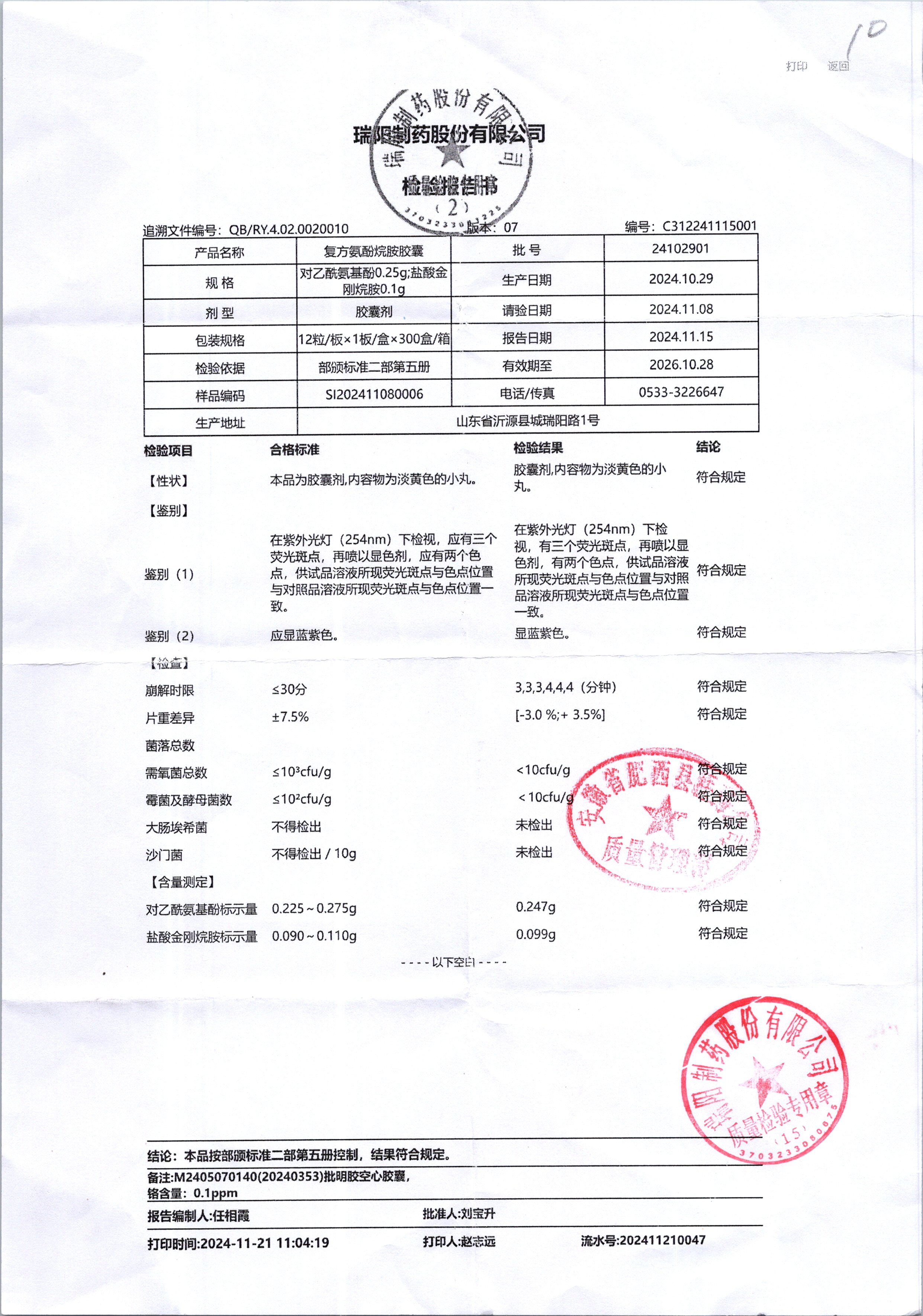 复方氨酚烷胺胶囊 | 0.25g:0.1g*12粒 | 24121801 | 查看详情 |