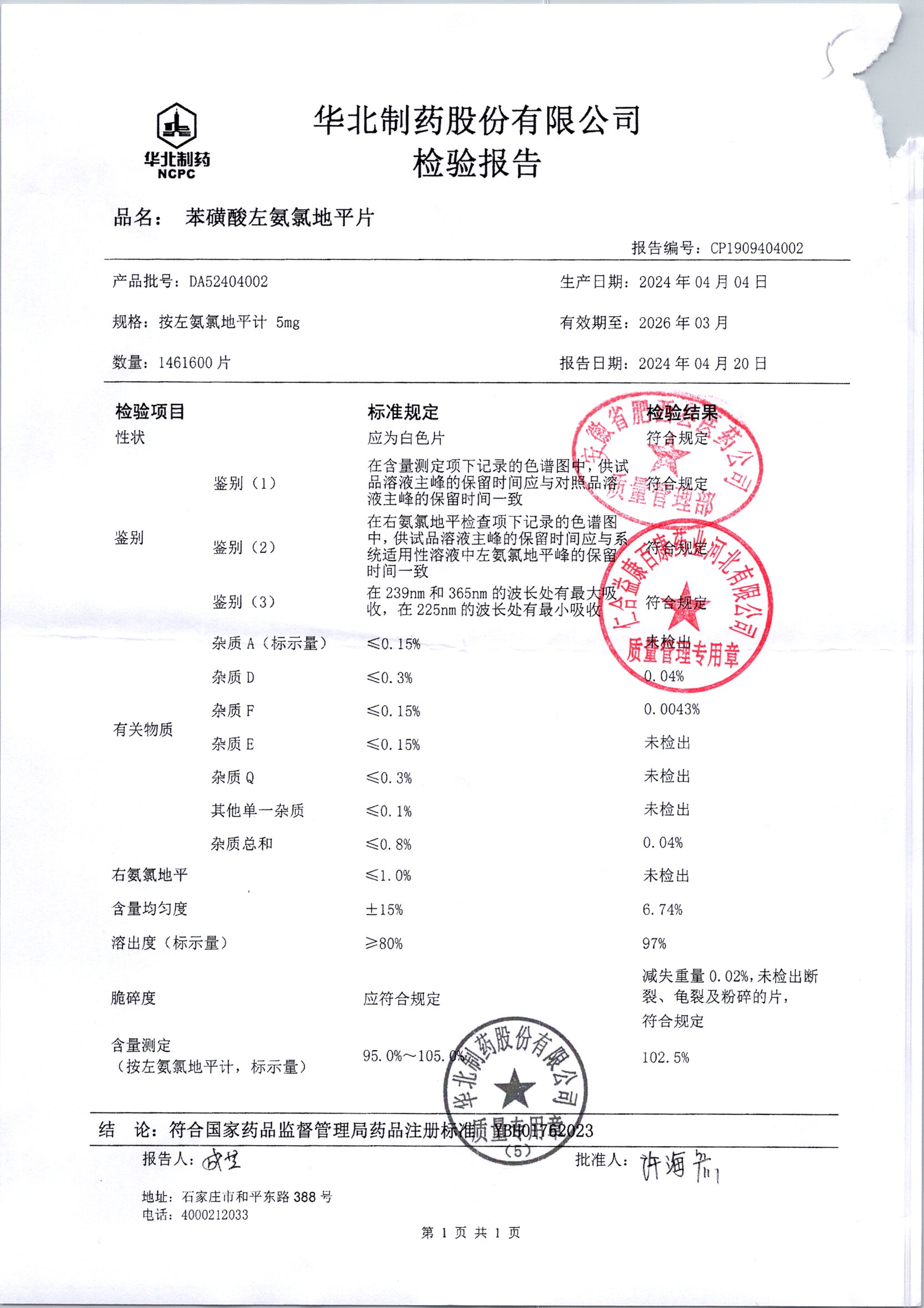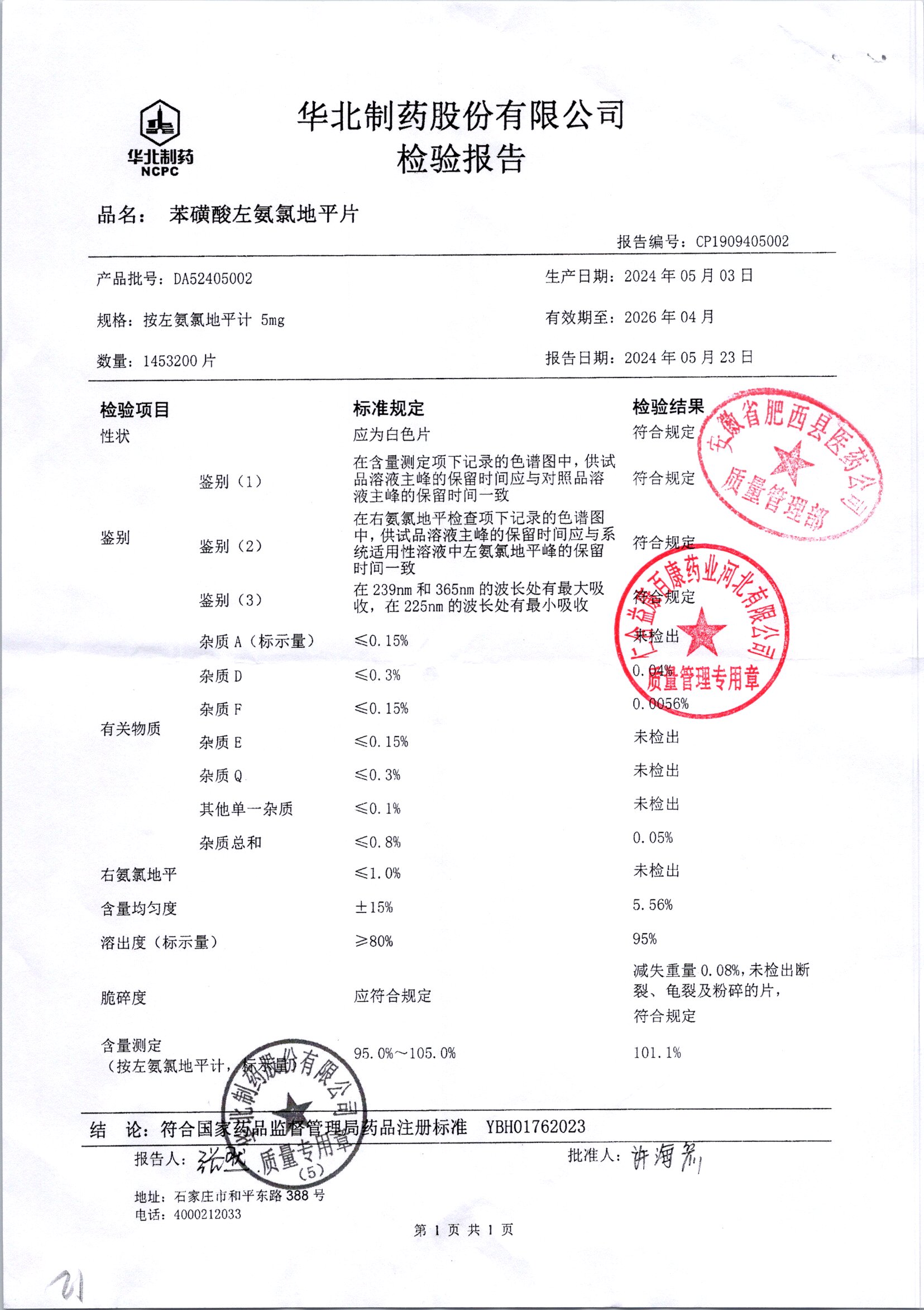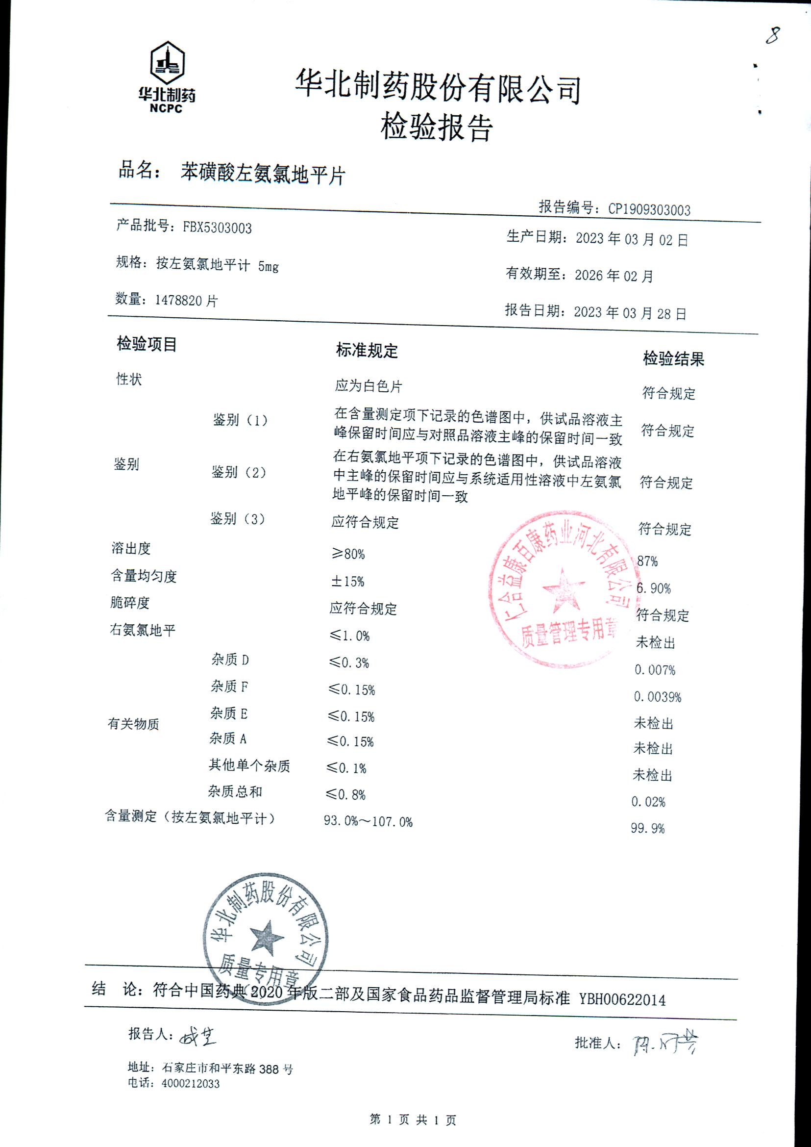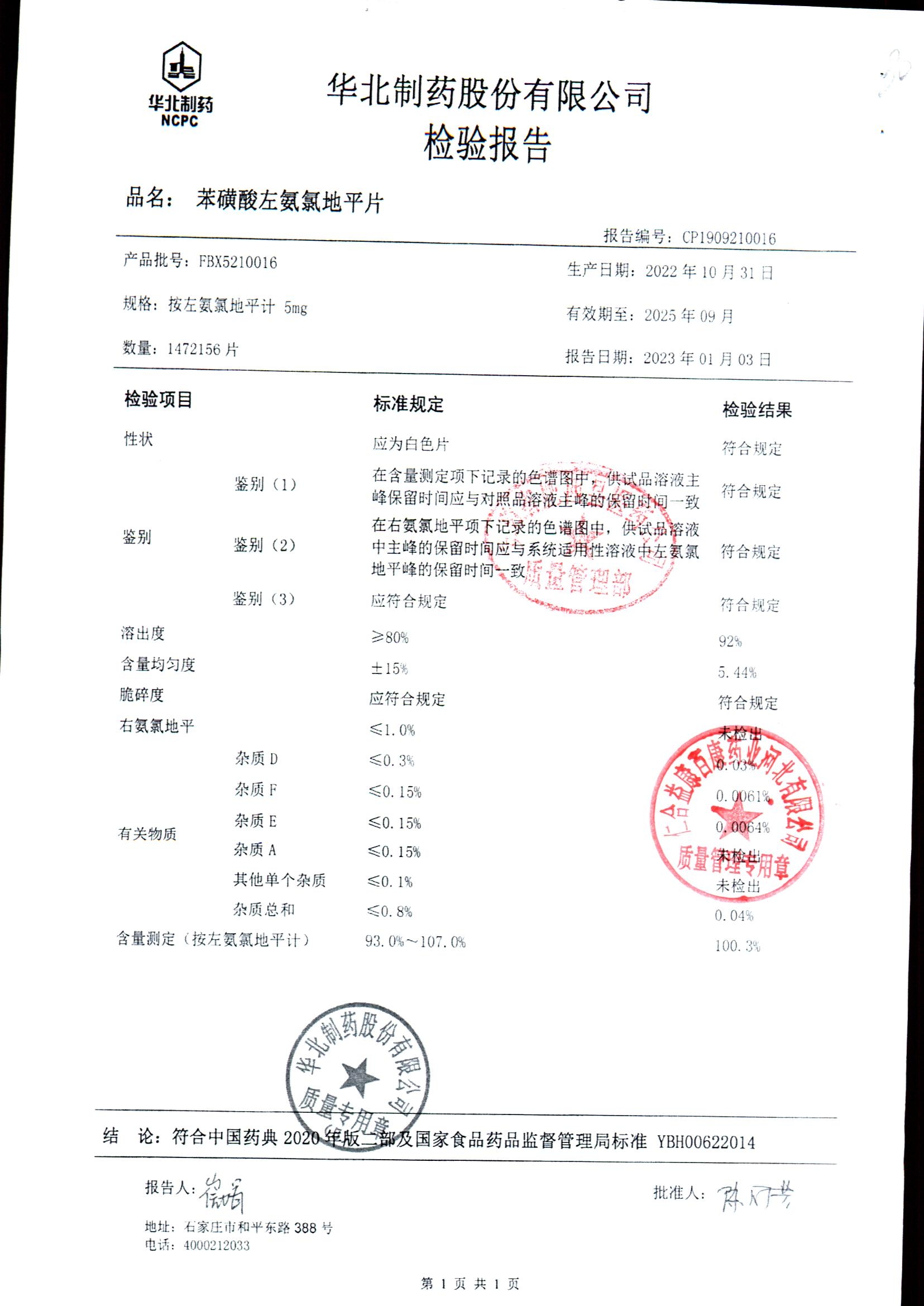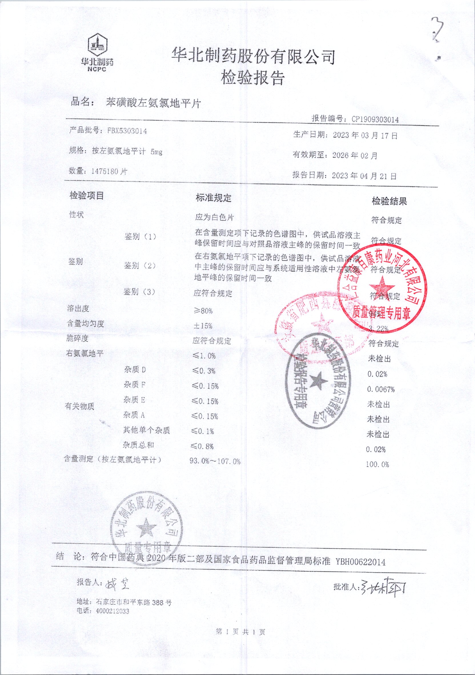 苯磺酸左氨氯地平片 | 5mg | BX52405003 | 查看详情 |