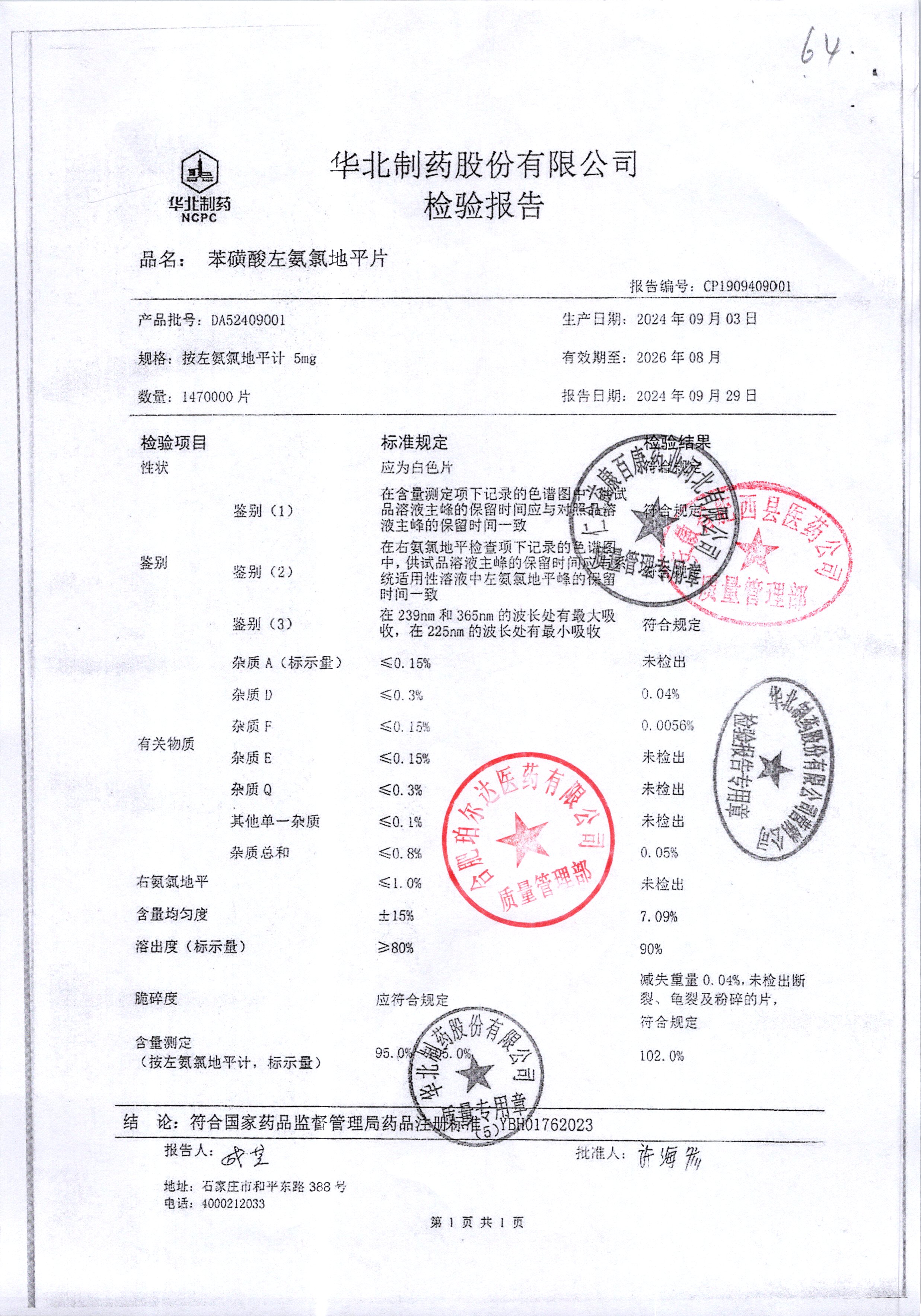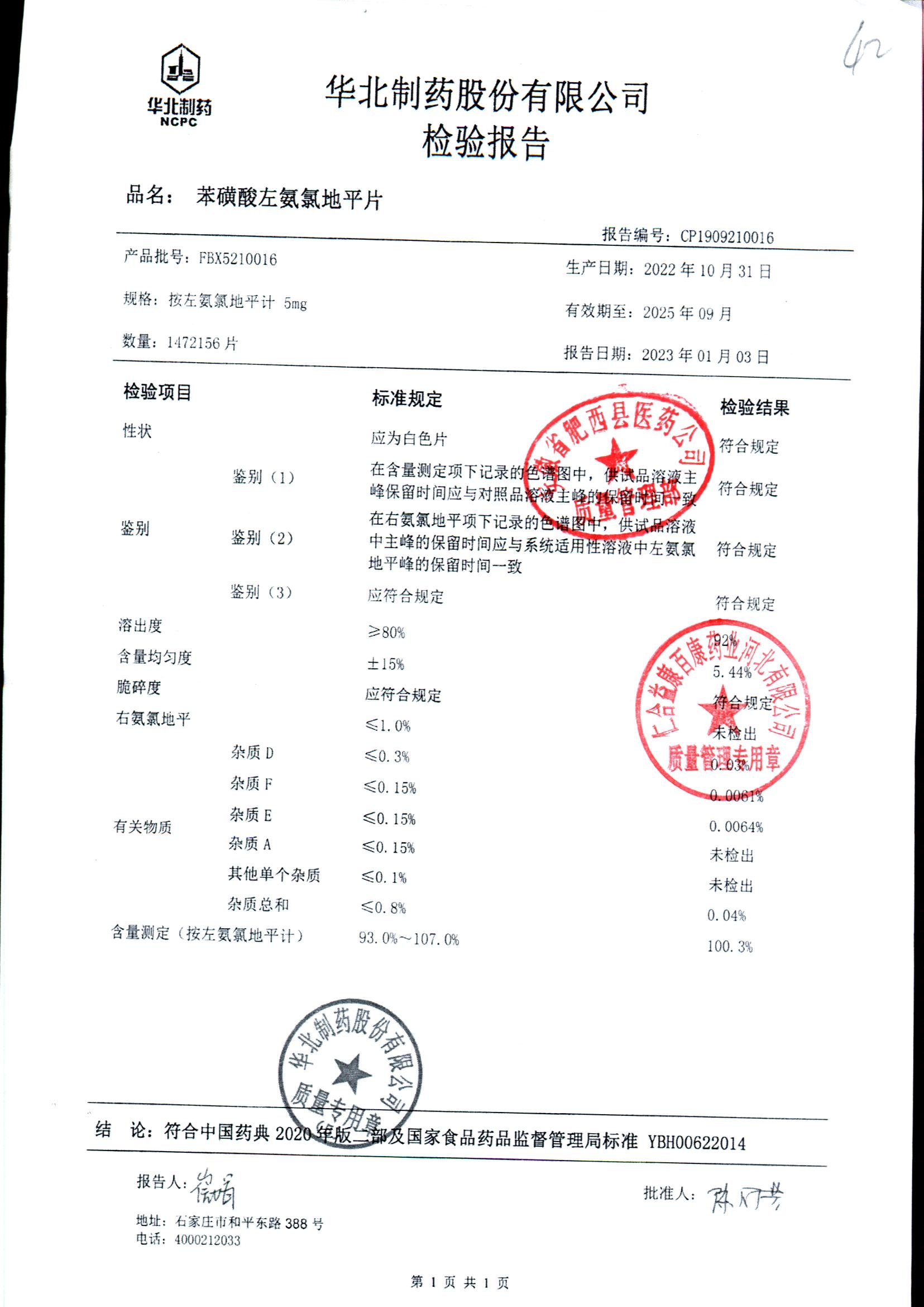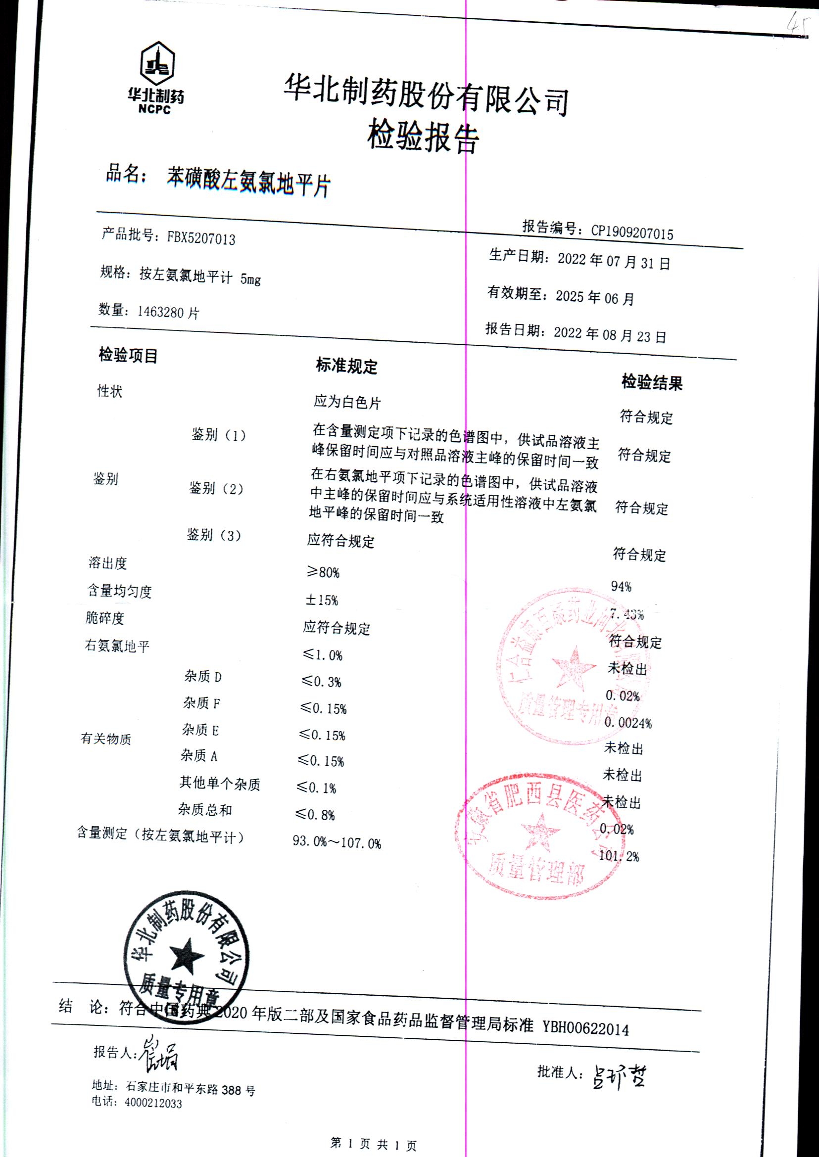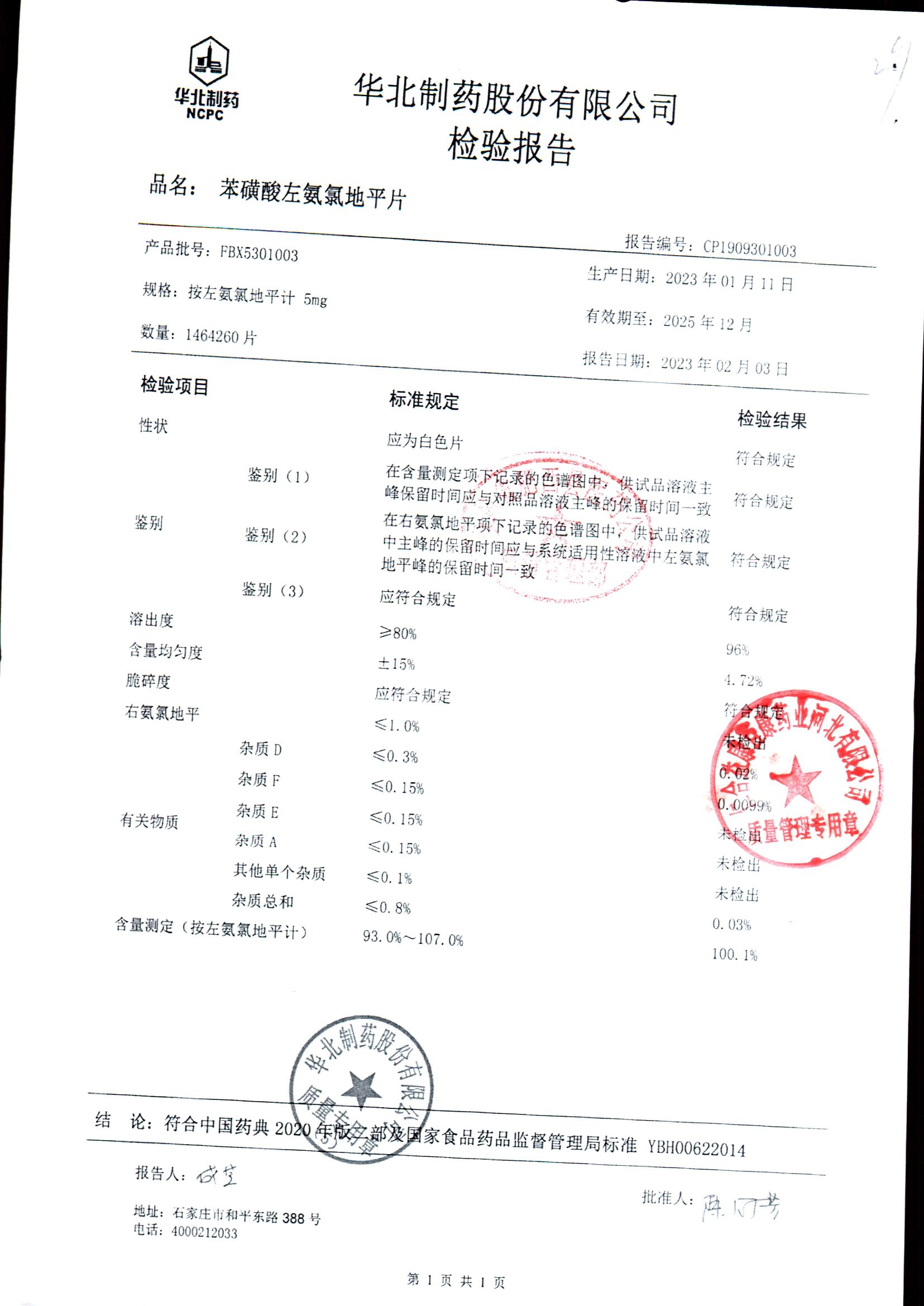 苯磺酸左氨氯地平片 | 5mg | BX52405003 | 查看详情 |