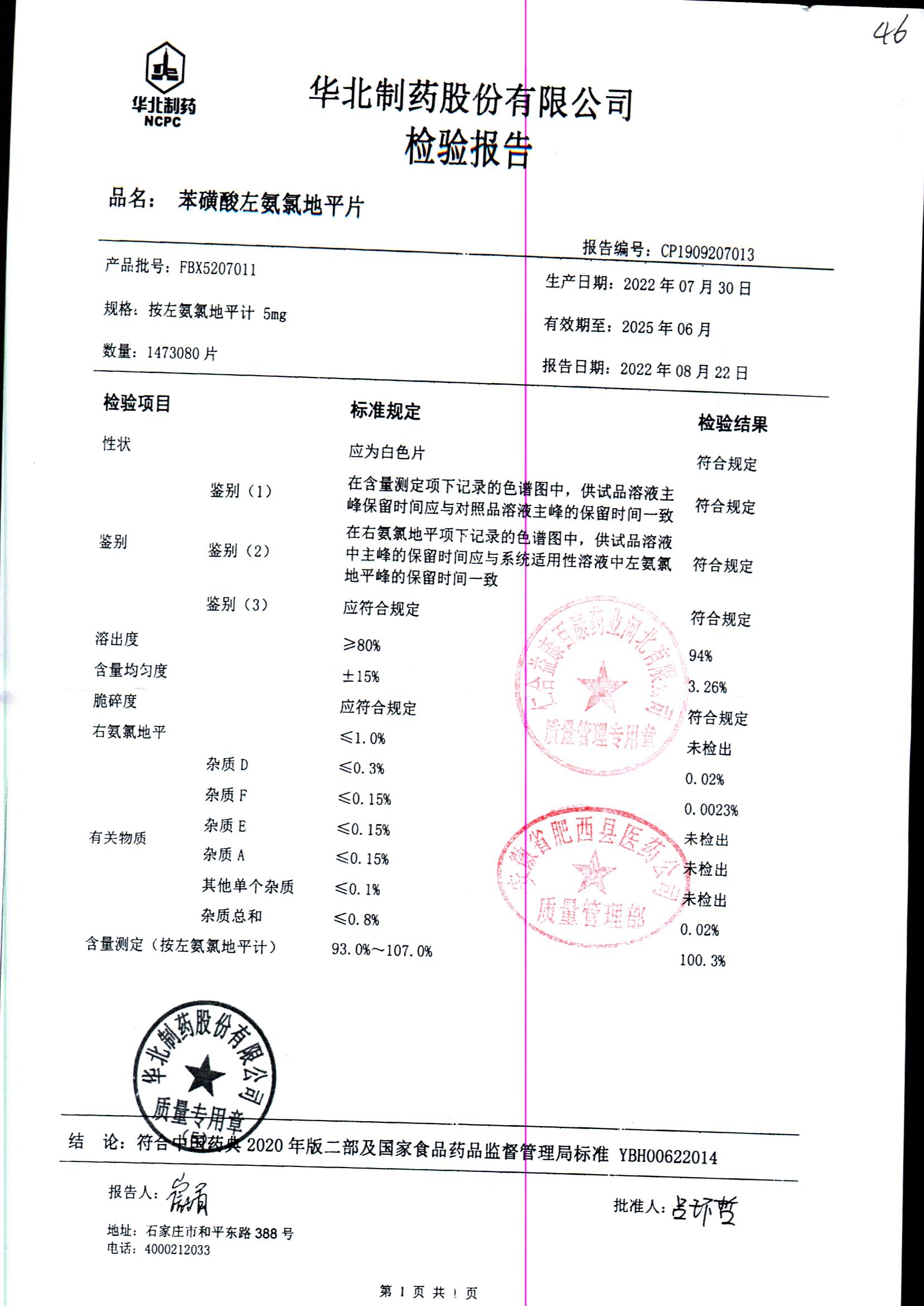苯磺酸左氨氯地平片 | 5mg | FBX5210014 | 查看详情 |