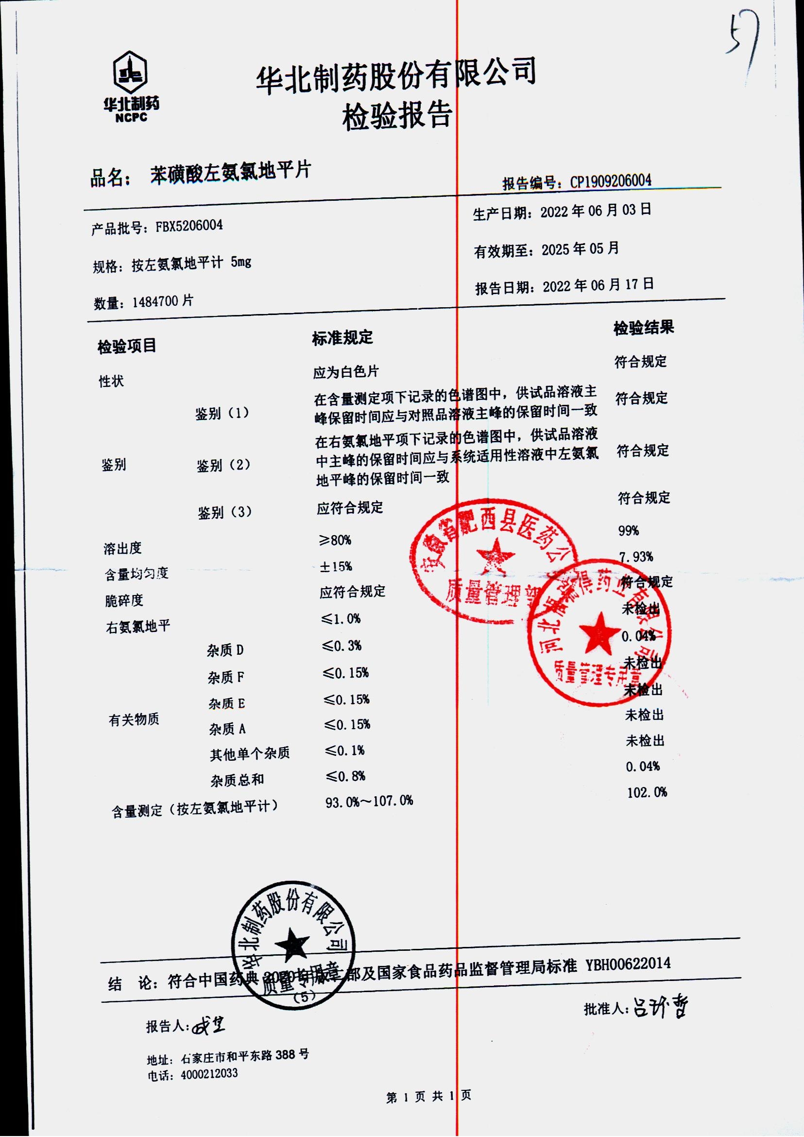苯磺酸左氨氯地平片 | 5mg | FBX5206004 | 查看详情 |