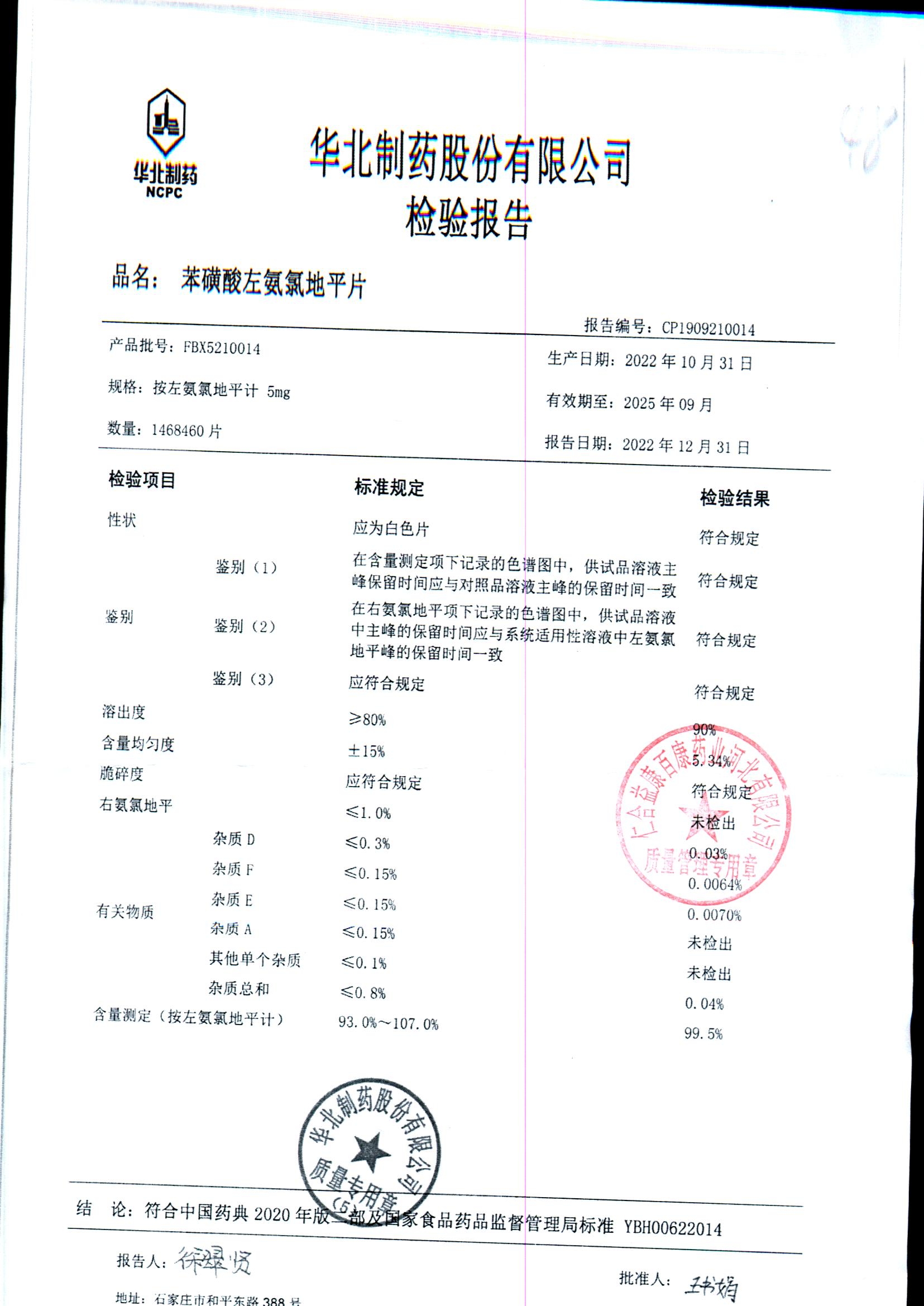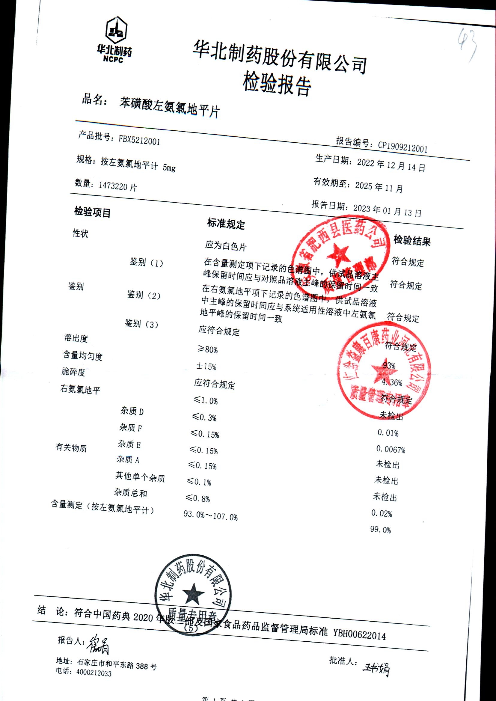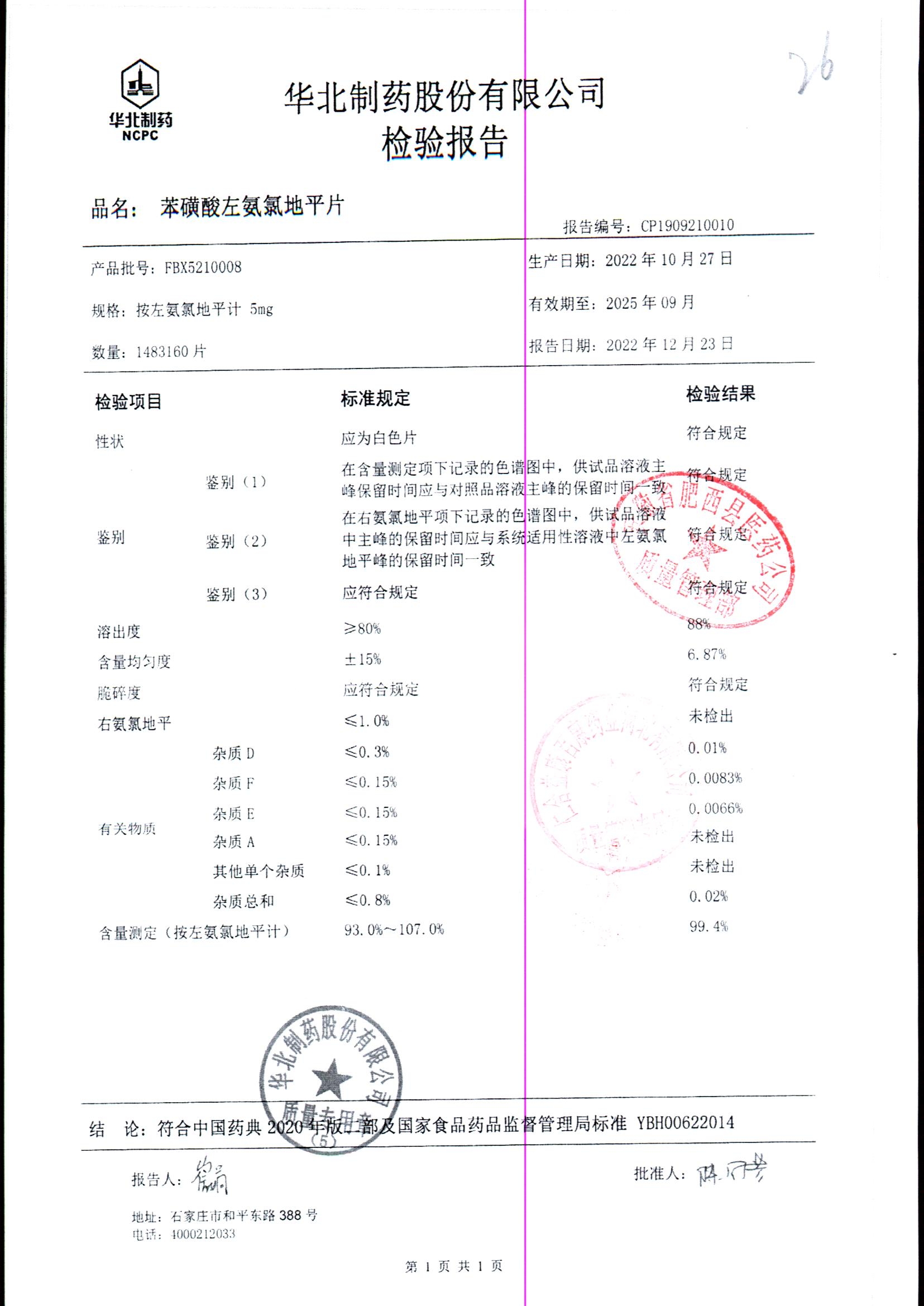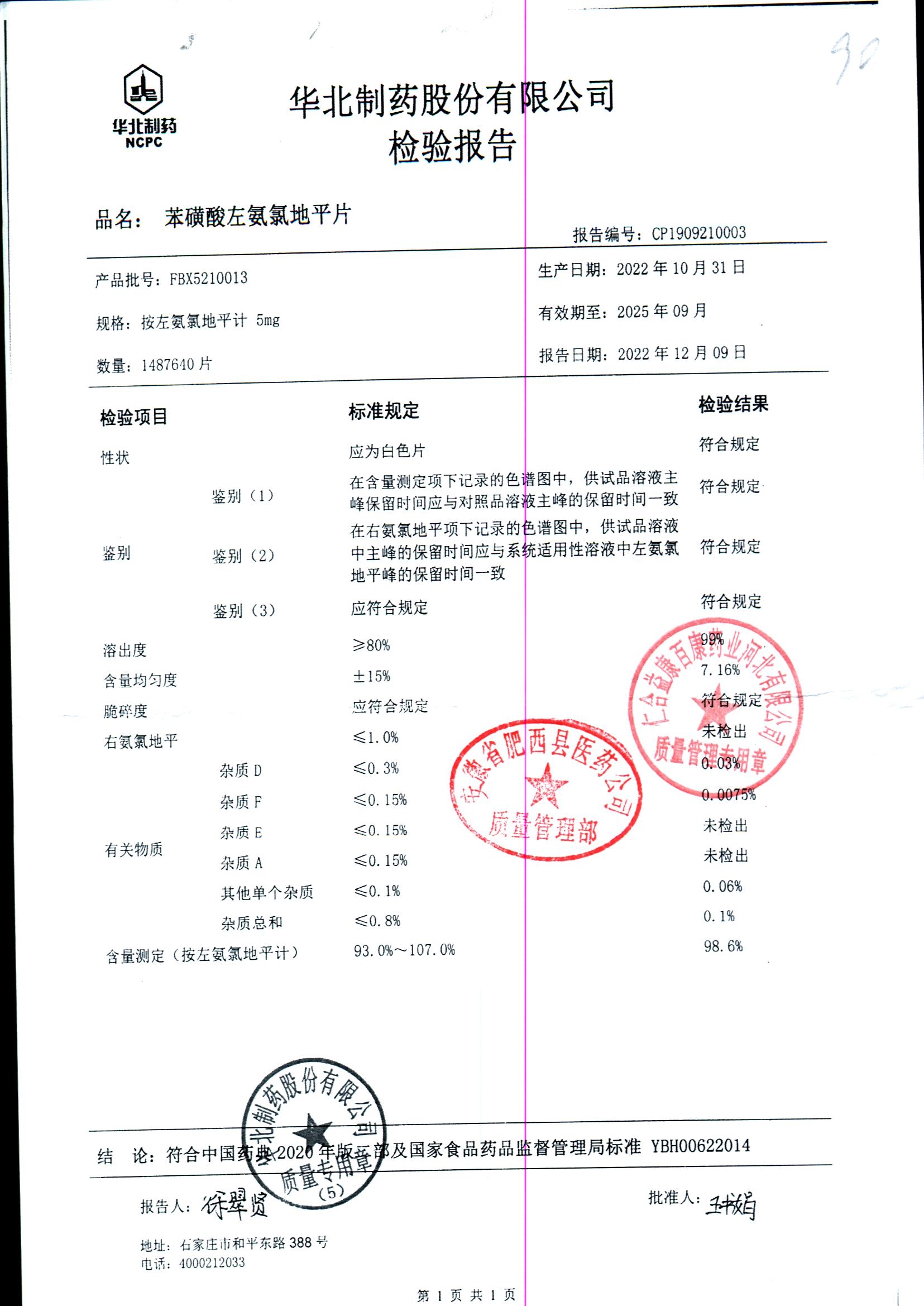 苯磺酸左氨氯地平片 | 5mg | FBX5210016 | 查看详情 |