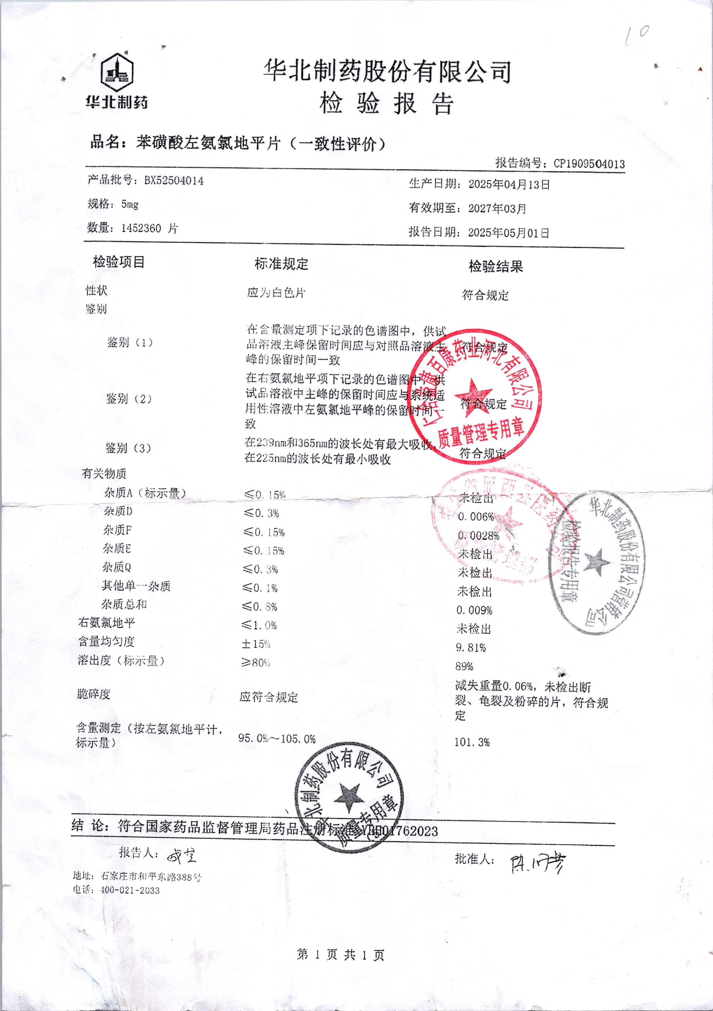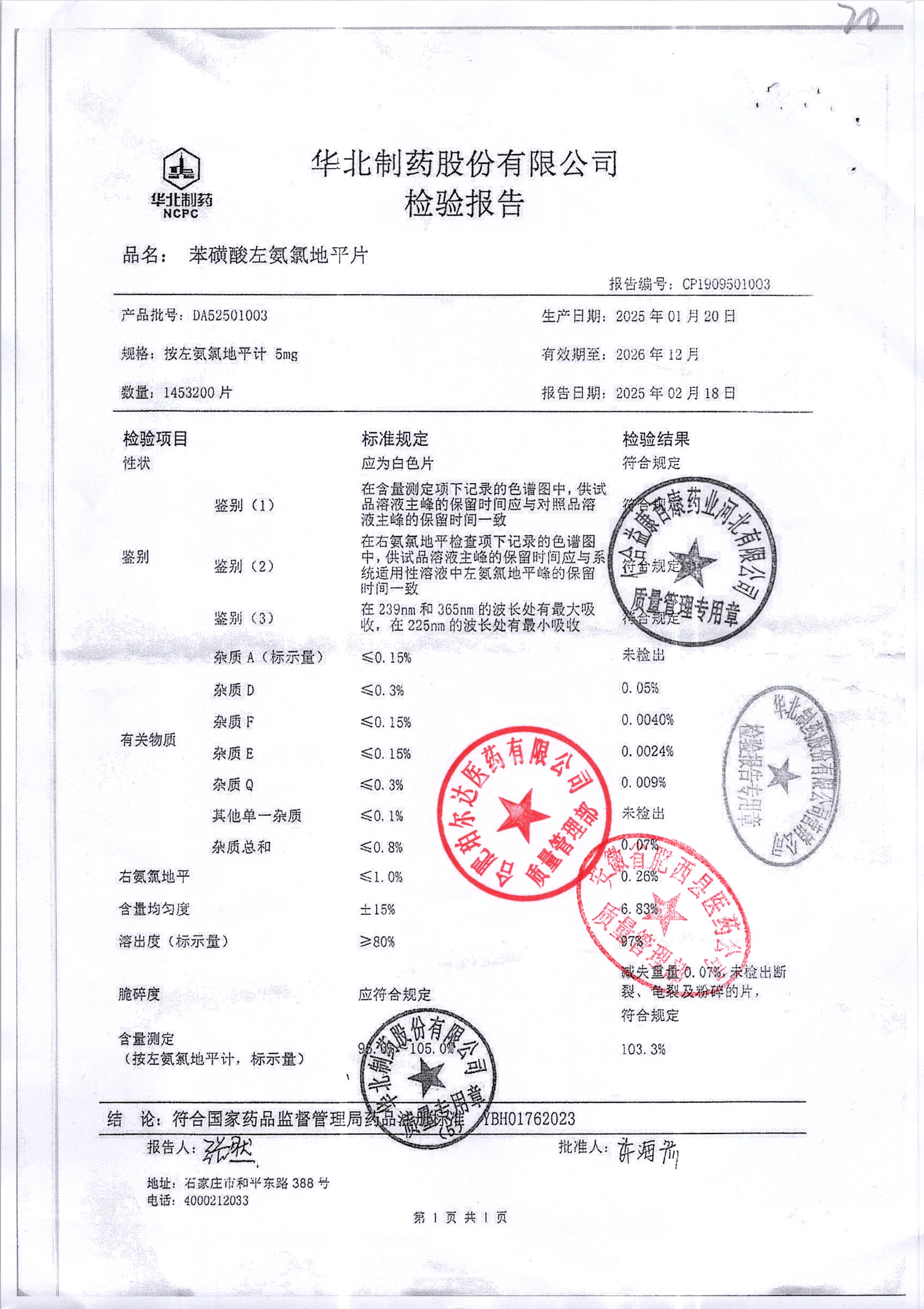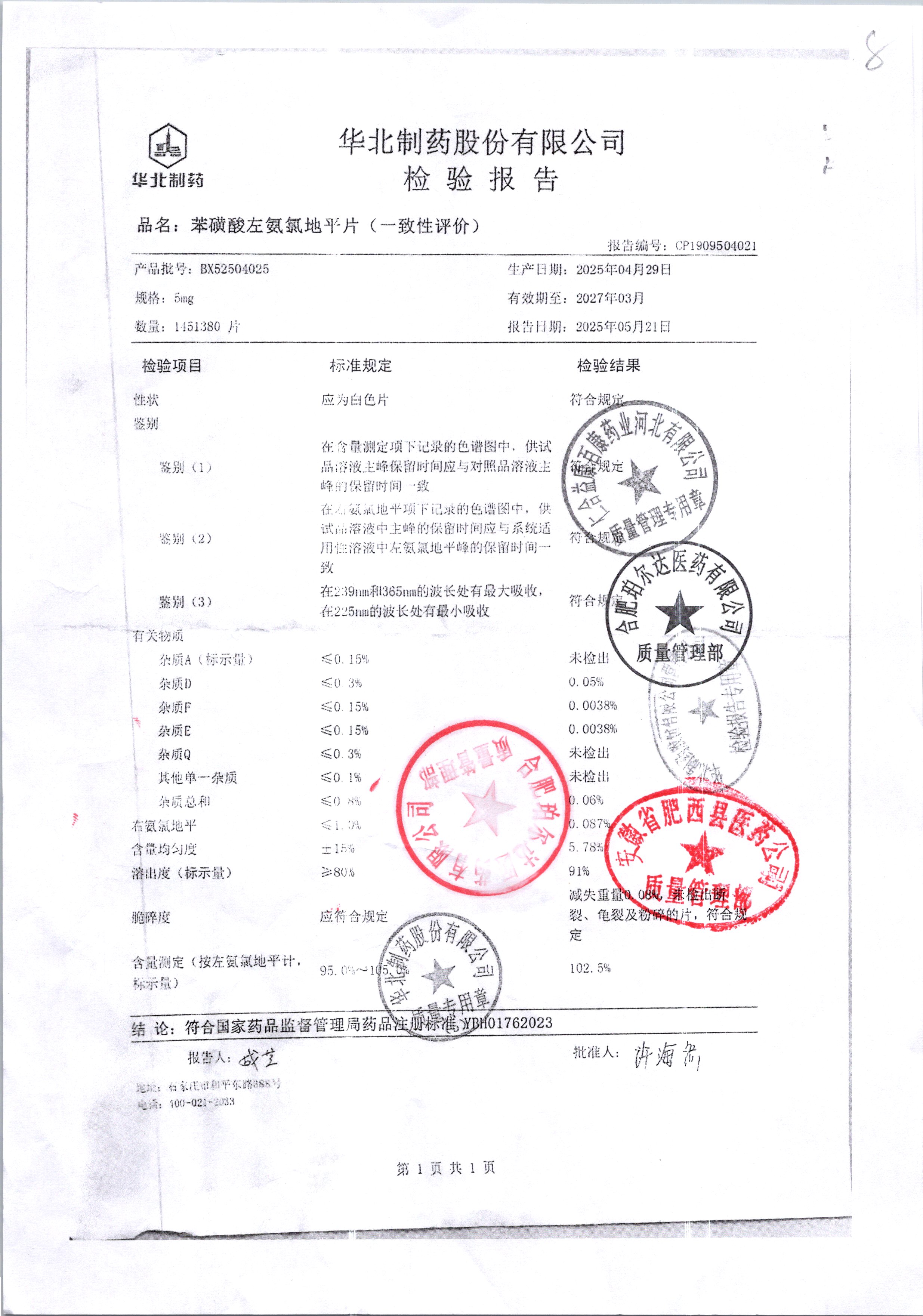 苯磺酸左氨氯地平片 | 5mg | BX52504025 | 查看详情 |