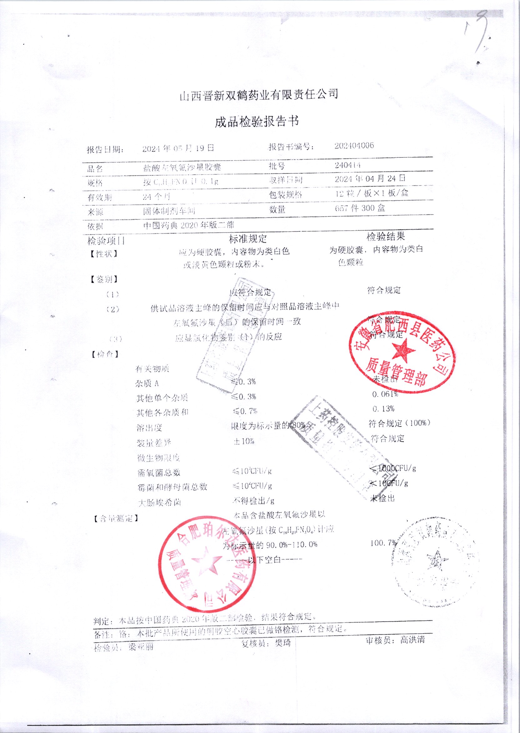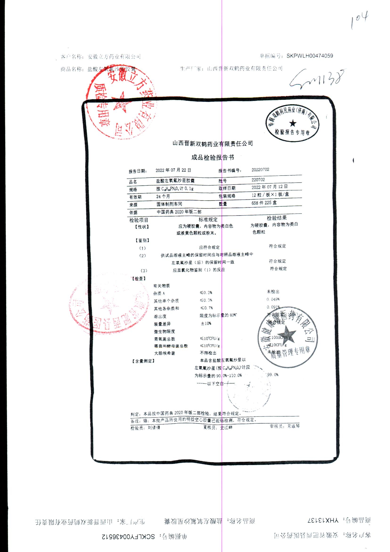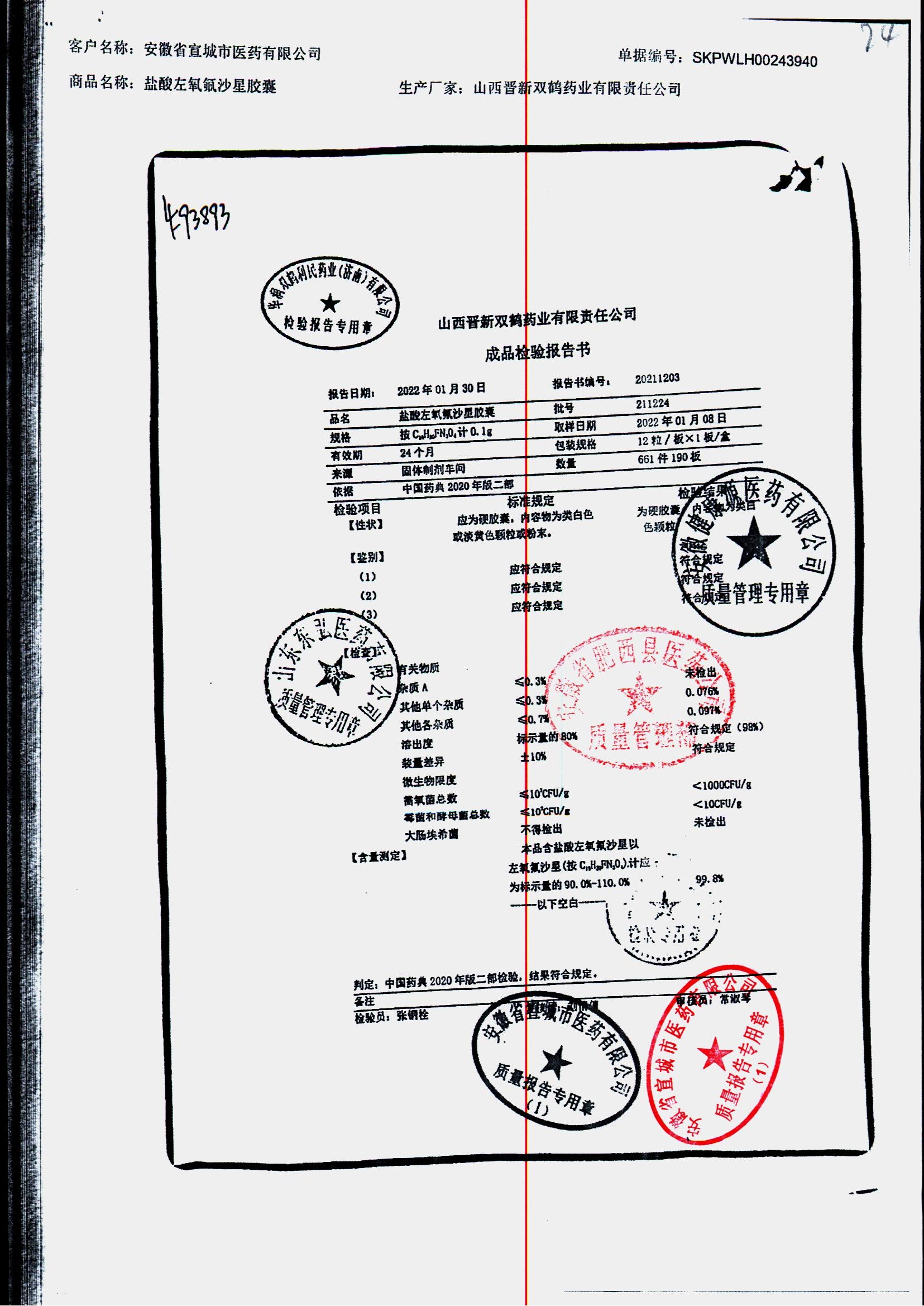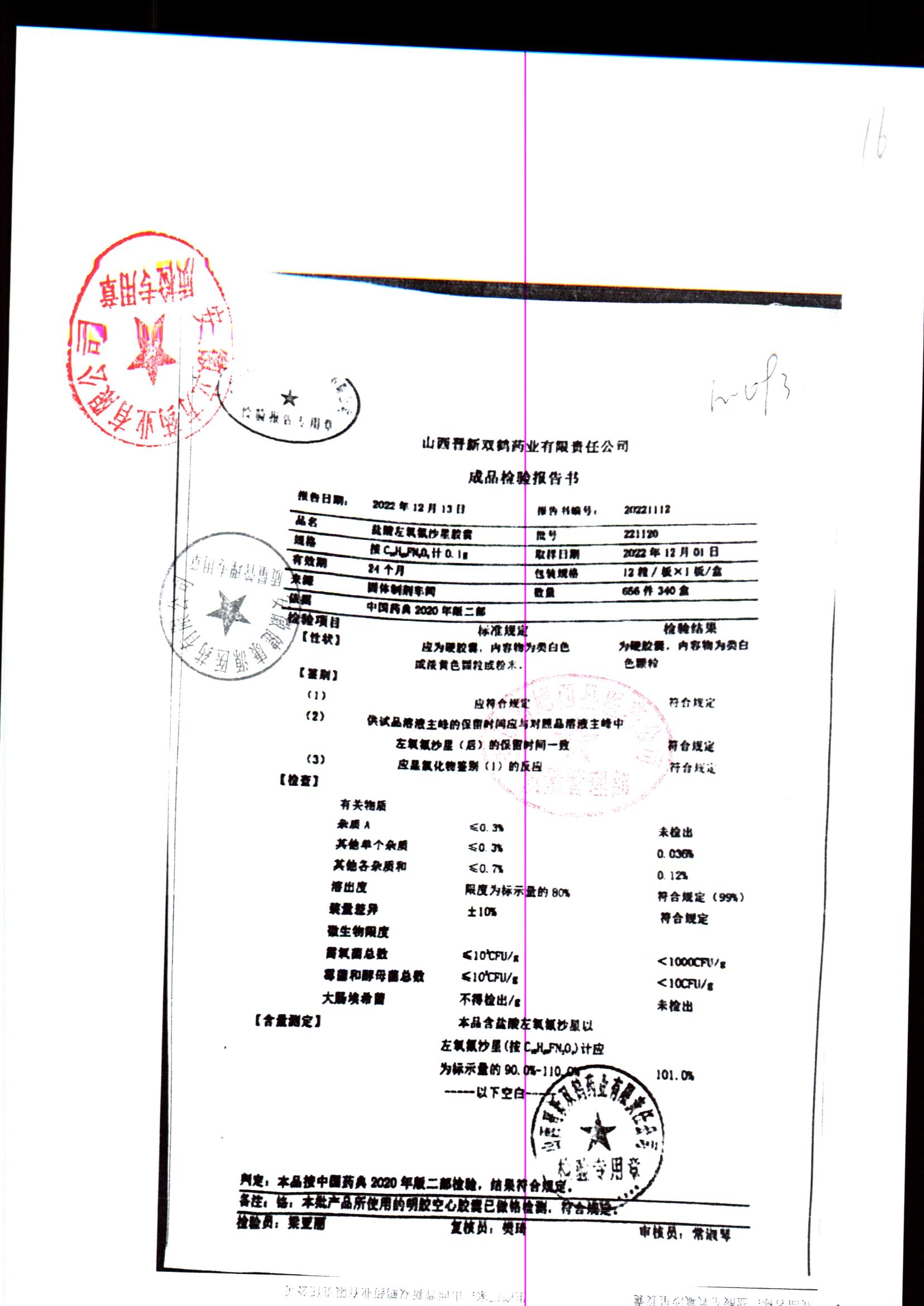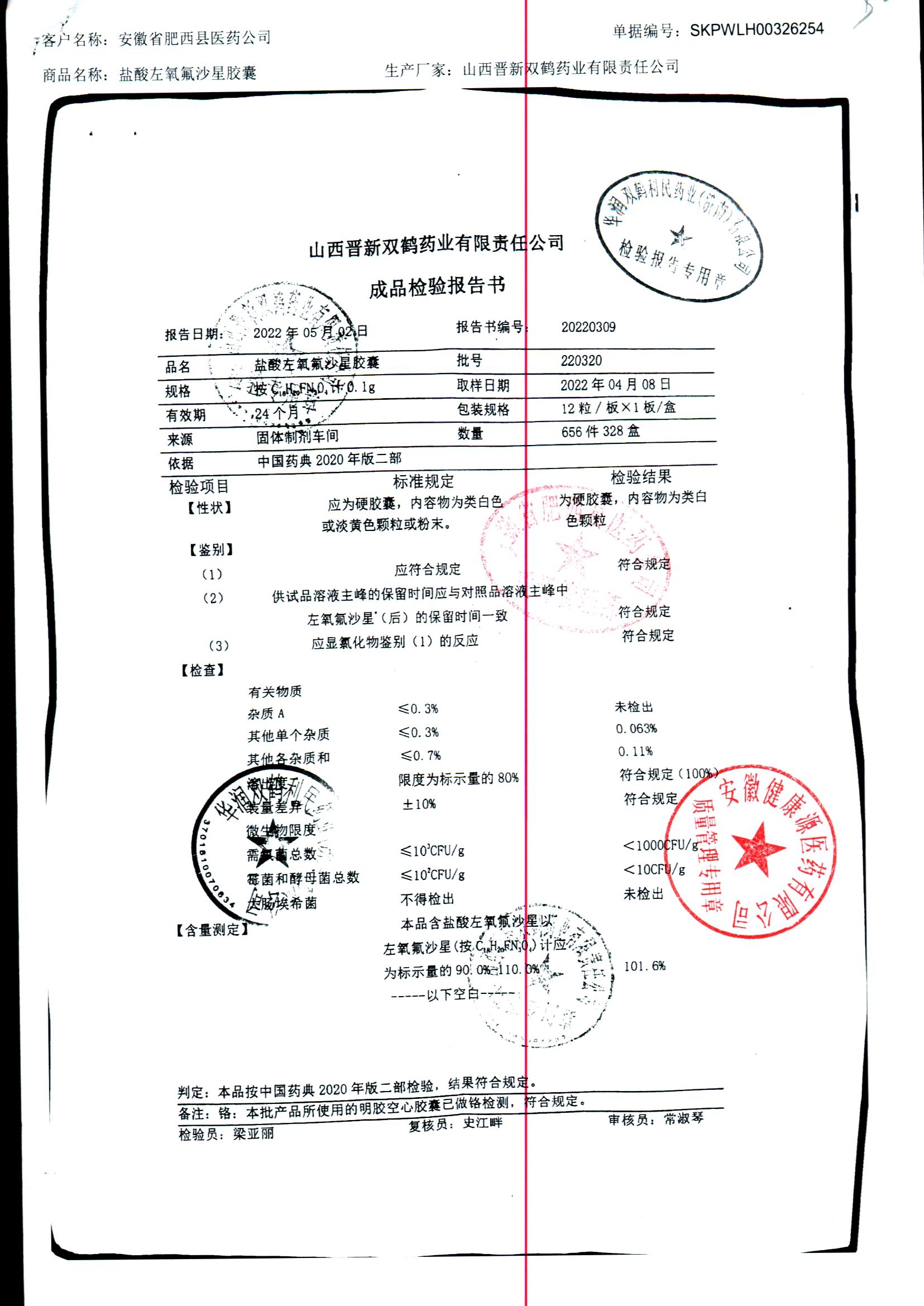 盐酸左氧氟沙星胶囊 | 0.1g*12粒 | 240414 | 查看详情 |