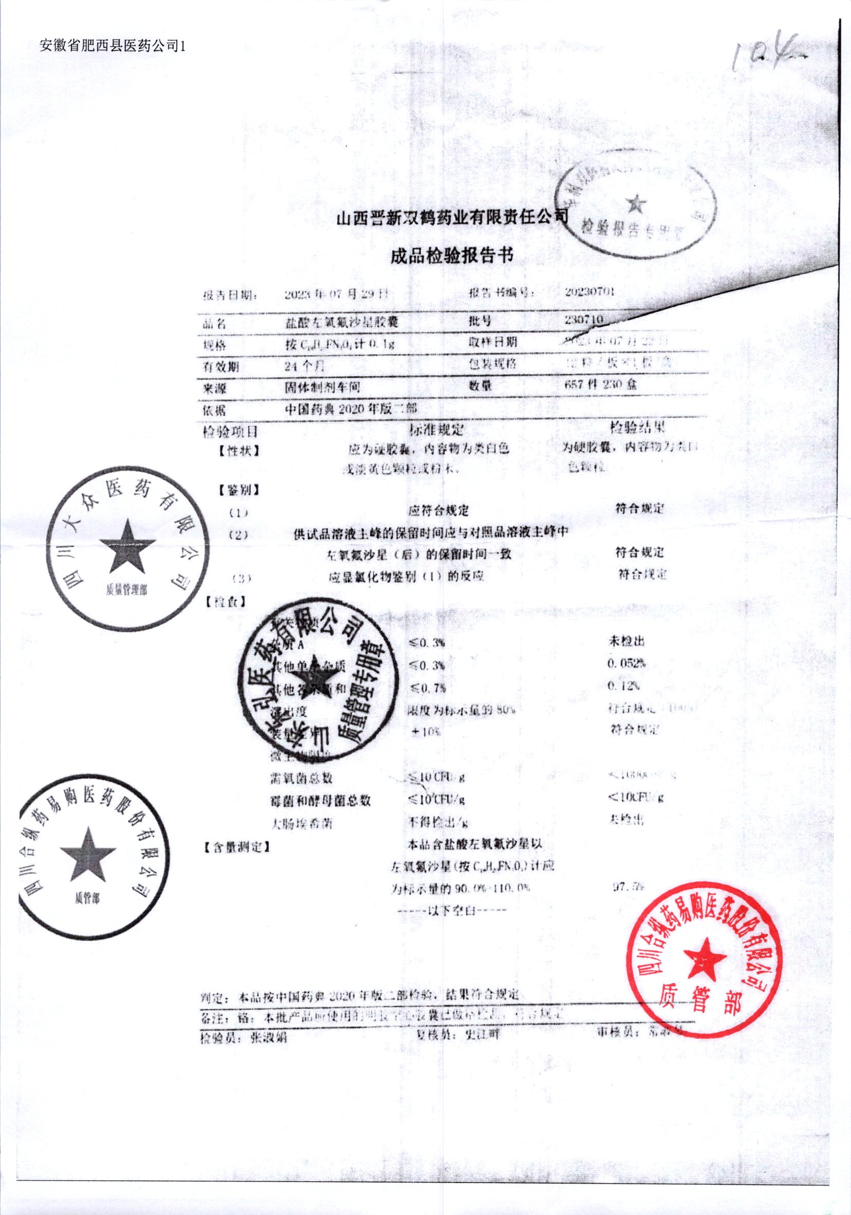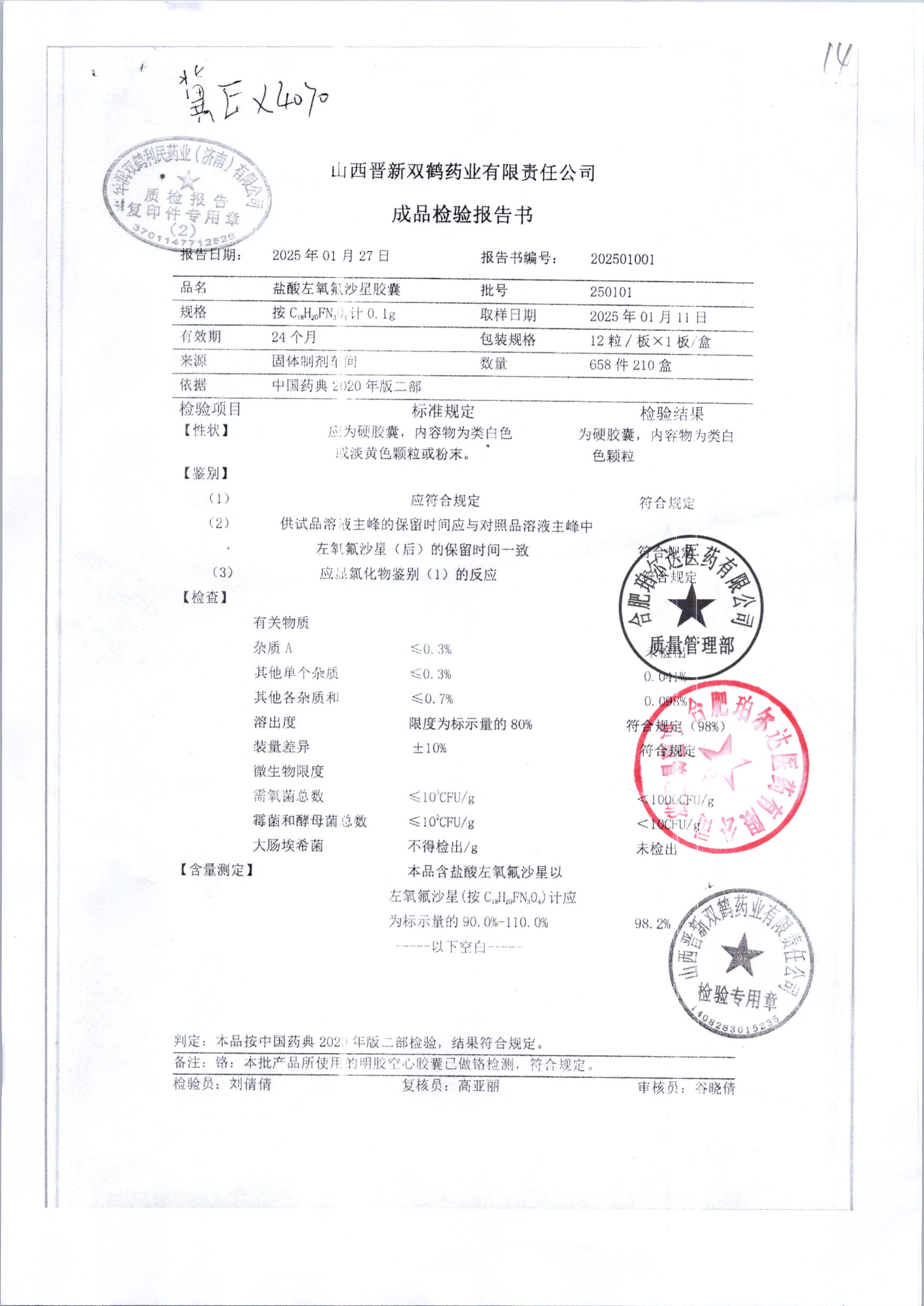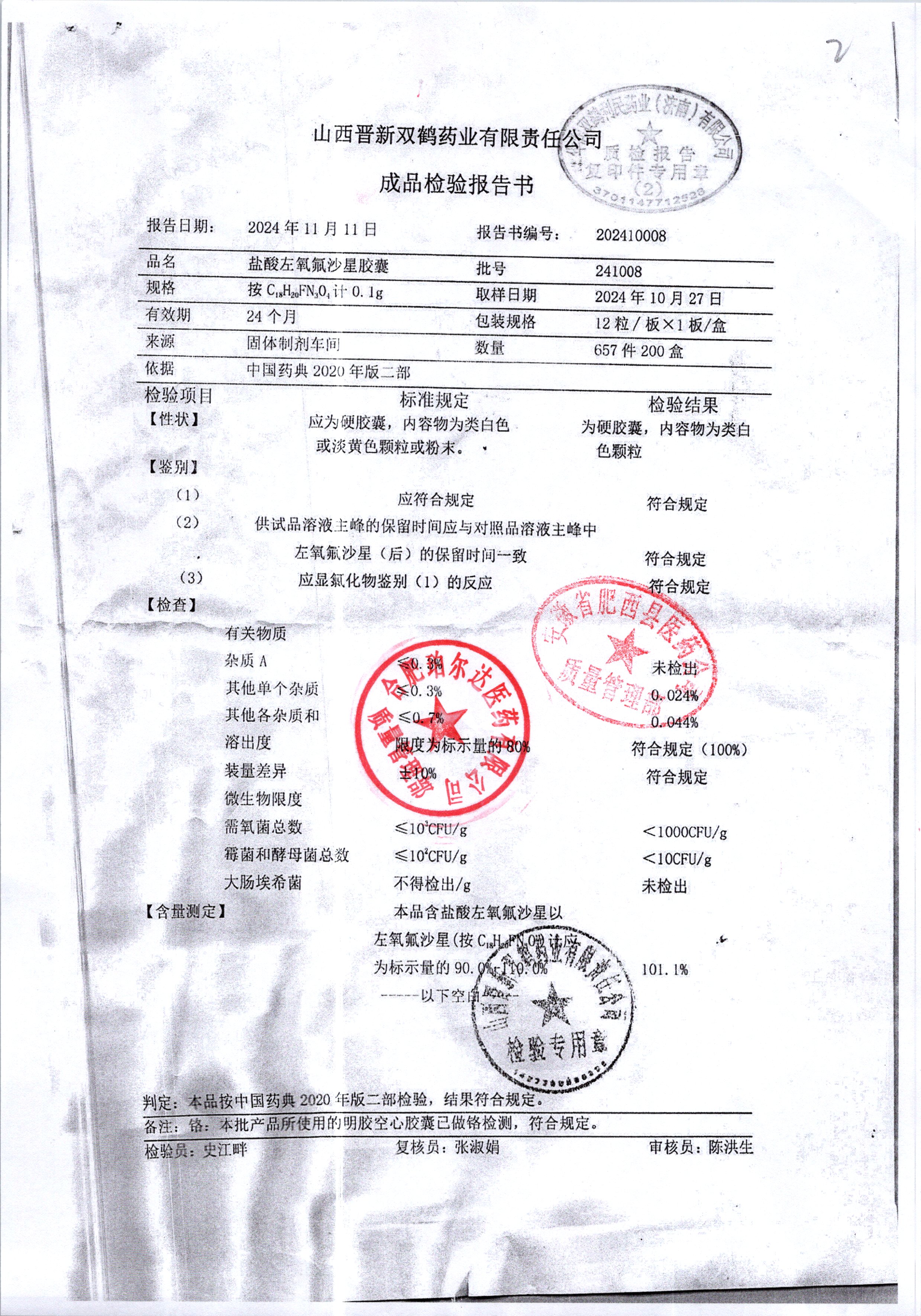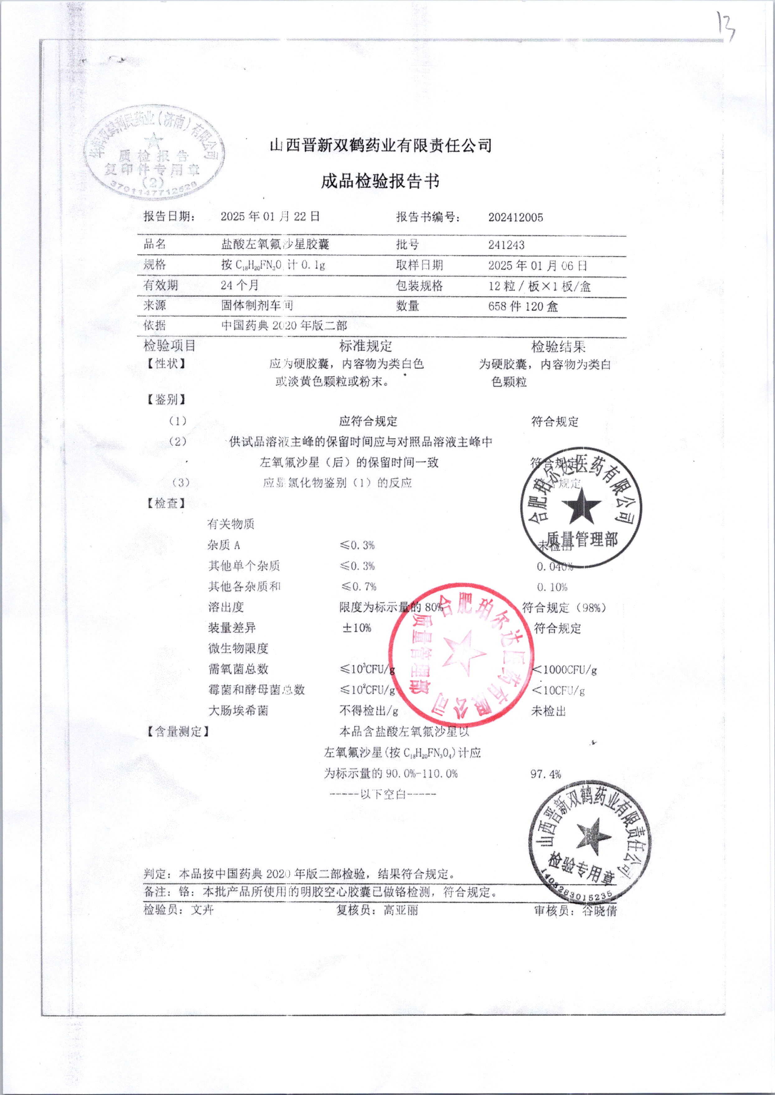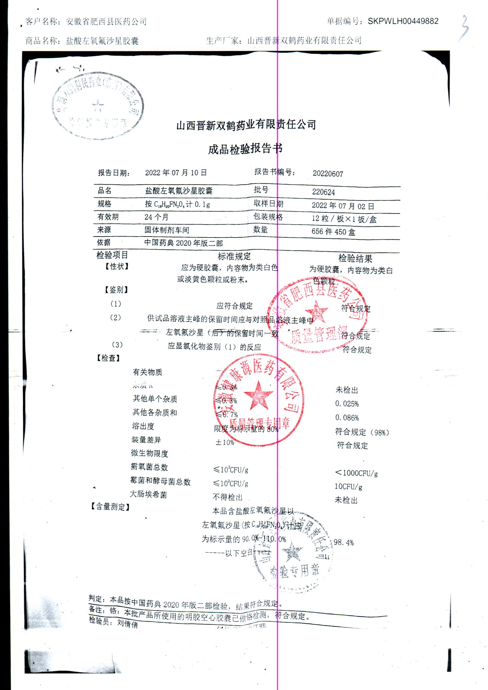 盐酸左氧氟沙星胶囊 | 0.1g*12粒 | 240414 | 查看详情 |