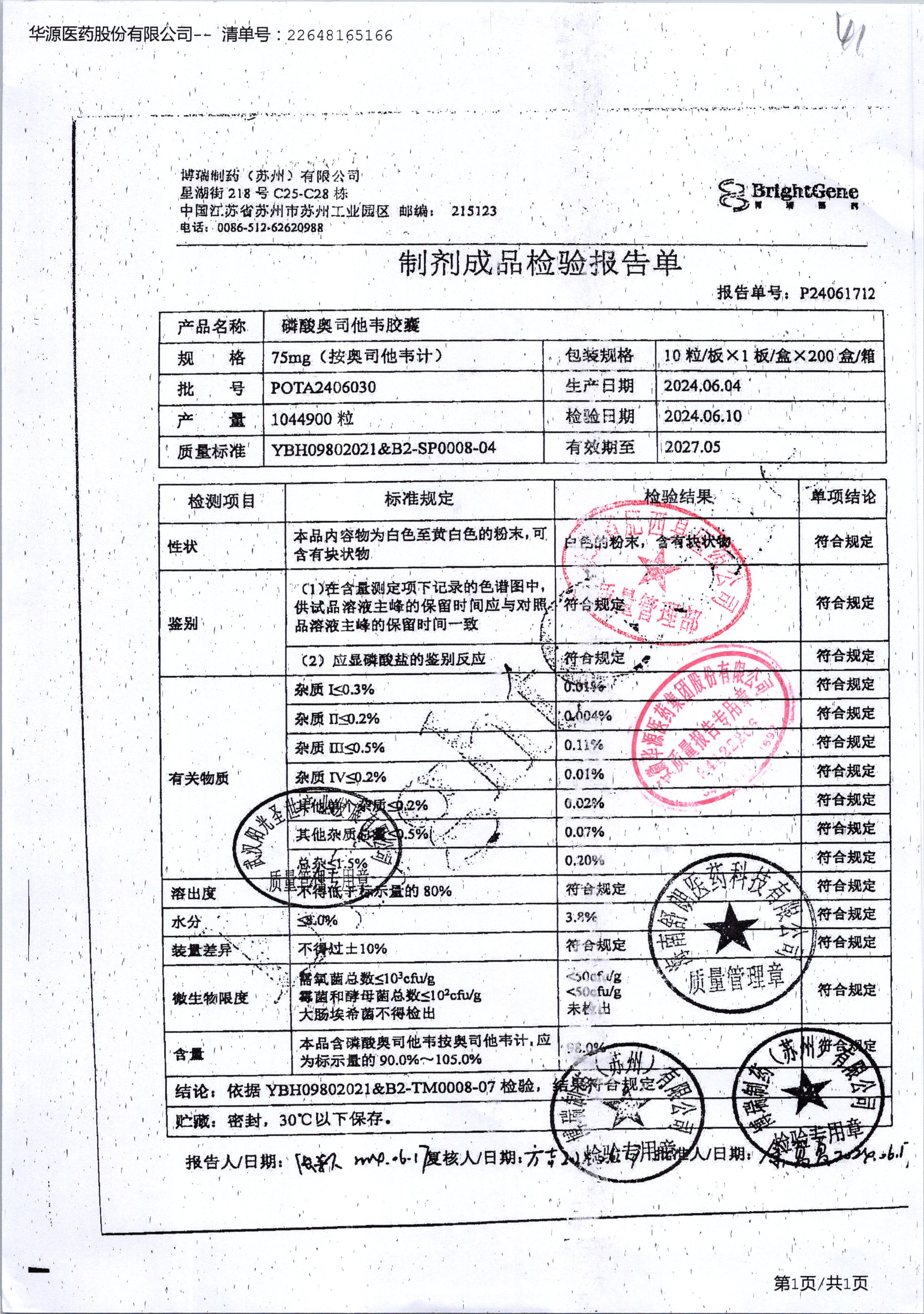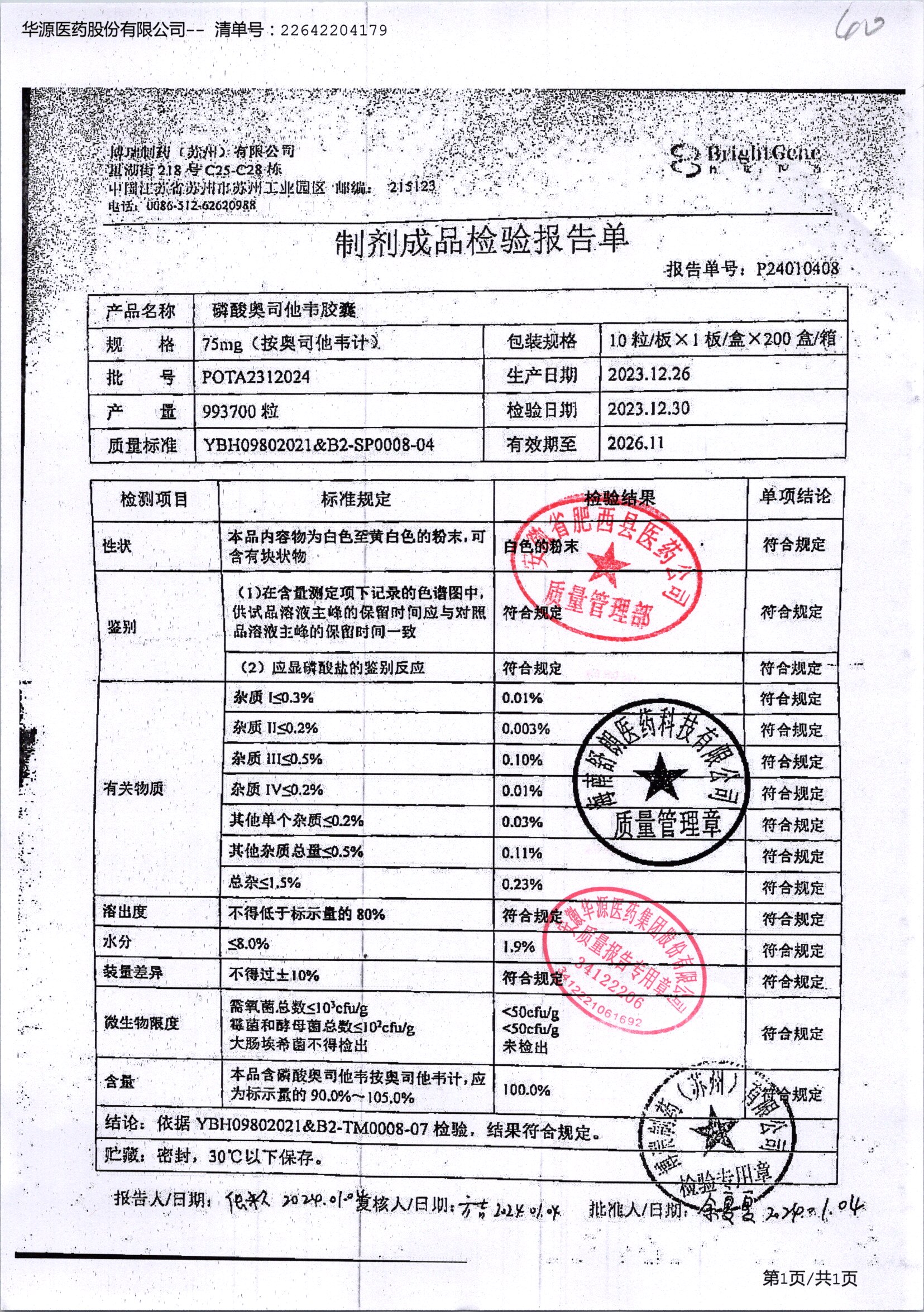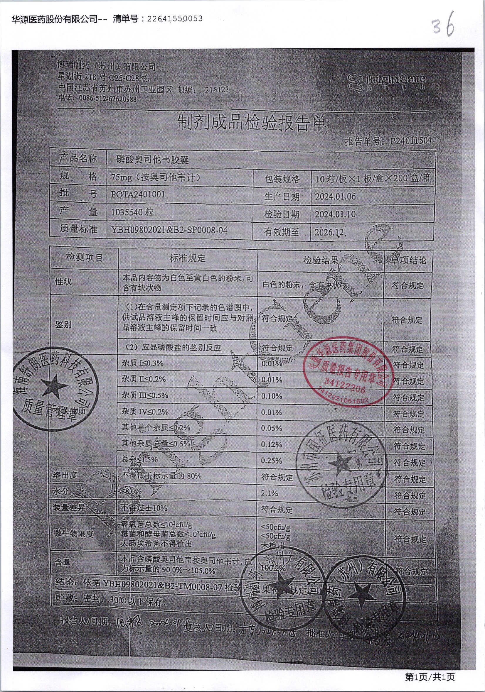 磷酸奥司他韦胶囊 | 75mg*10粒 | POTA2406034/1 | 查看详情 |