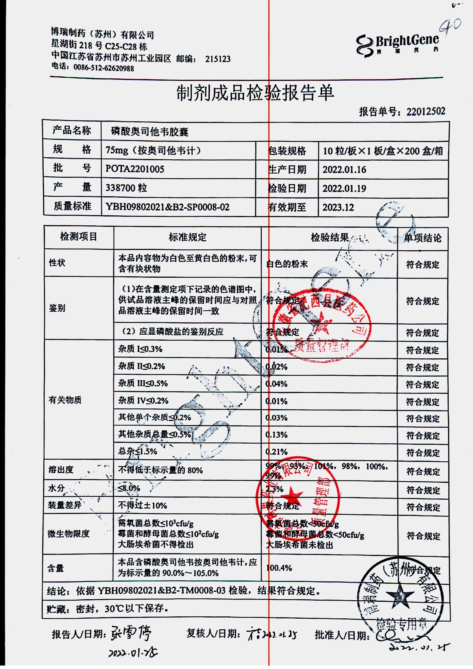 磷酸奥司他韦胶囊 | 75mg*10粒 | POTA2201005/3 | 查看详情 |