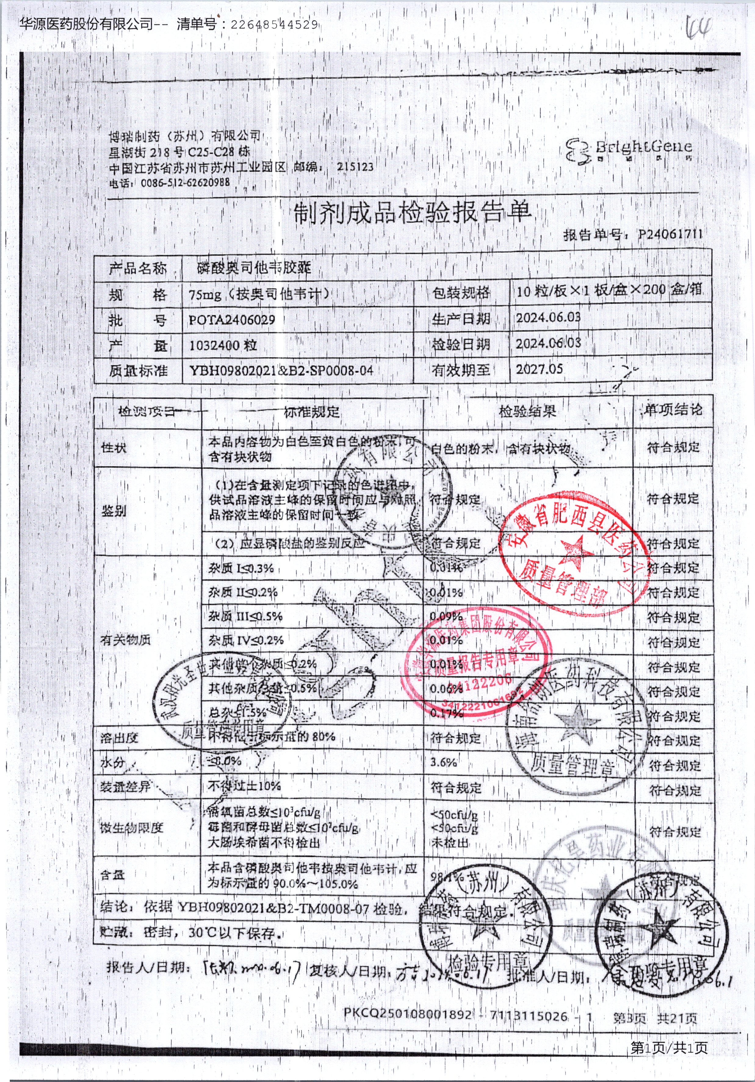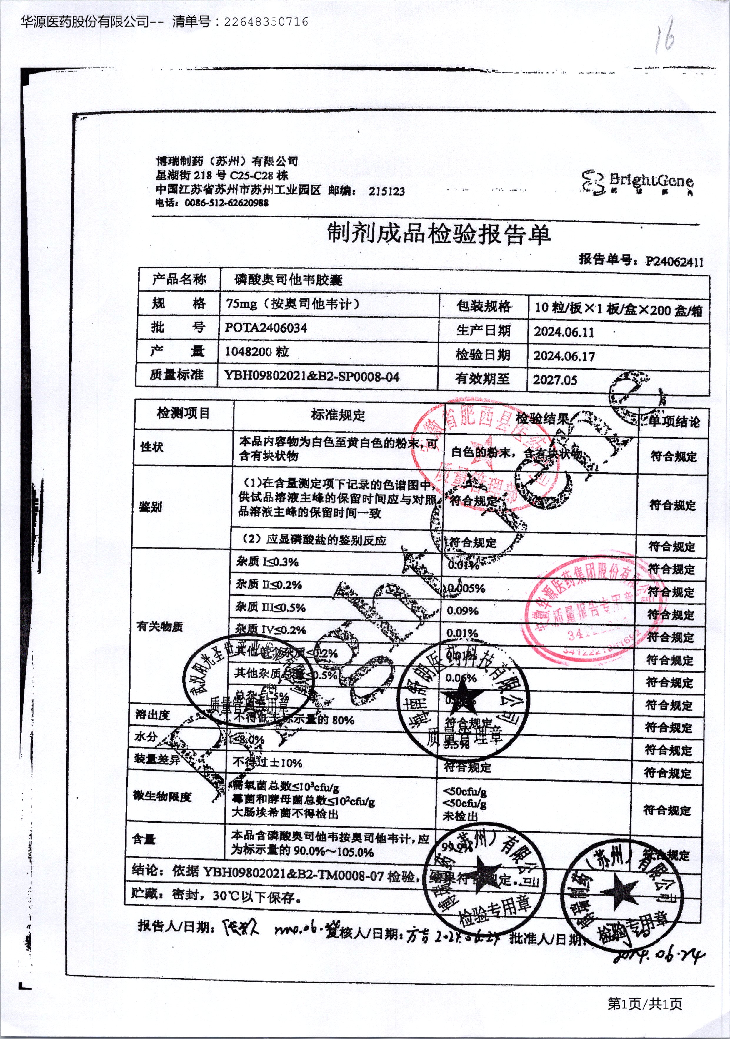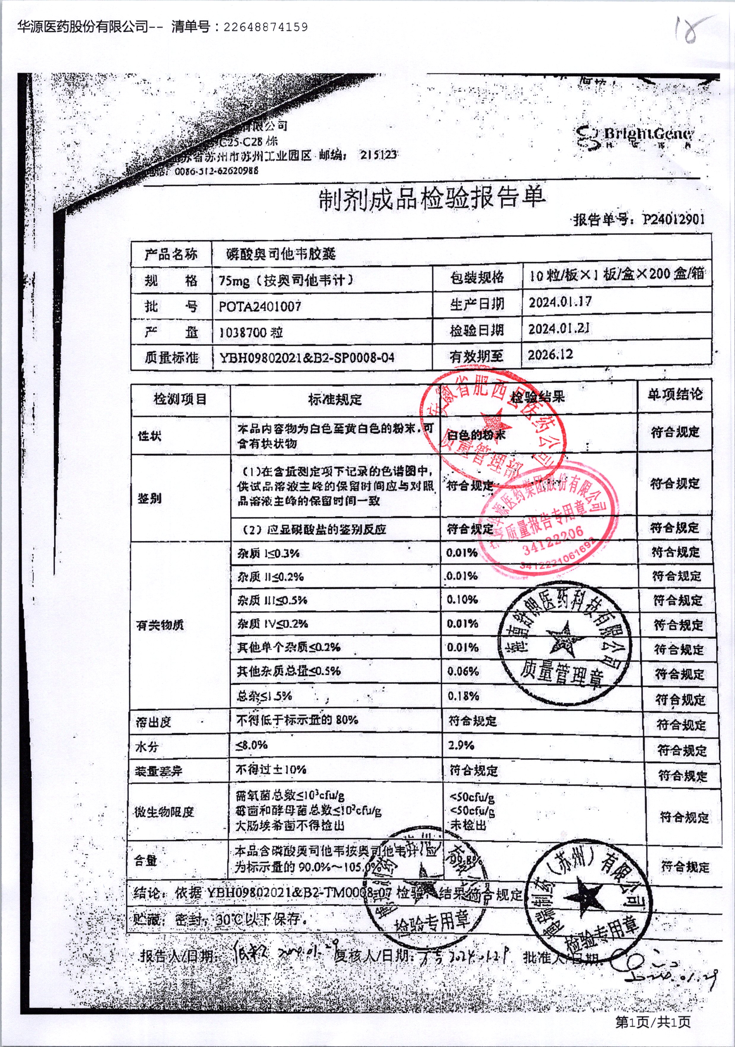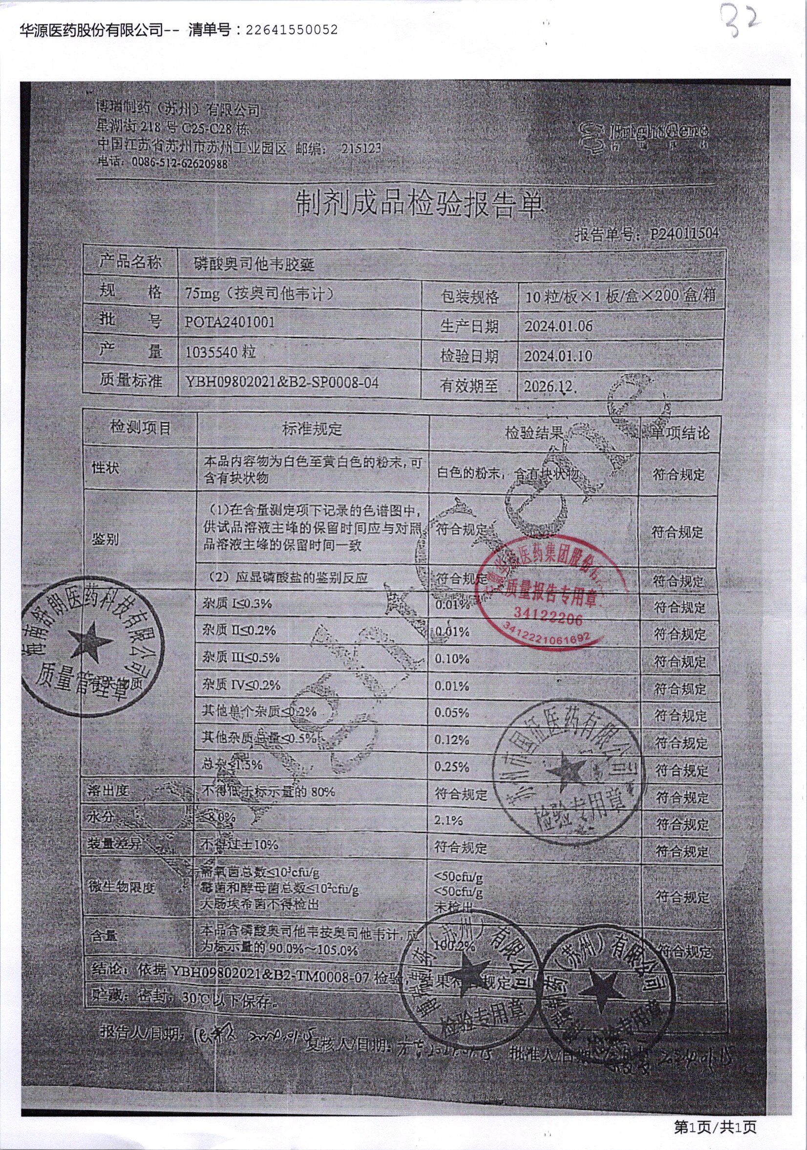 磷酸奥司他韦胶囊 | 75mg*10粒 | POTA2406029/1 | 查看详情 |