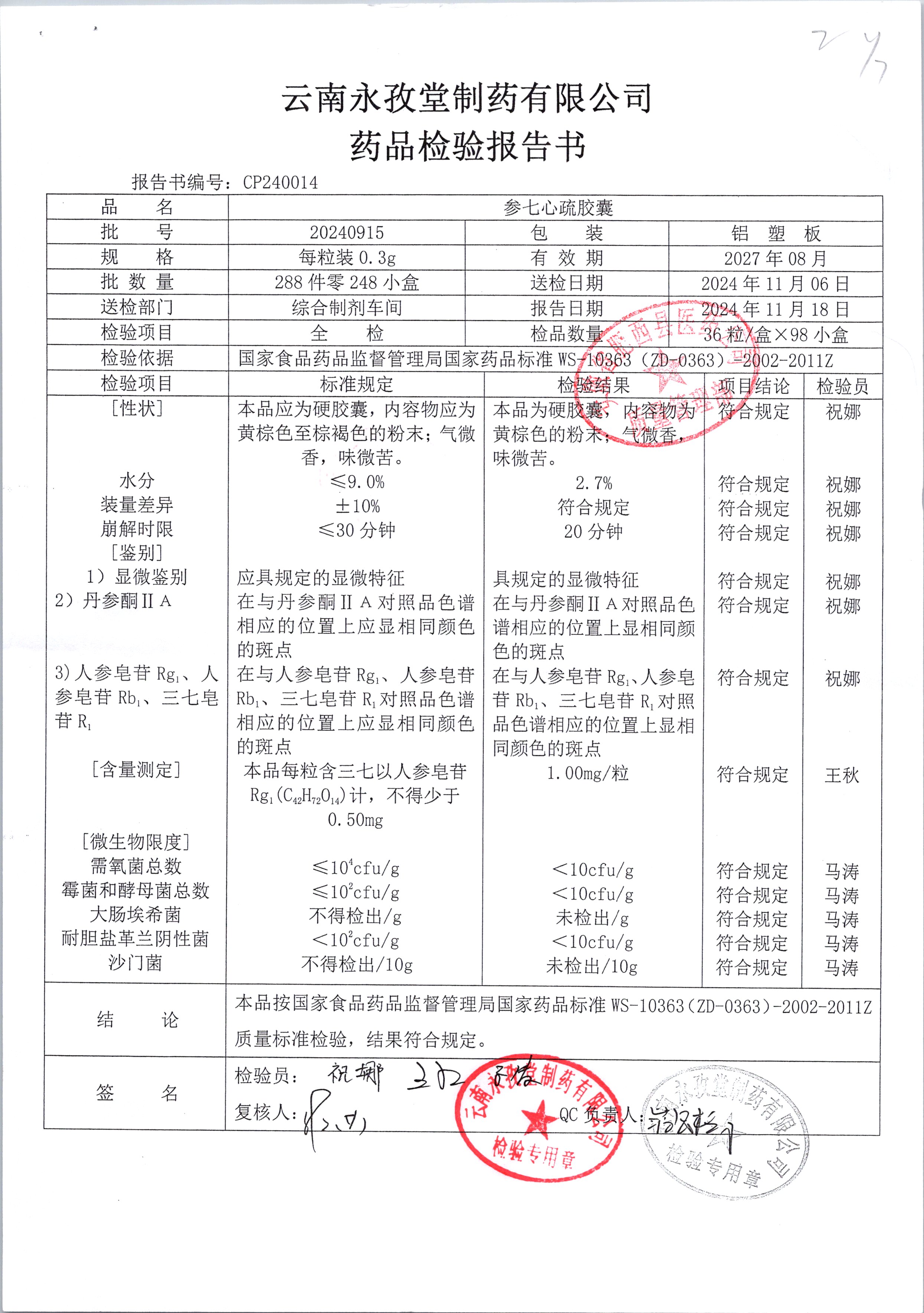 | 参七心疏胶囊 | 0.3g*36粒 | 20240915/2 | 查看详情 |