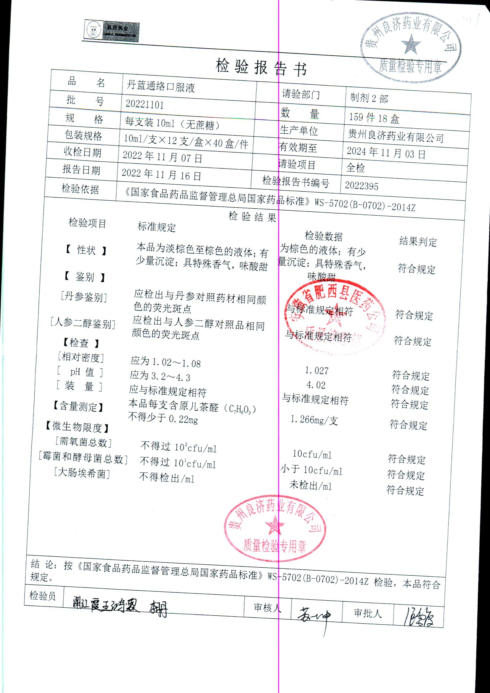 丹蓝通络口服液 | 10ml*12支 | 20221101 | 查看详情 |