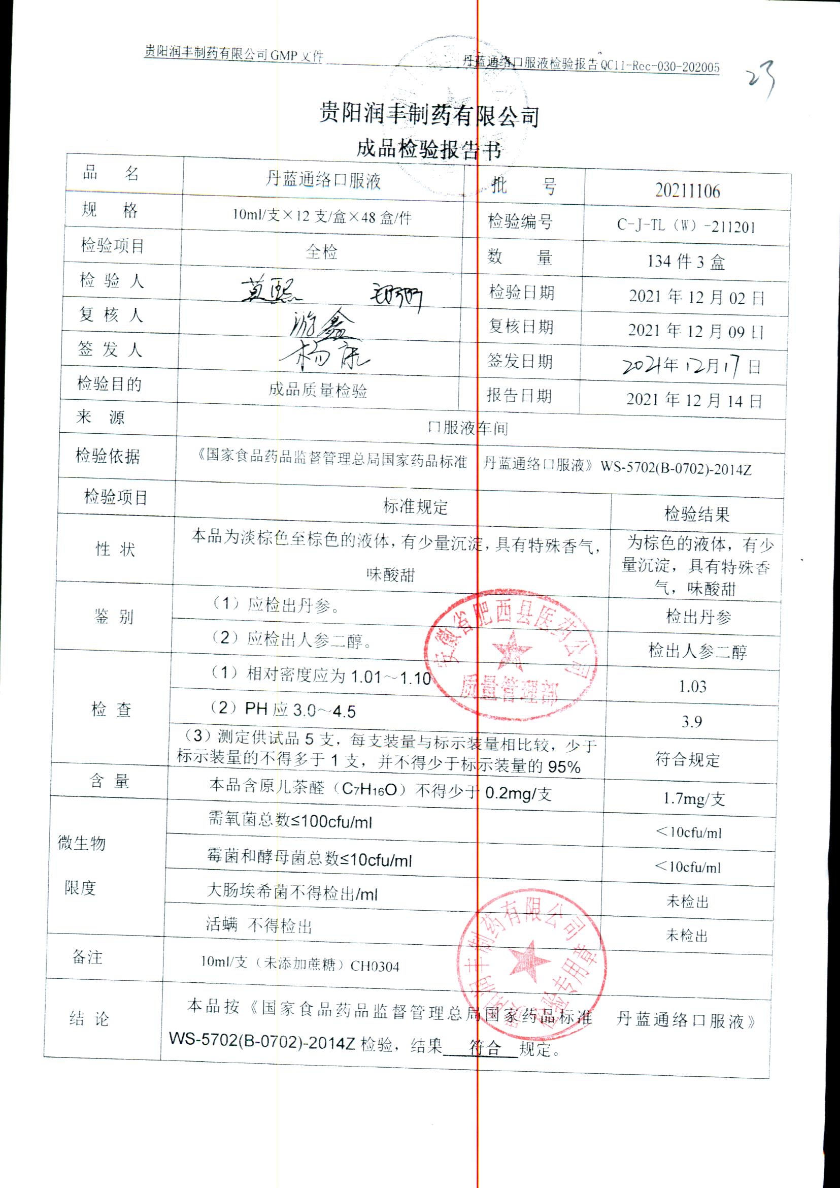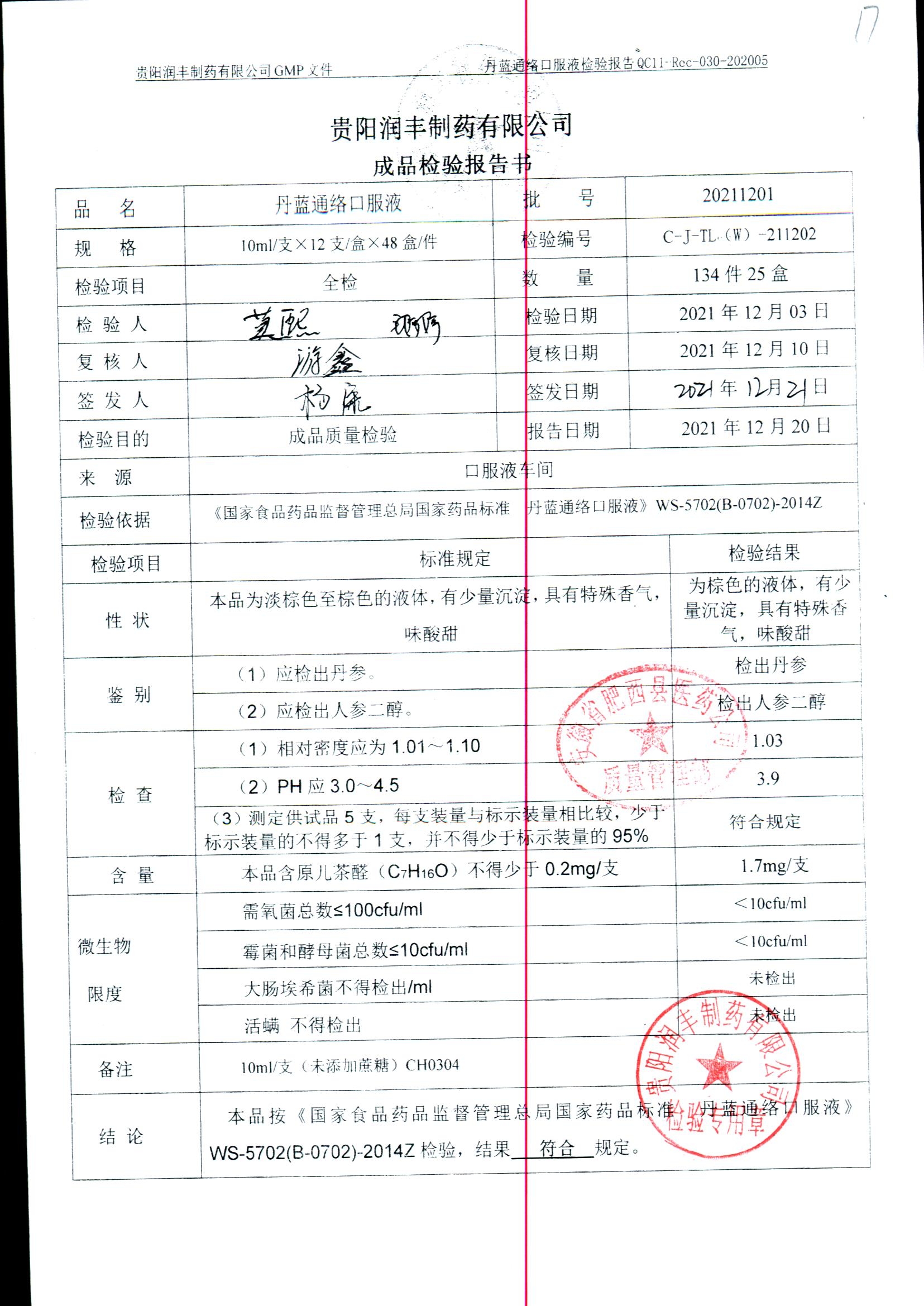 丹蓝通络口服液 | 10ml*12支 | 20211201 | 查看详情 |
