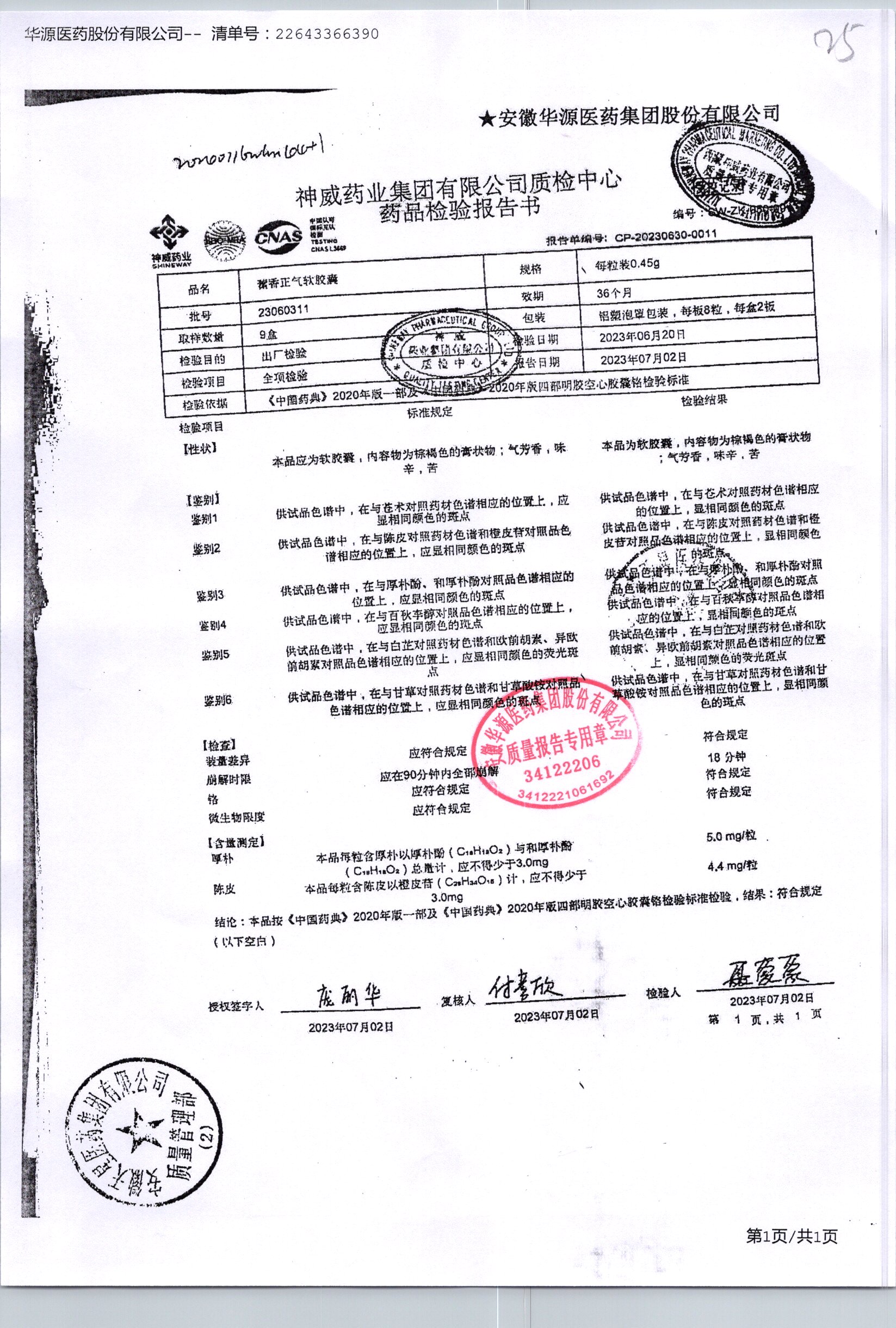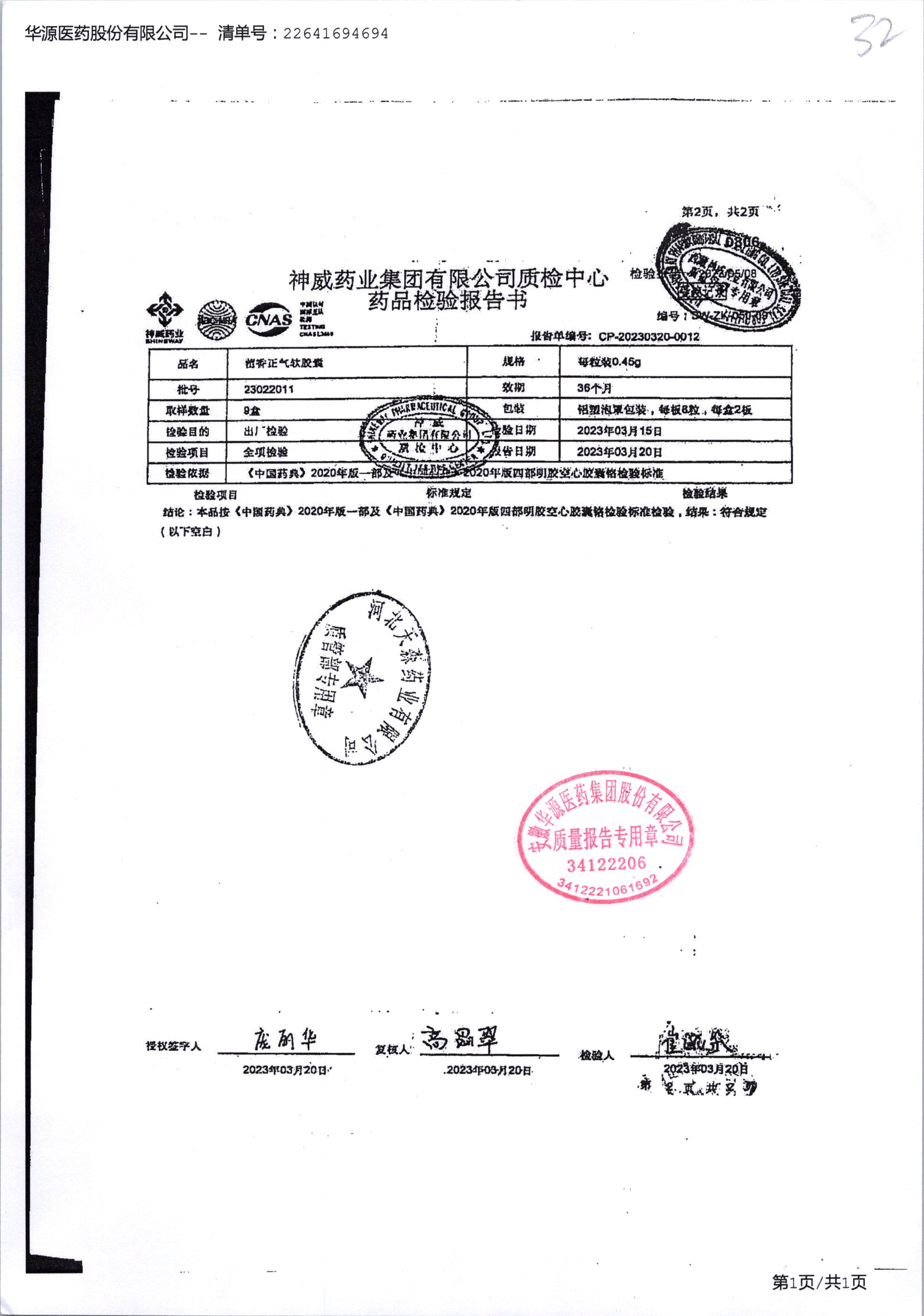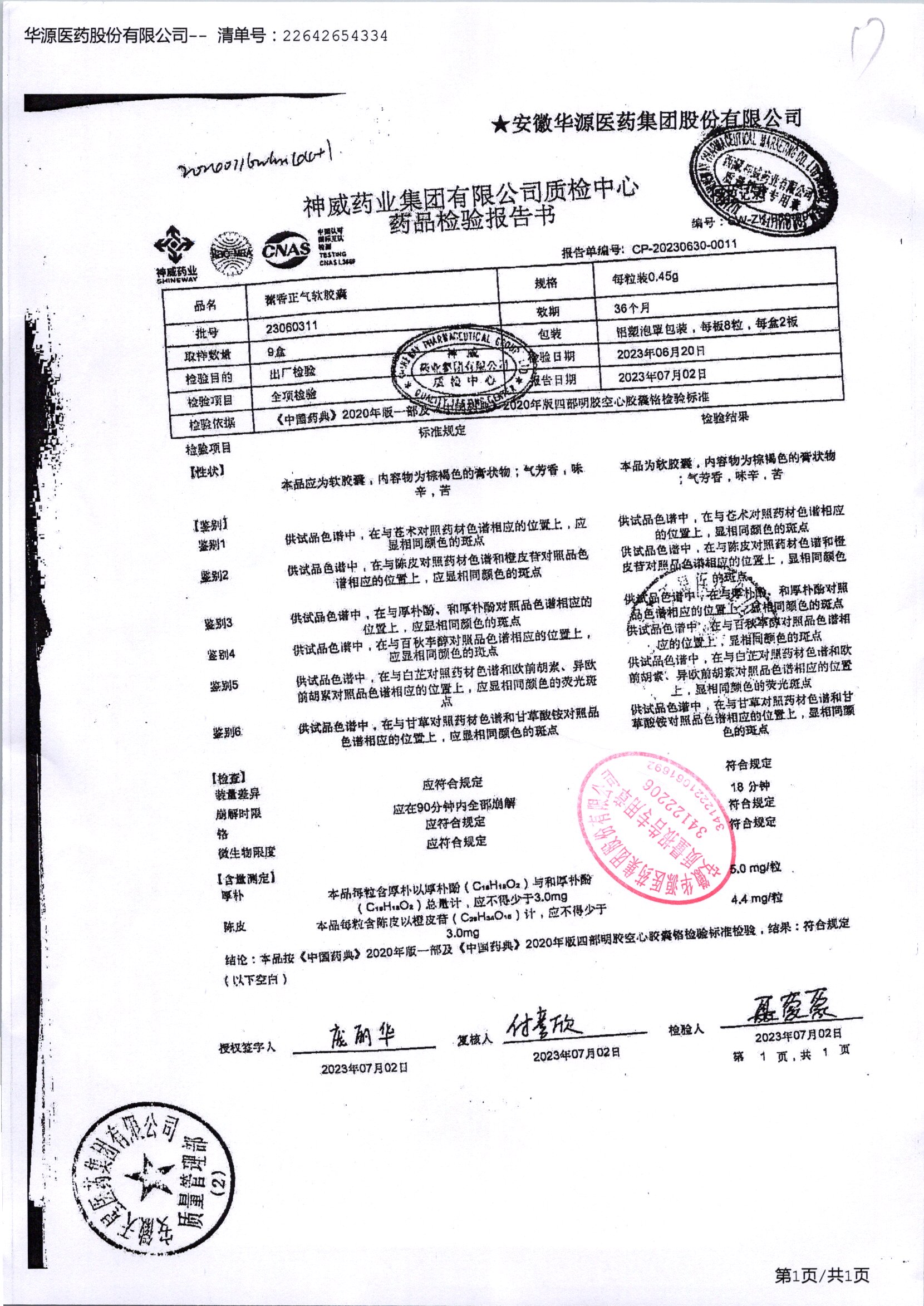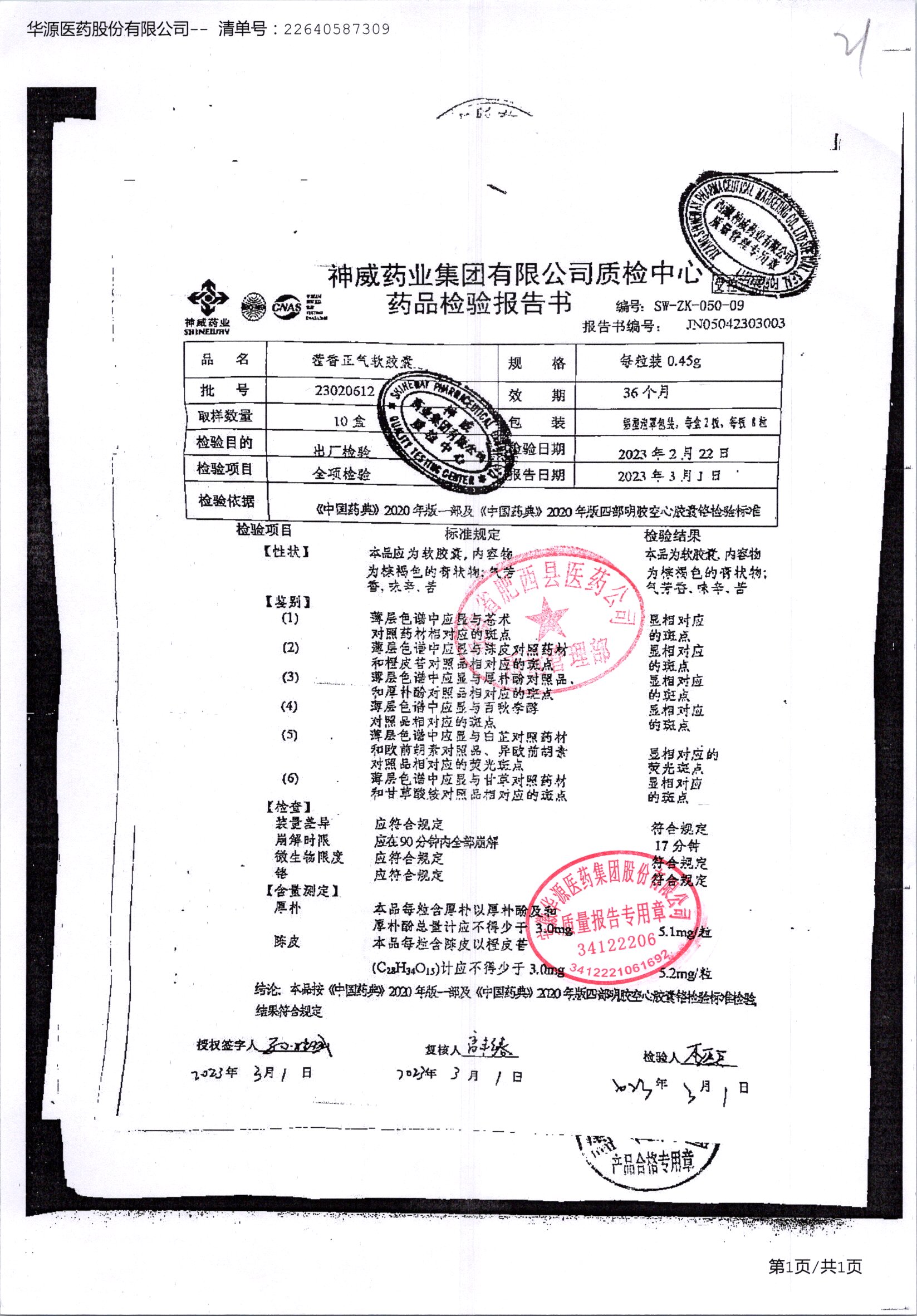 藿香正气软胶囊 | 0.45g*8粒*2板 | 23022011/2 | 查看详情 |