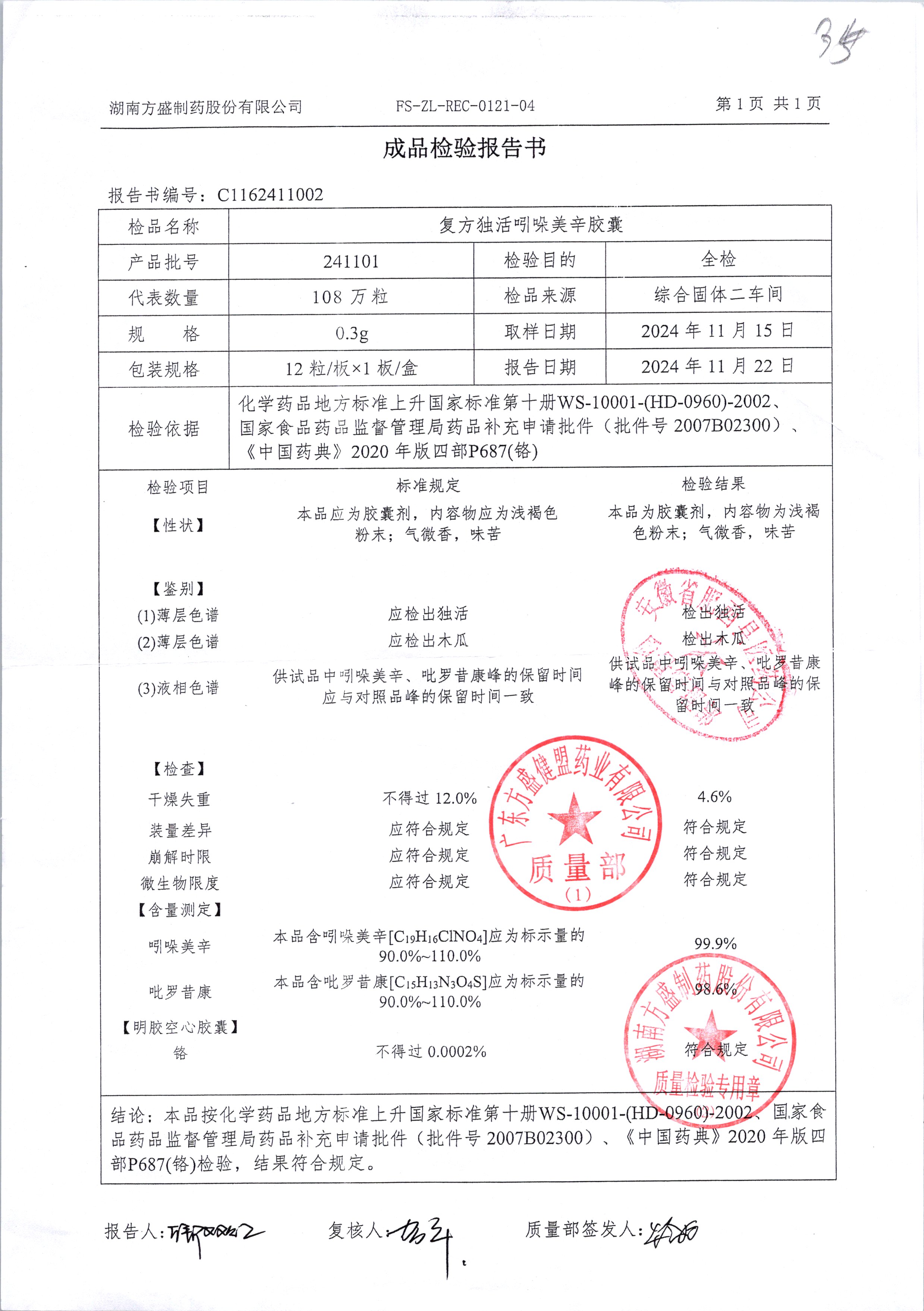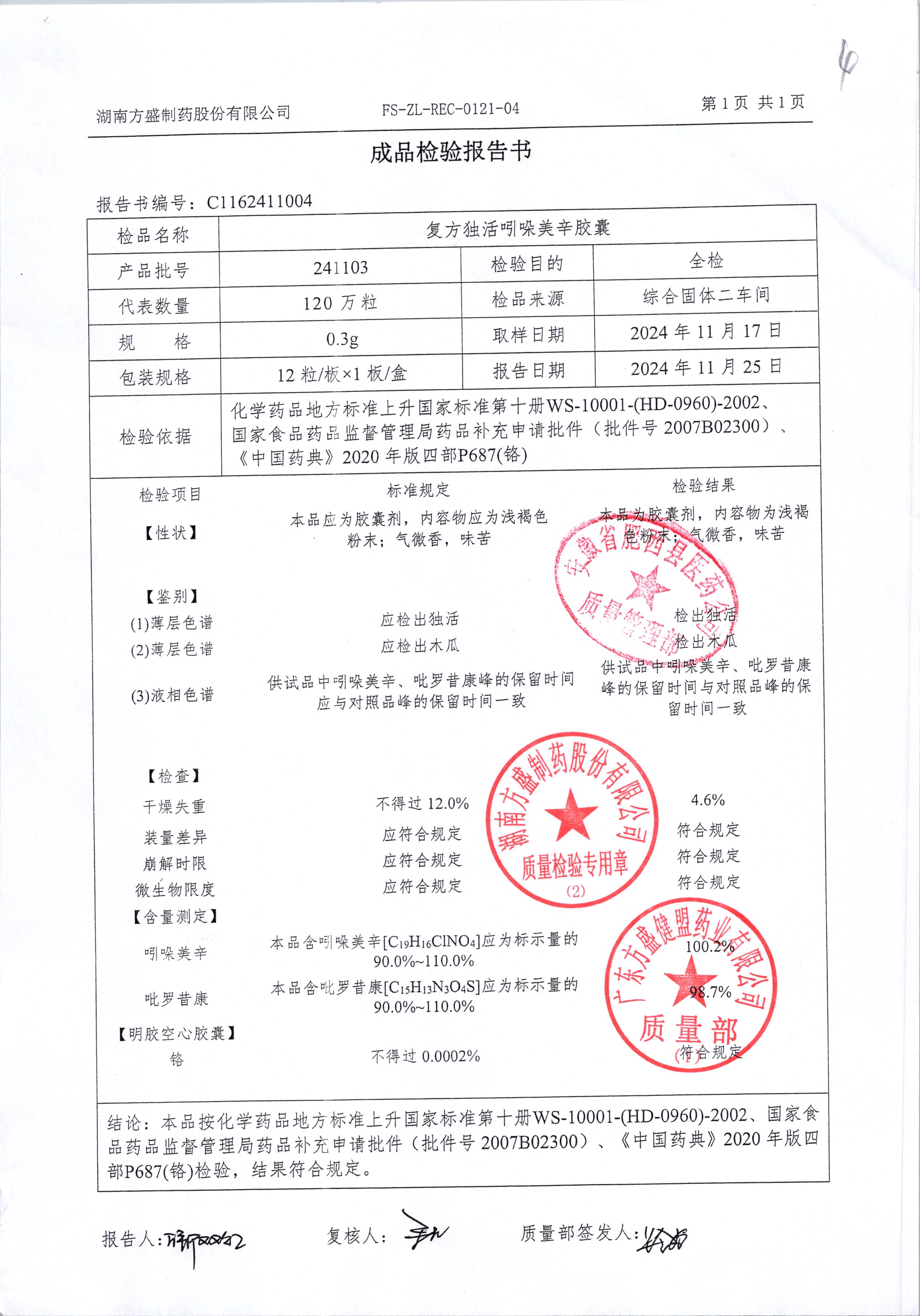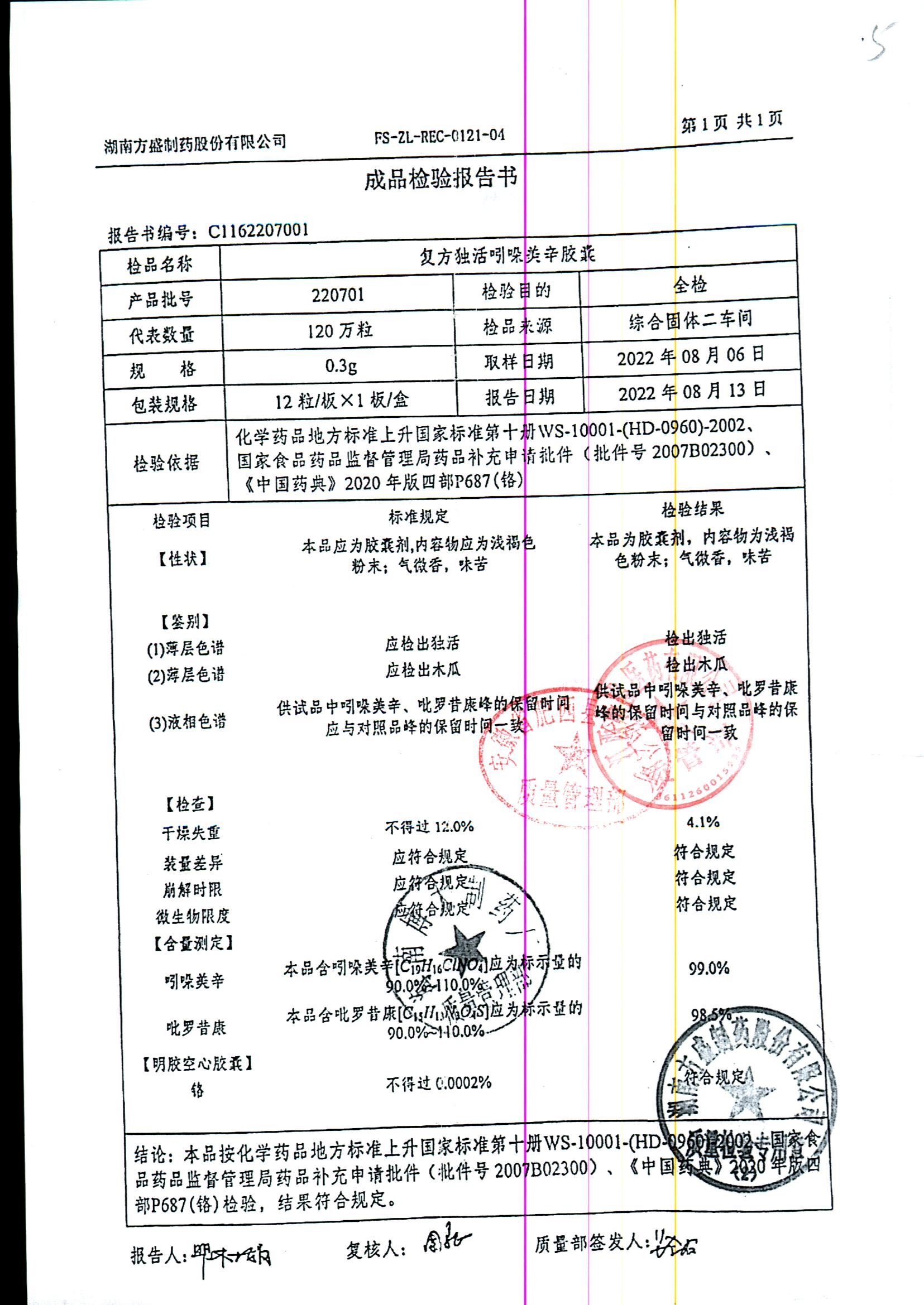 名称 | 规格 | 批号 | 药检报告 |