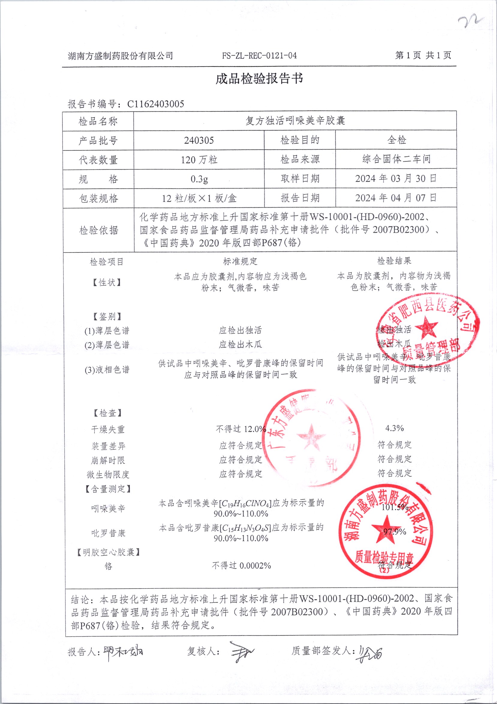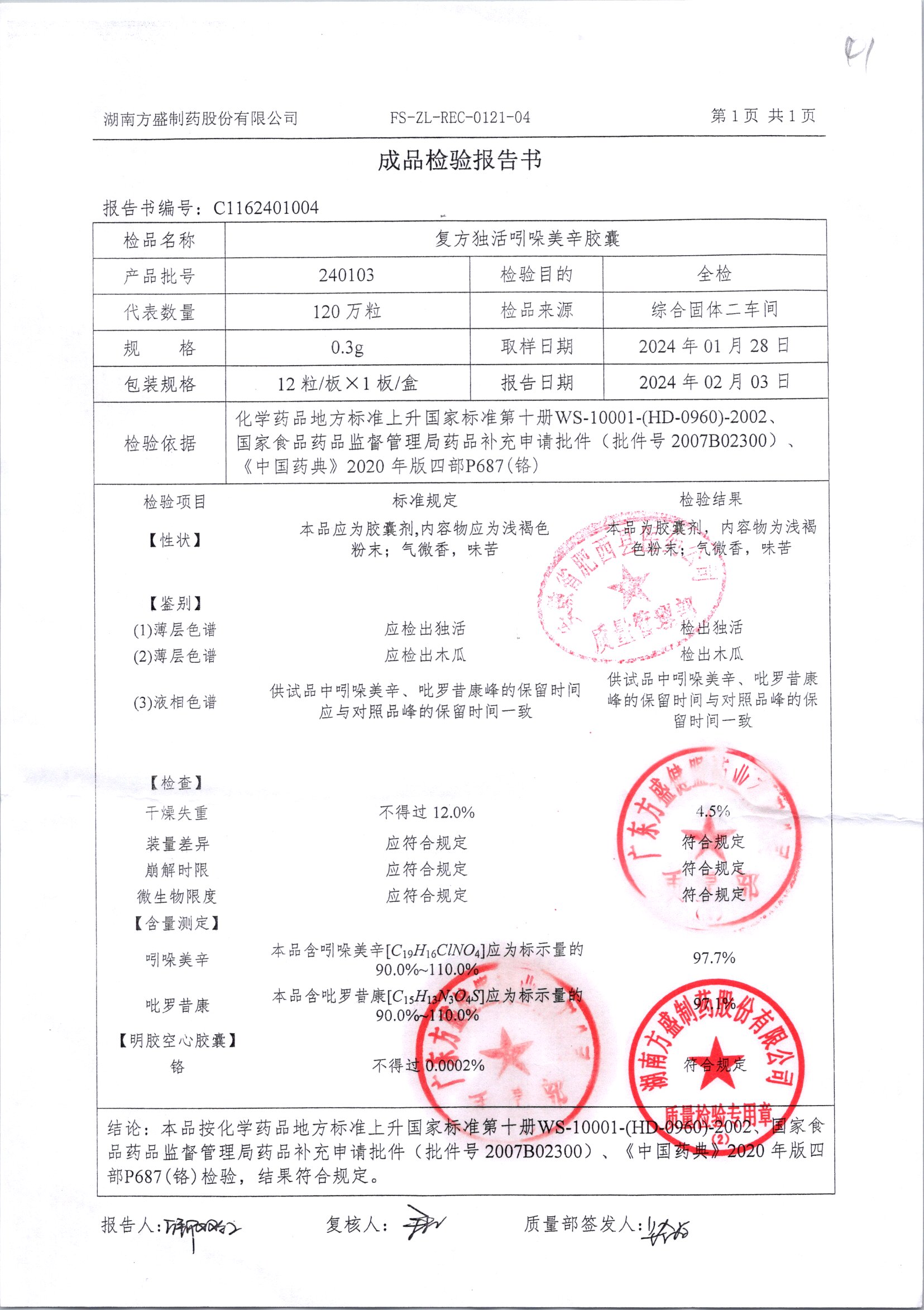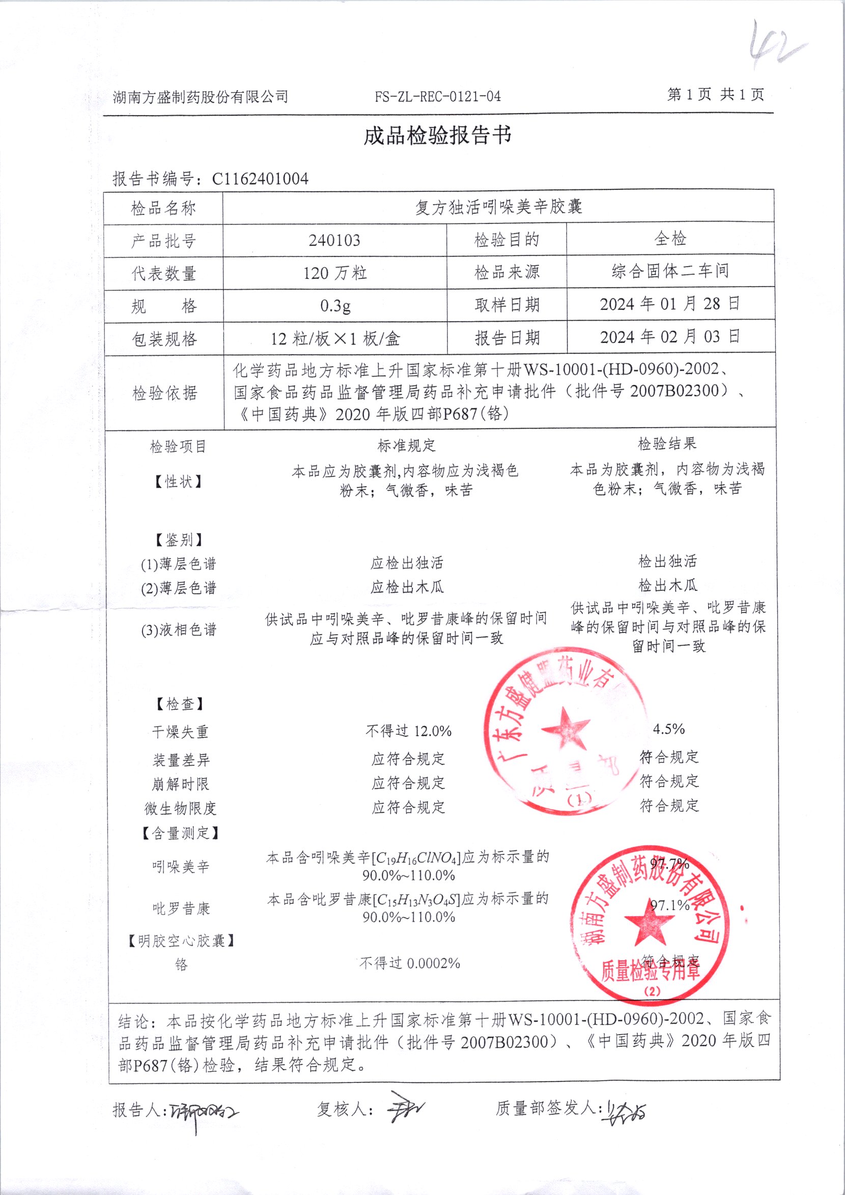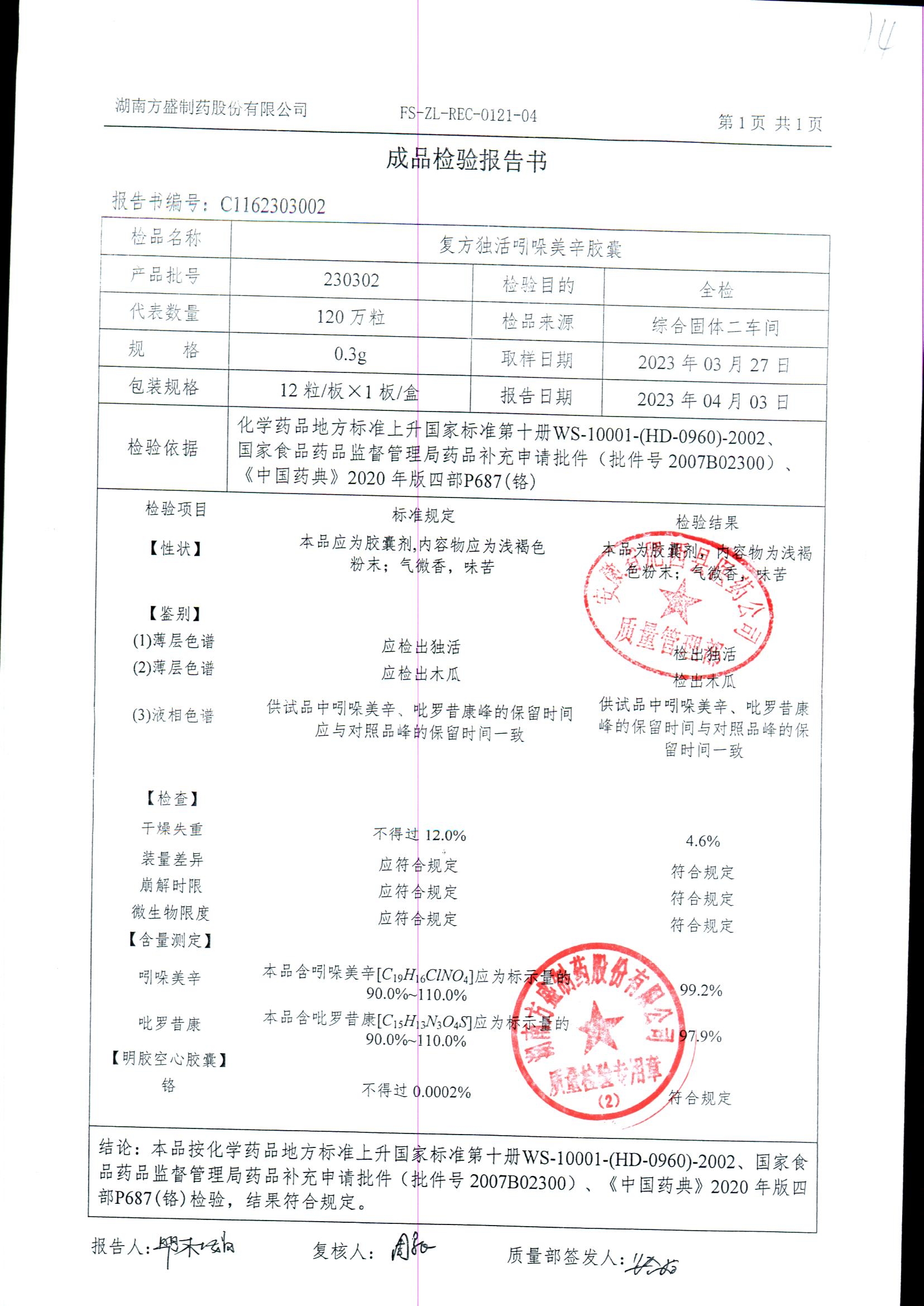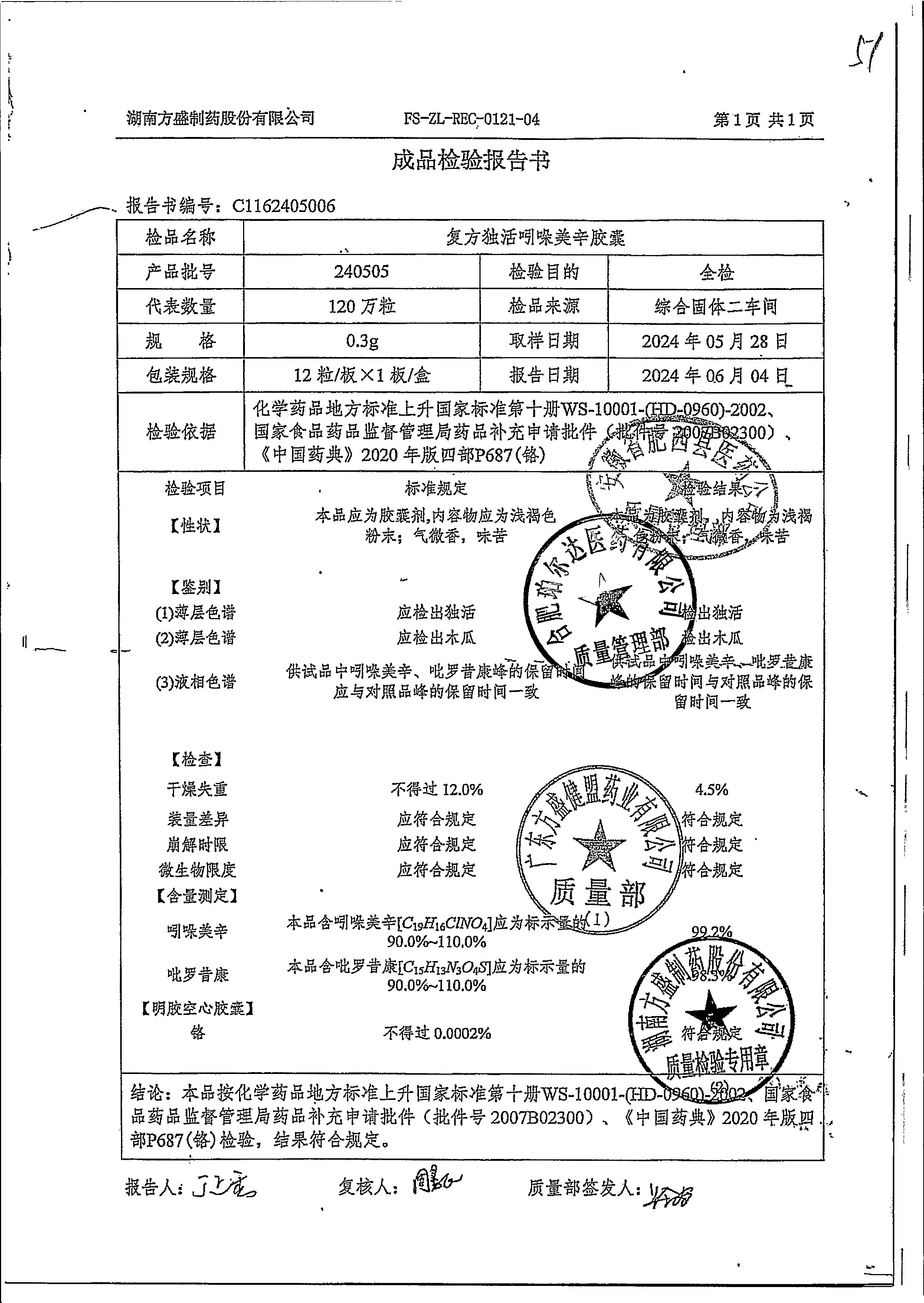 复方独活吲哚美辛胶囊 | 0.3g*12粒 | 240505 | 查看详情 |