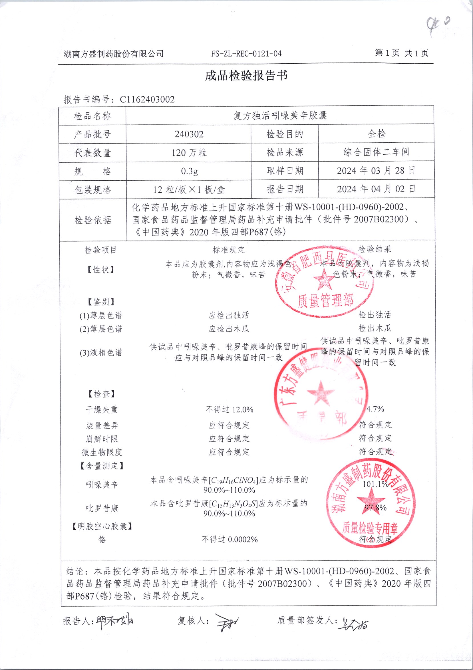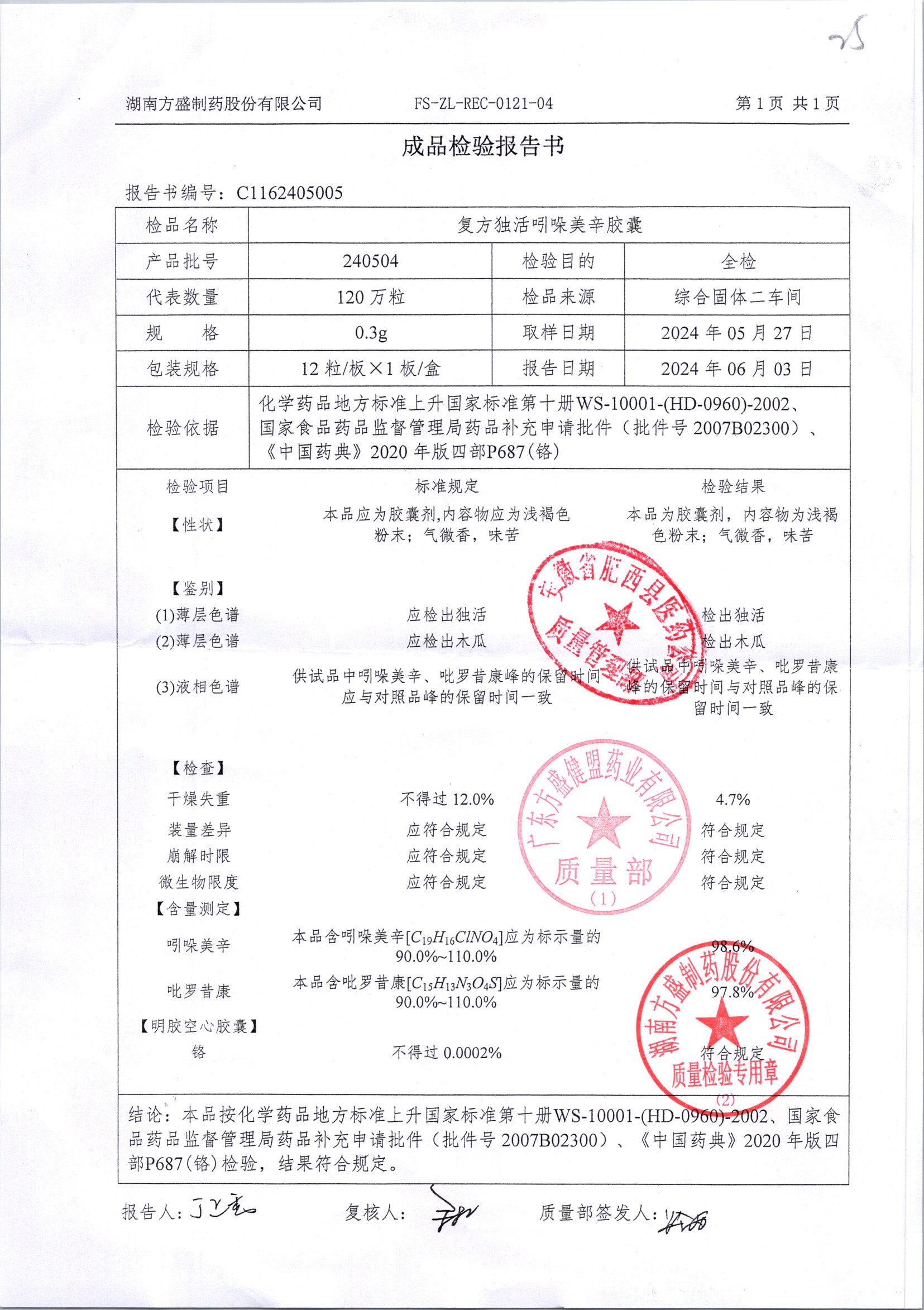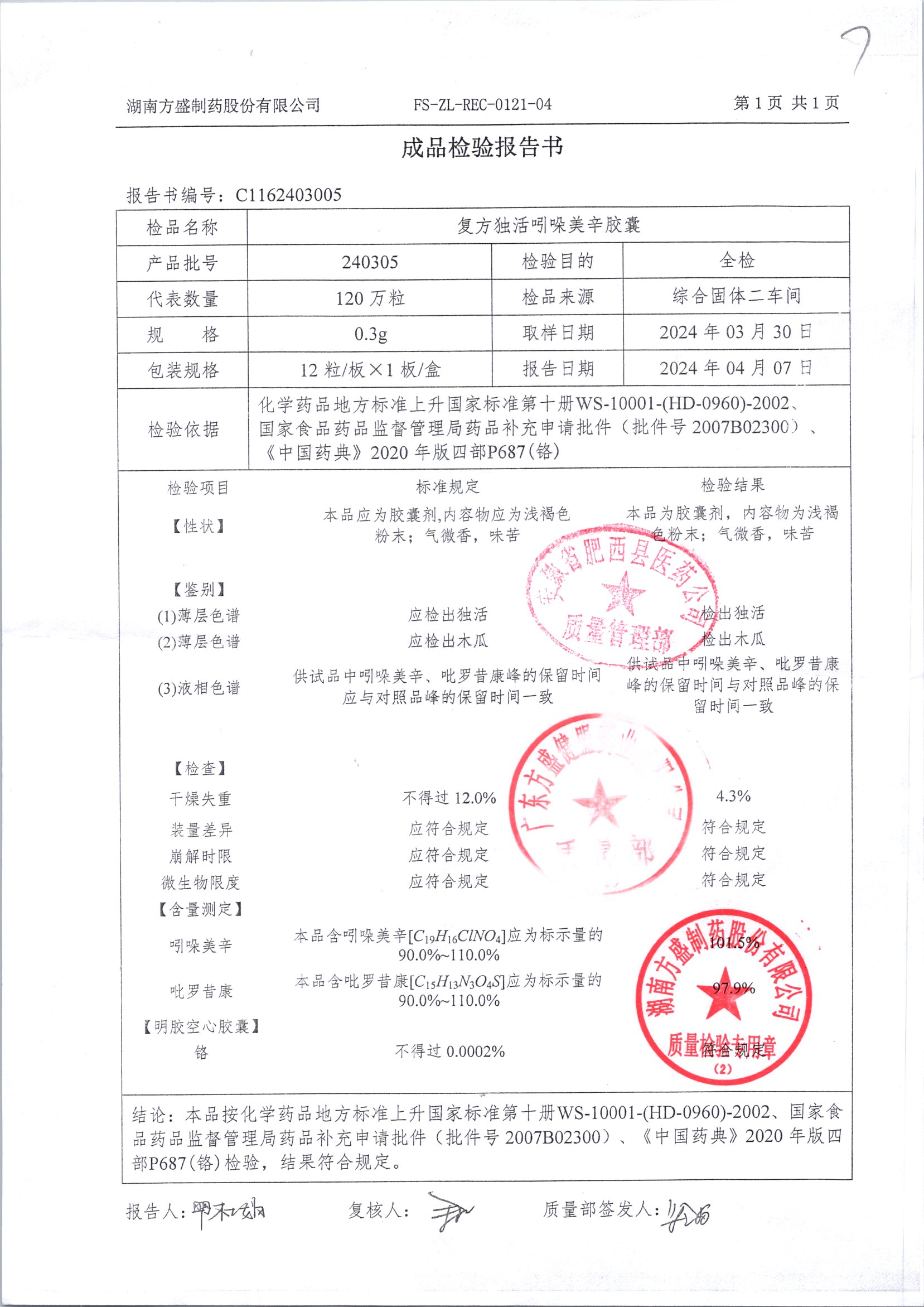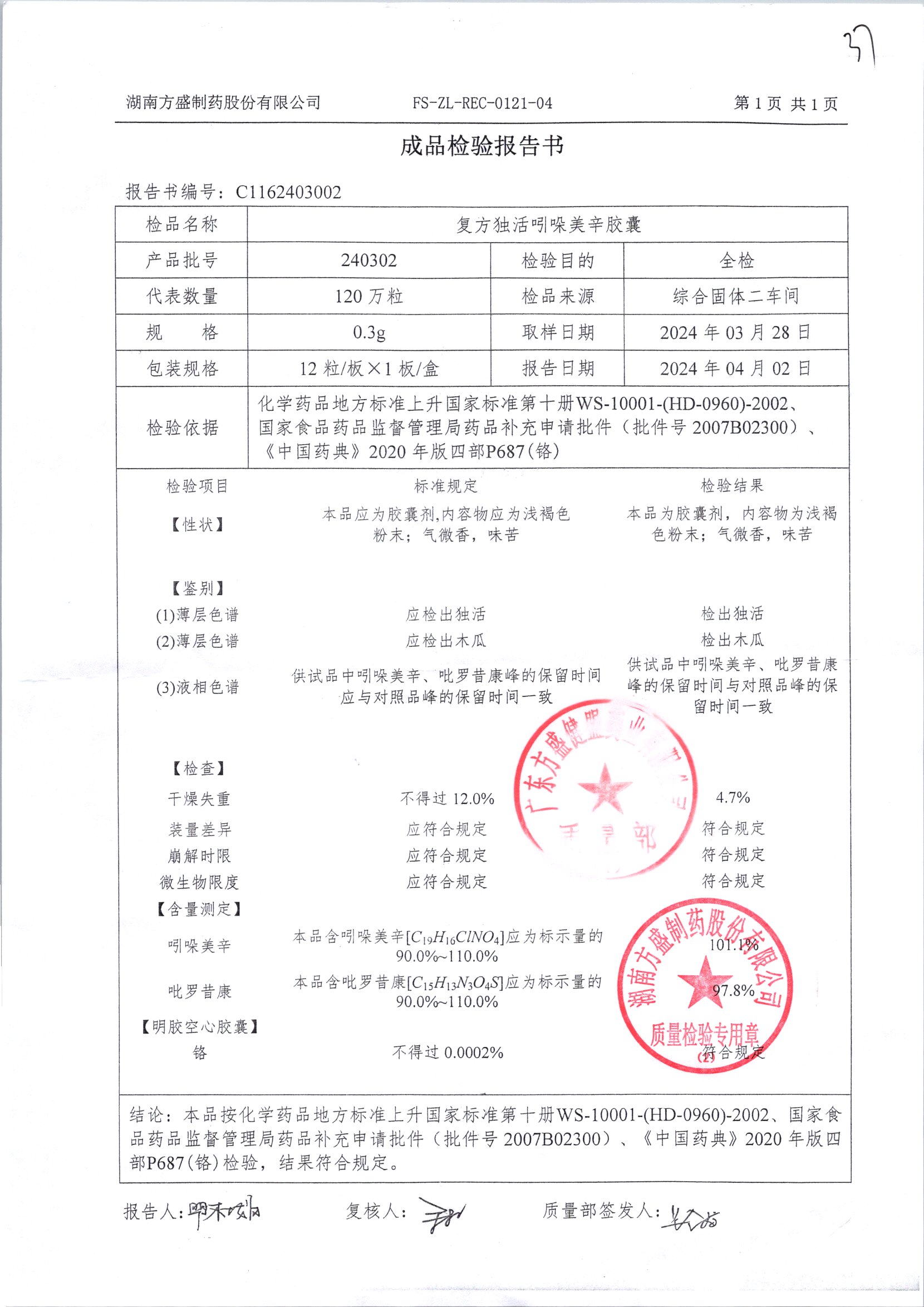 复方独活吲哚美辛胶囊 | 0.3g*12粒 | 240505 | 查看详情 |