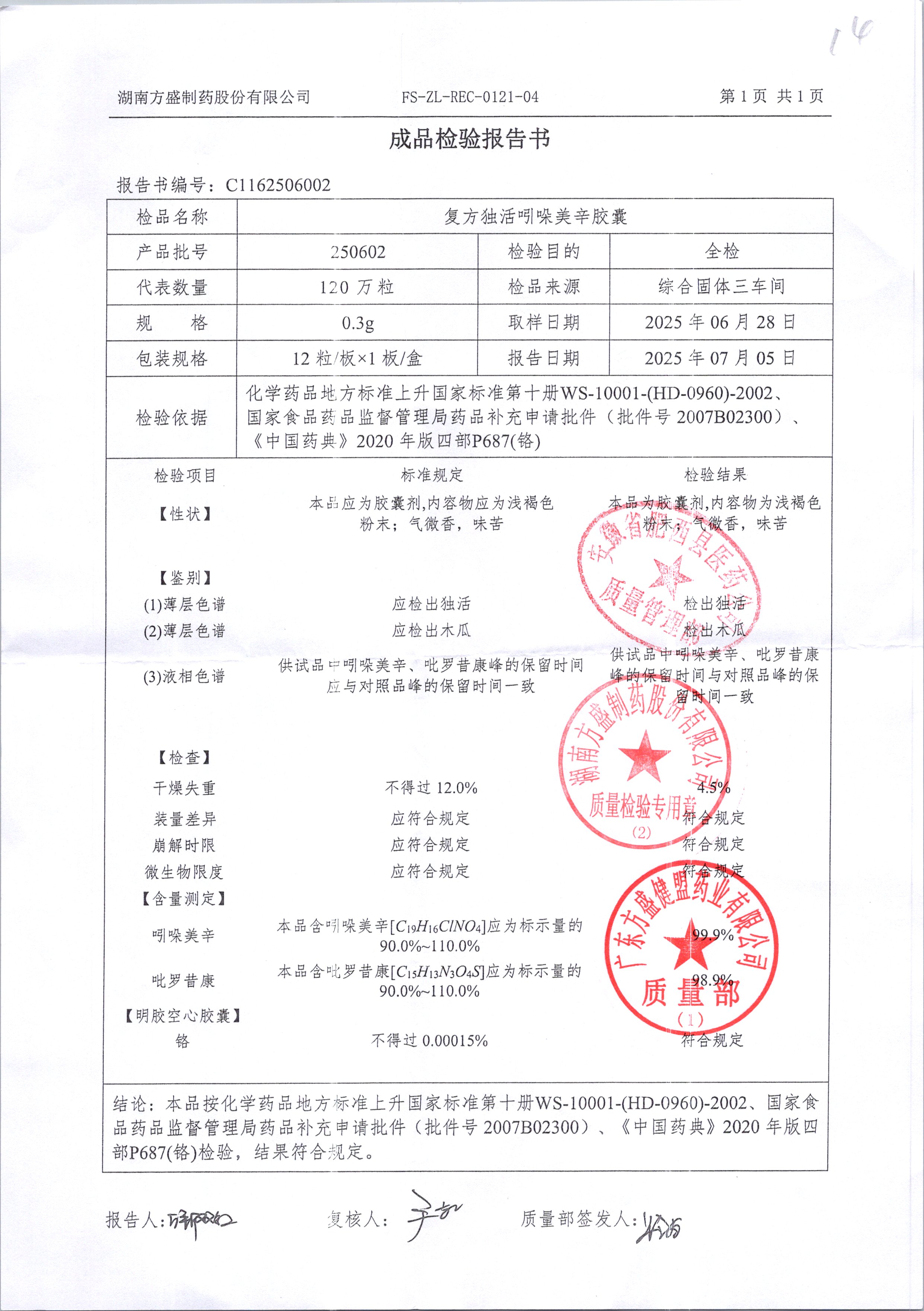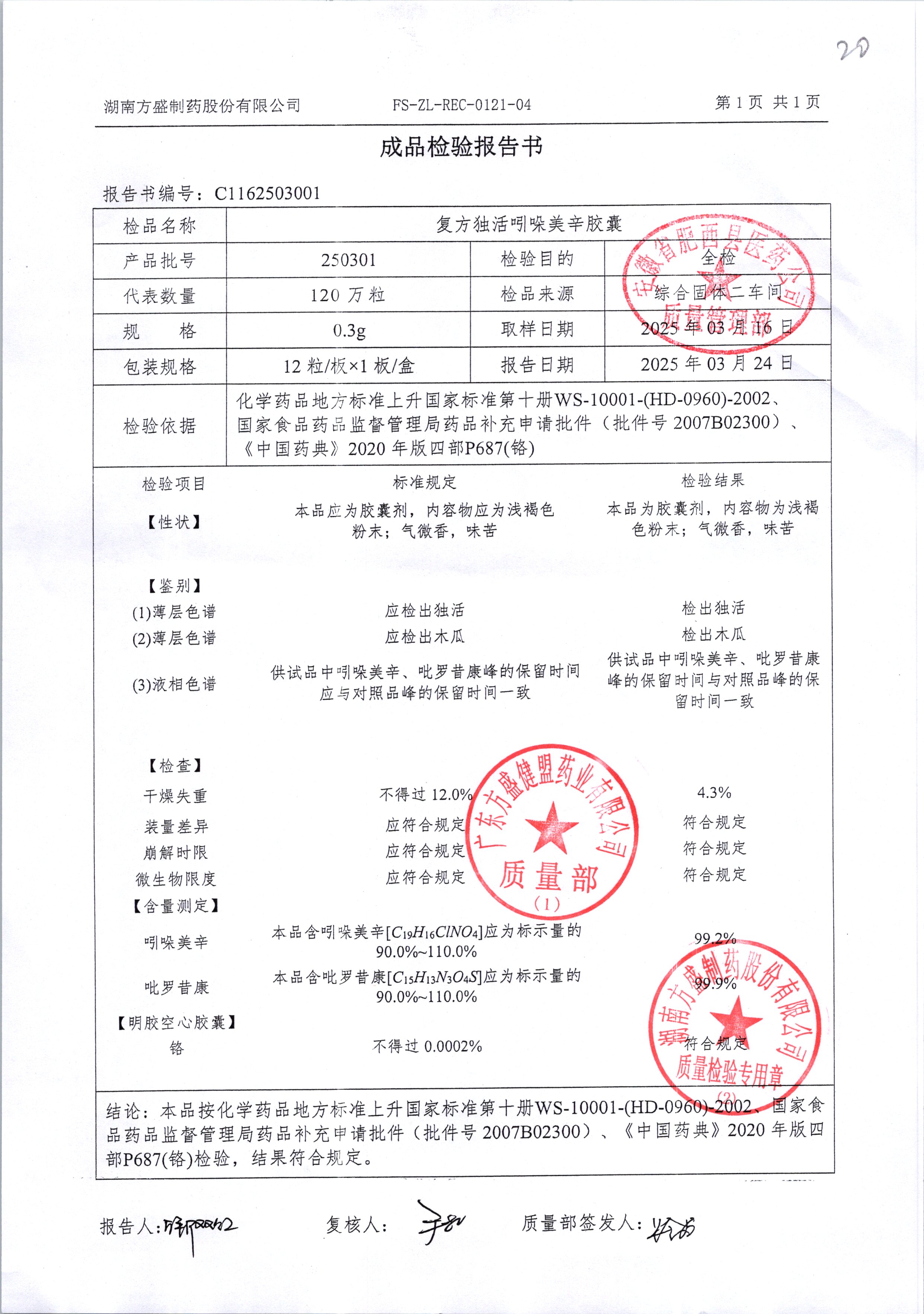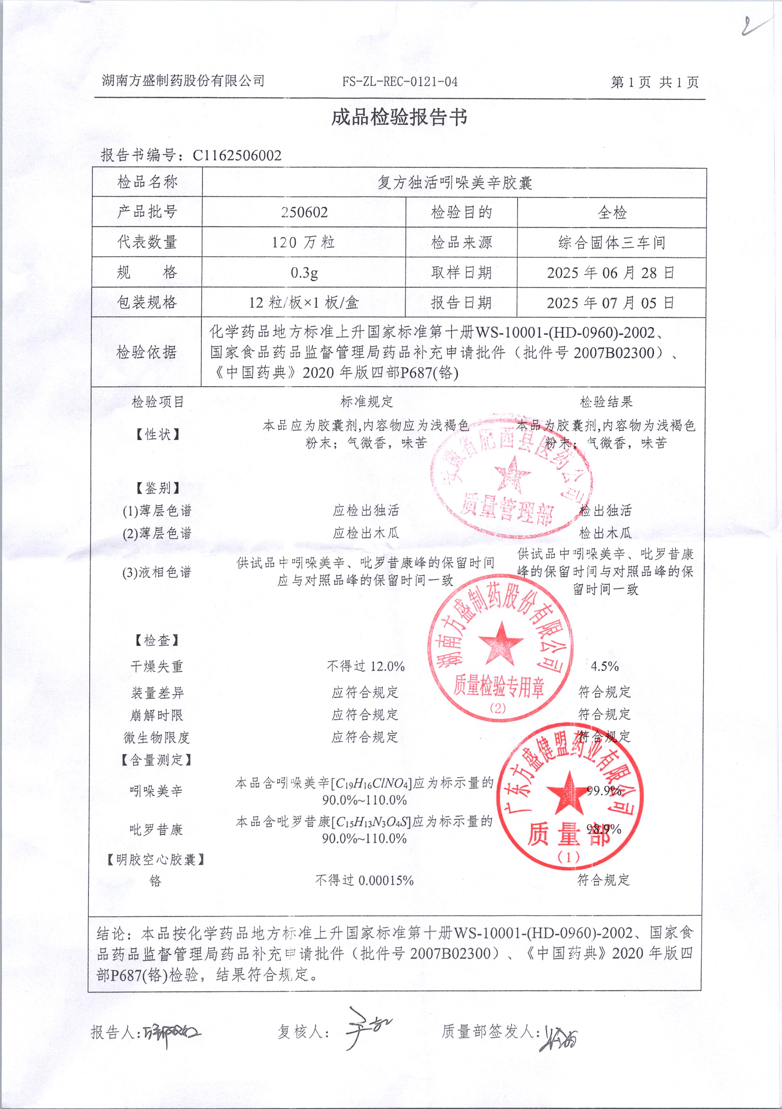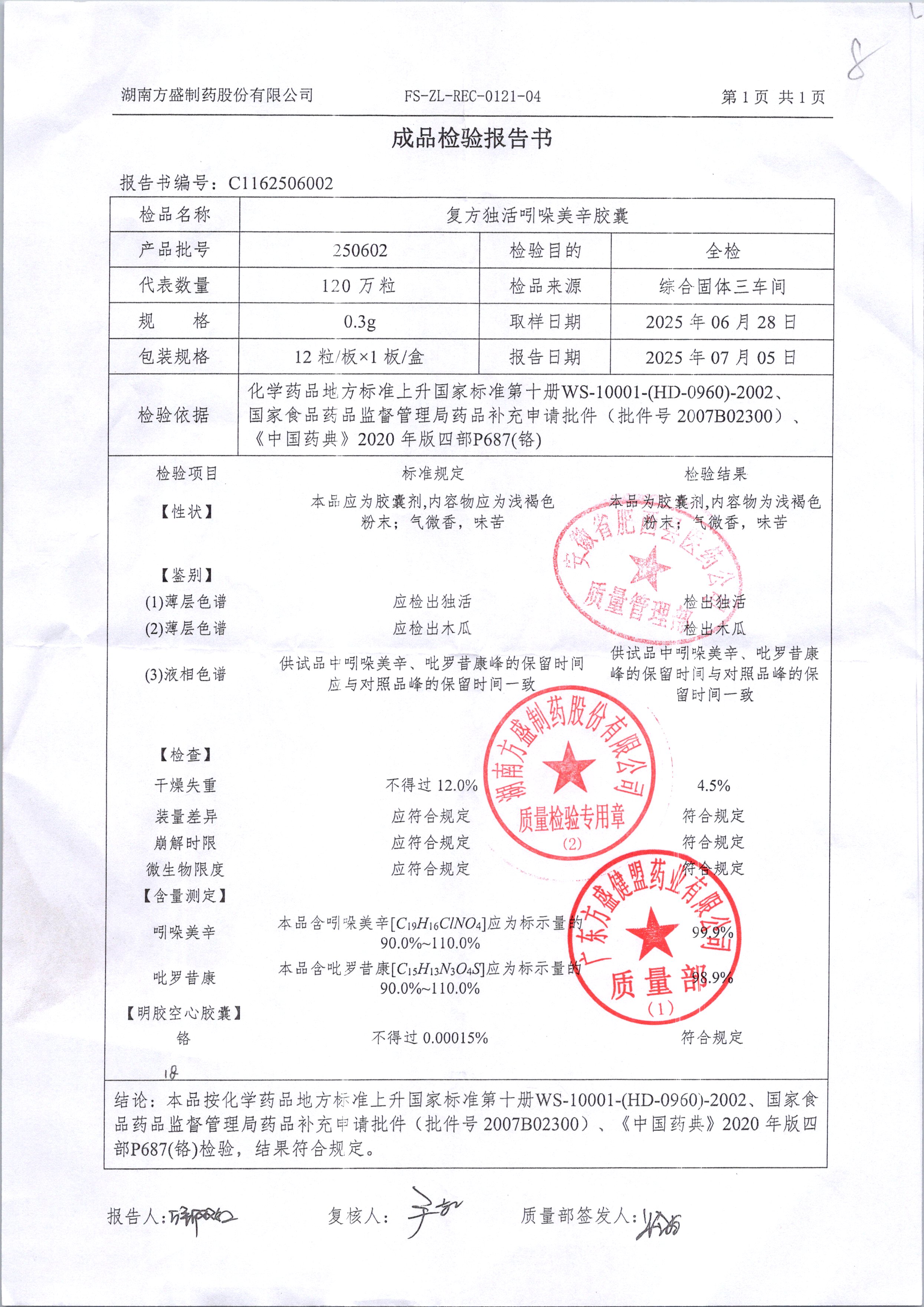 复方独活吲哚美辛胶囊 | 0.3g*12粒 | 250702 | 查看详情 |