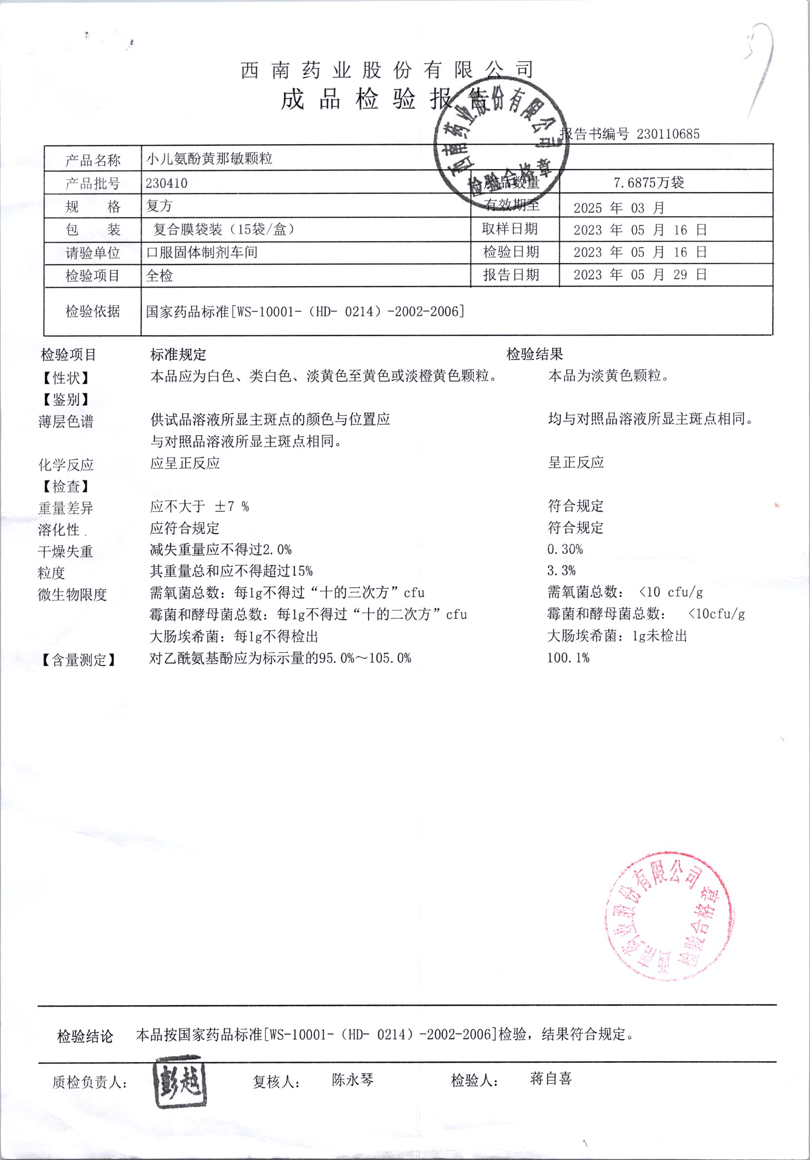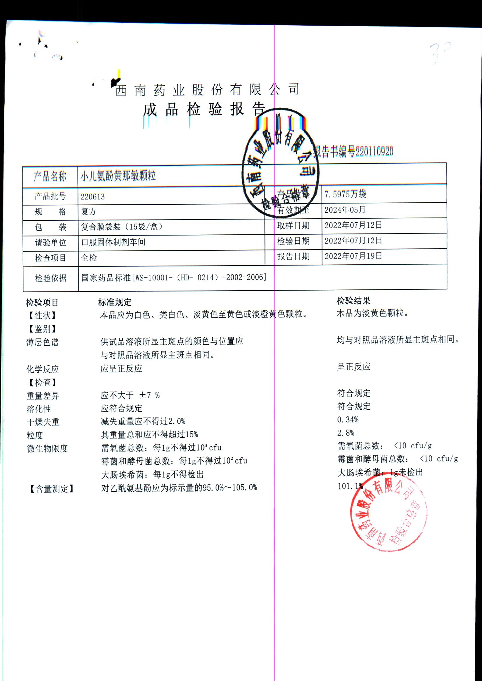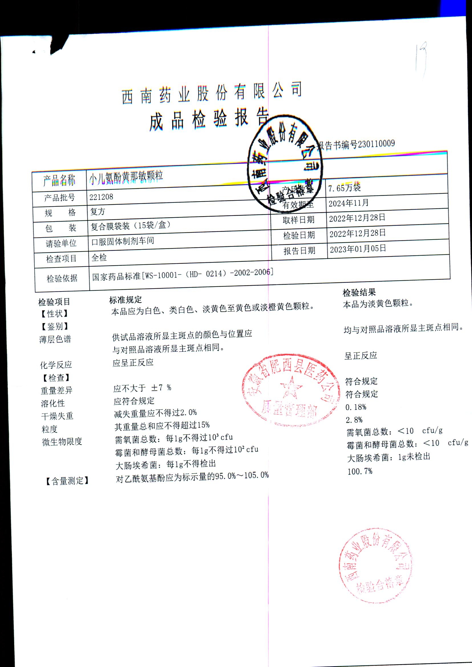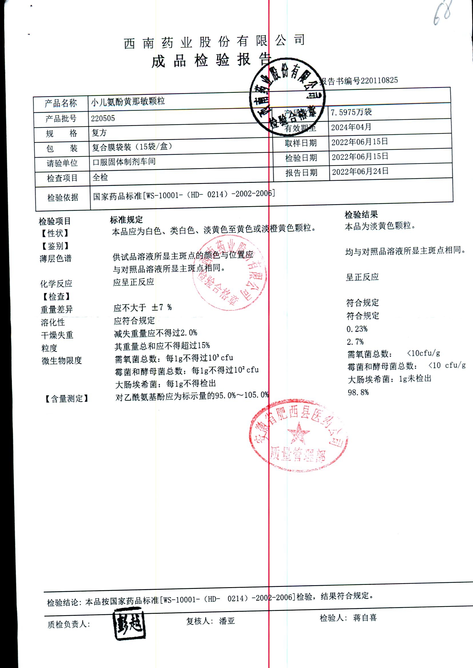 小儿氨酚黄那敏颗粒 | 复方 15袋 | 220506 | 查看详情 |