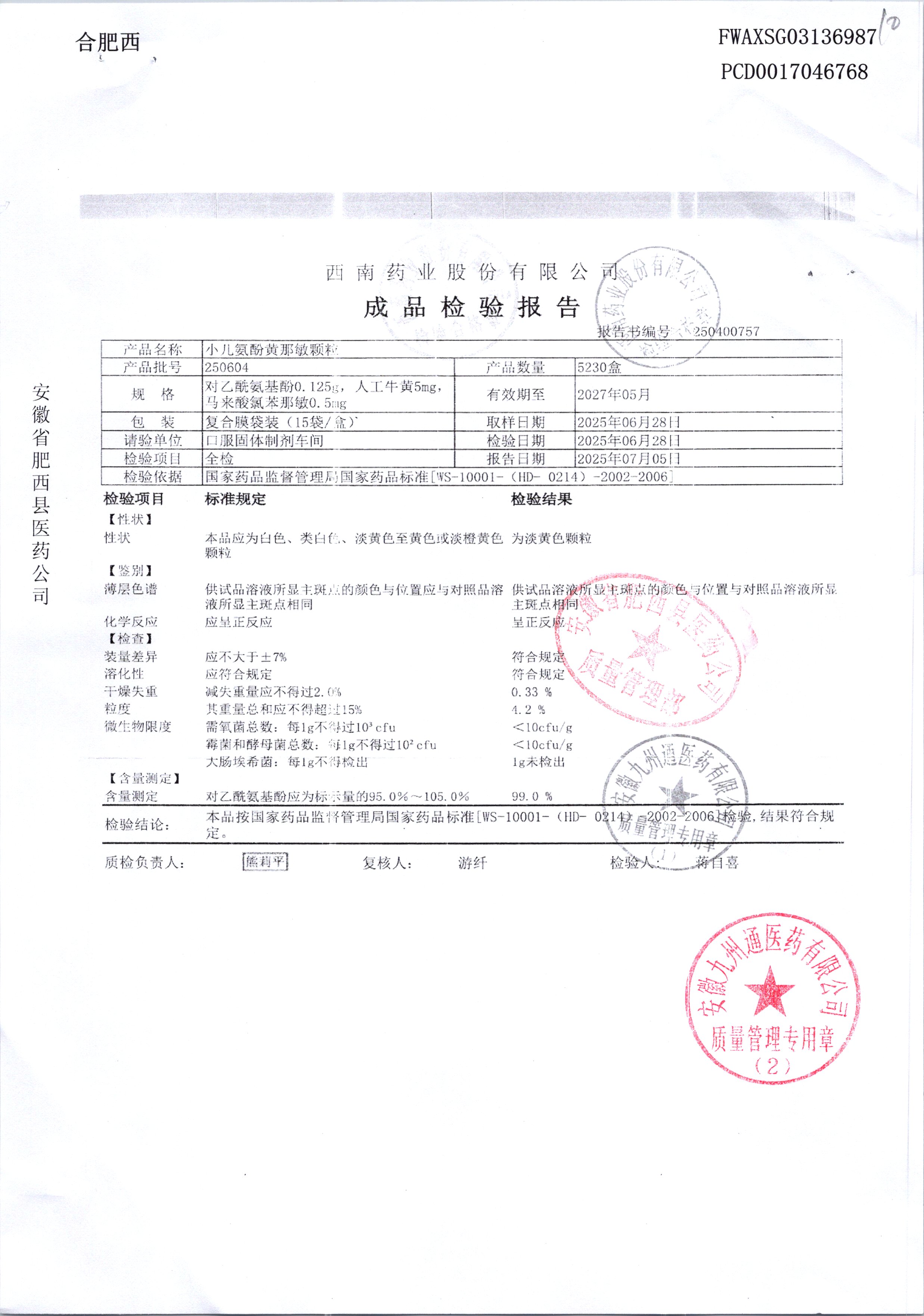 小儿氨酚黄那敏颗粒 | 复方 15袋 | 250604 | 查看详情 |