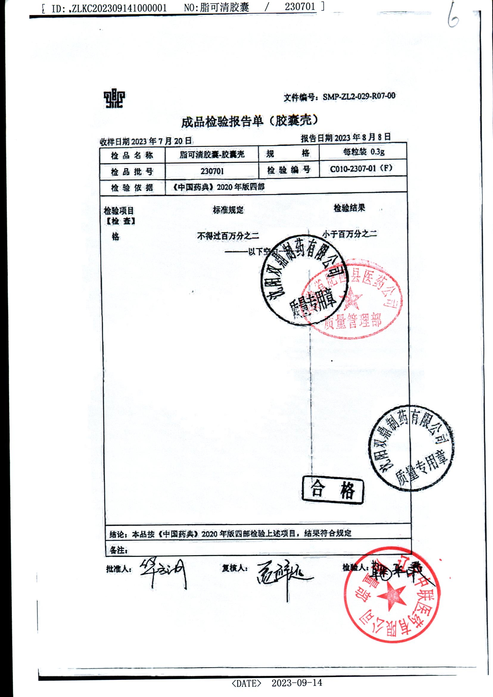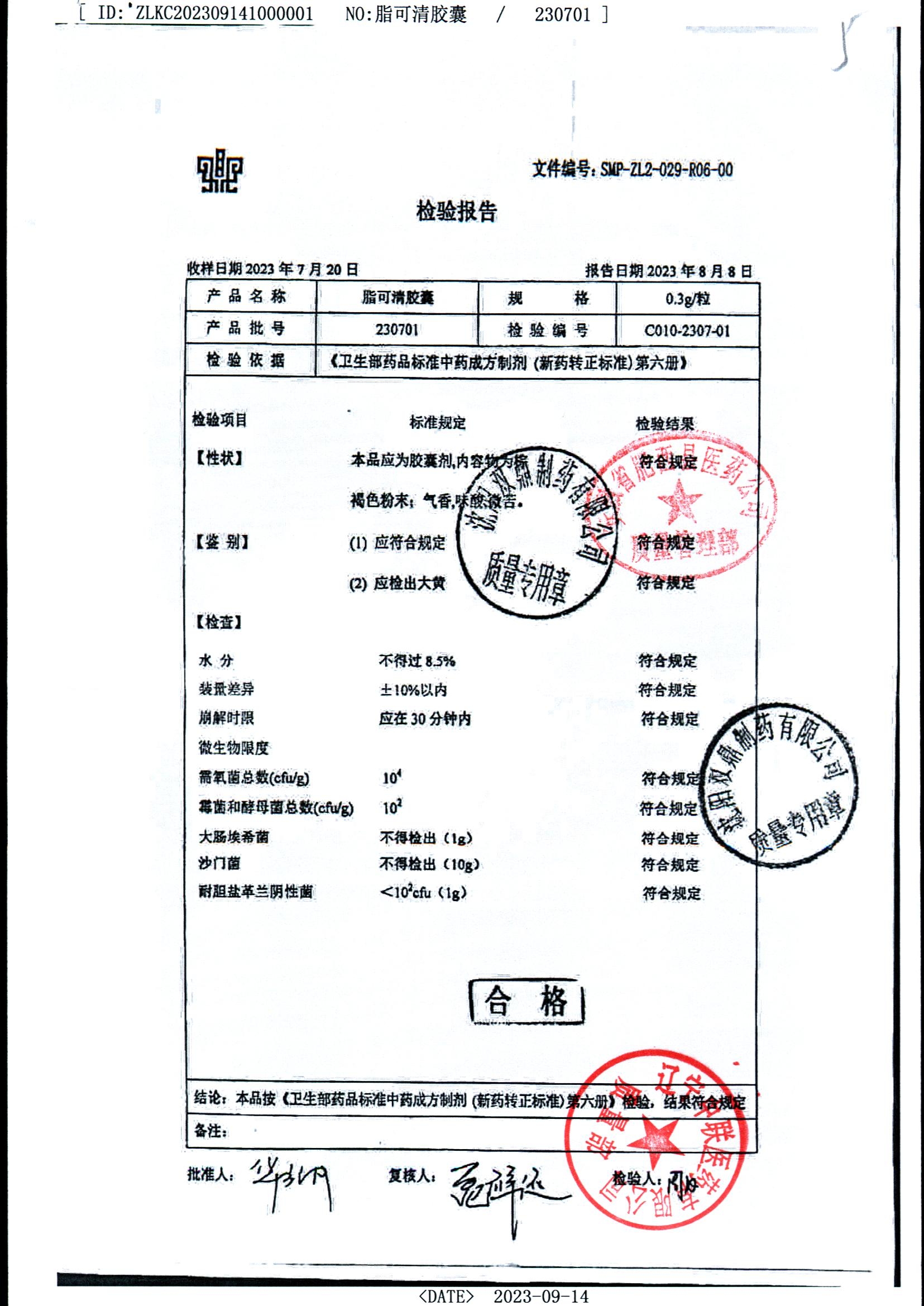 脂可清胶囊 | 0.3g | 230701/2 | 查看详情 |