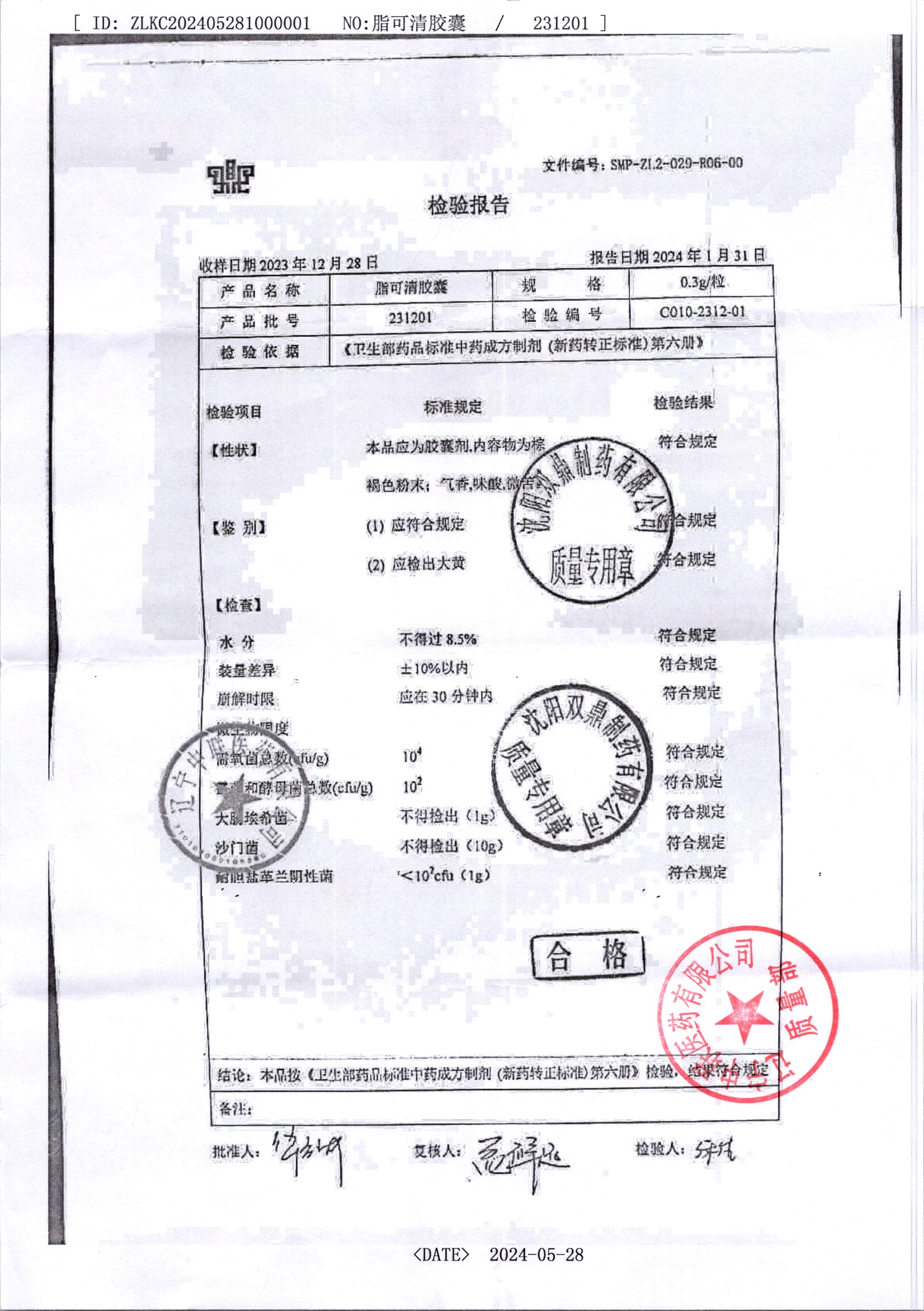 脂可清胶囊 | 0.3g | 240501/1 | 查看详情 |