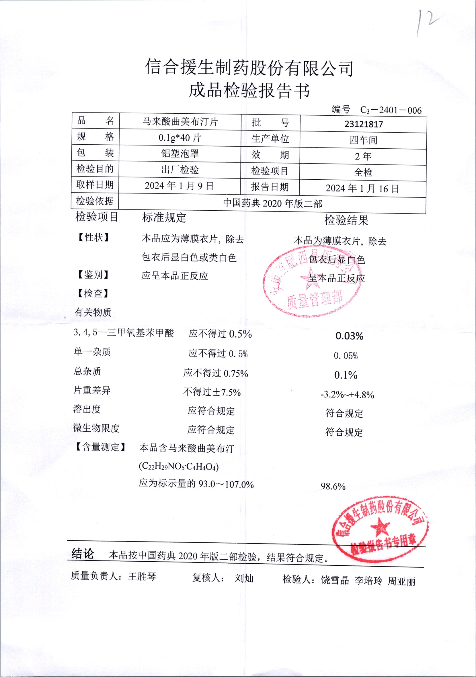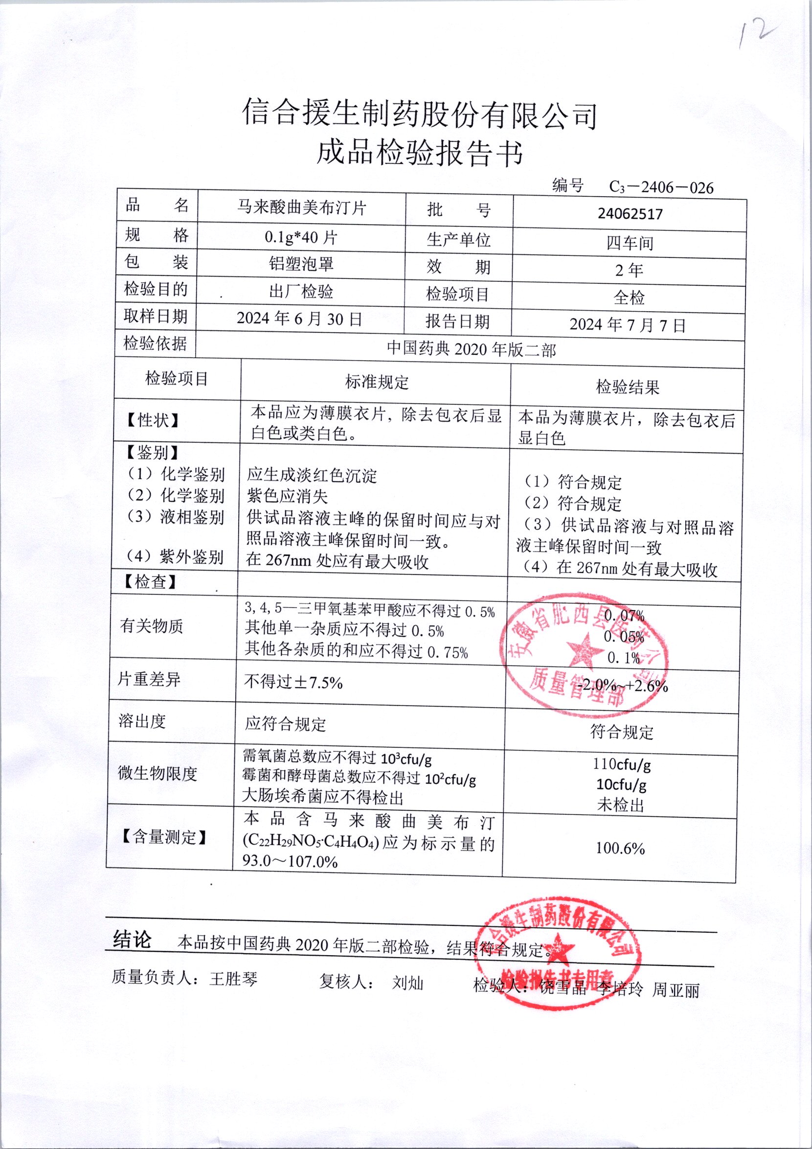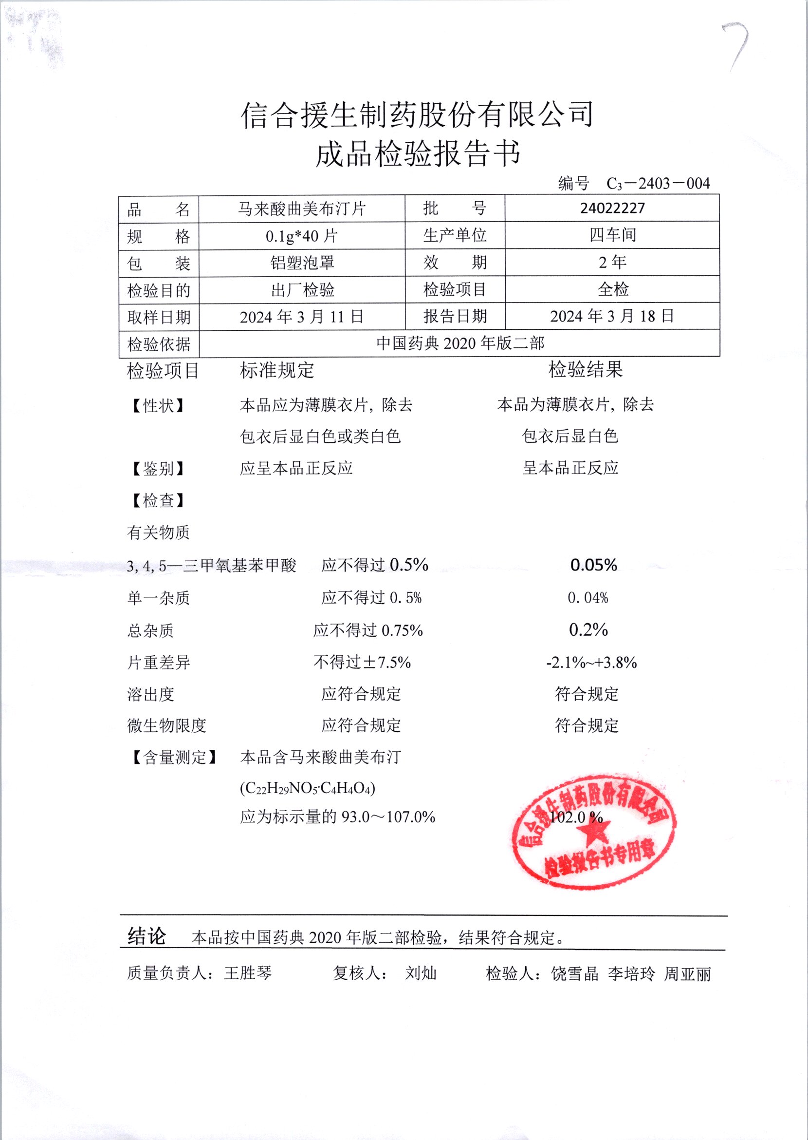 马来酸曲美布汀片 | 0.1g*40片 | 24090317 | 查看详情 |