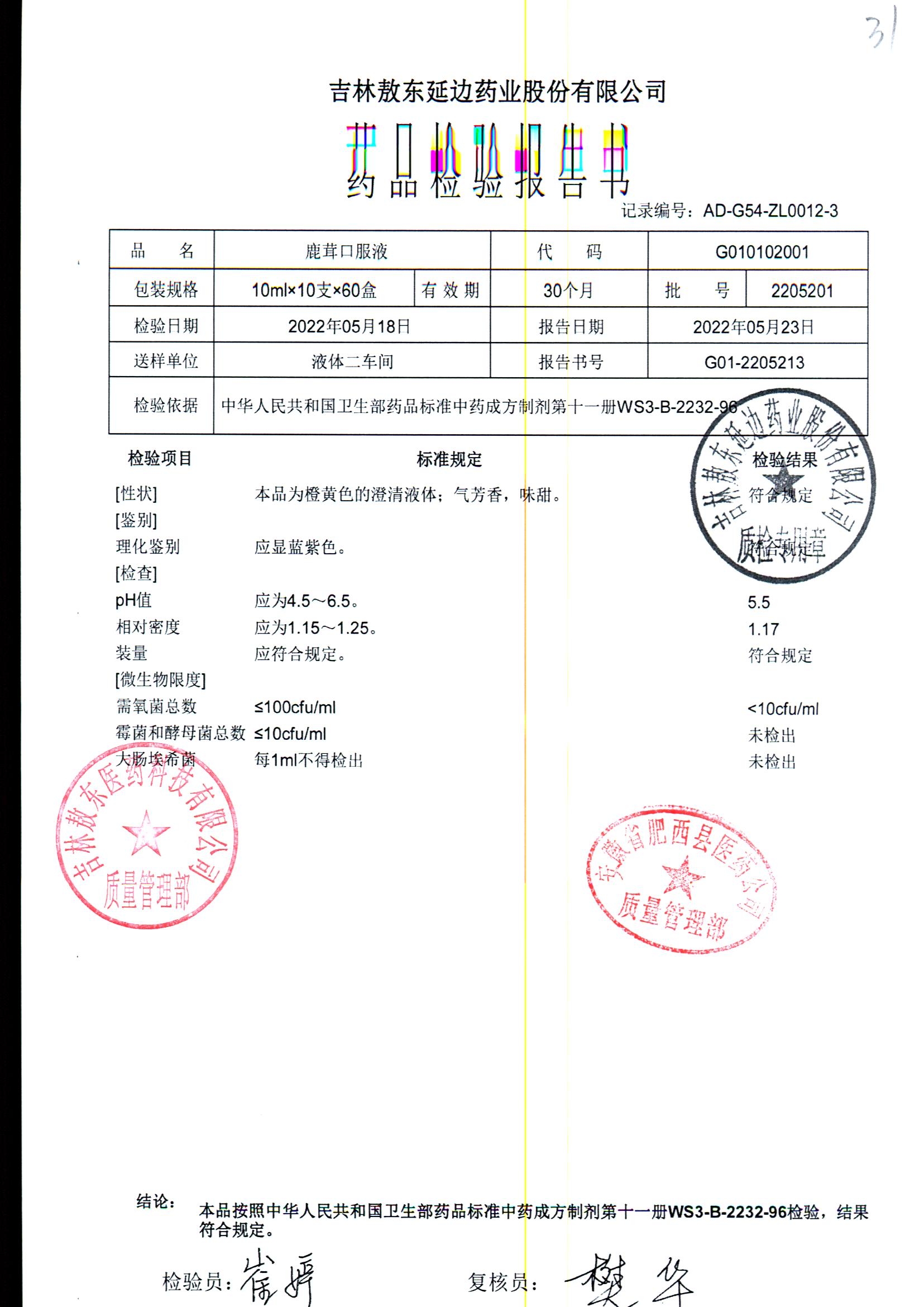 鹿茸口服液 | 10ml*10支*60盒 | 2205201 | 查看详情 |