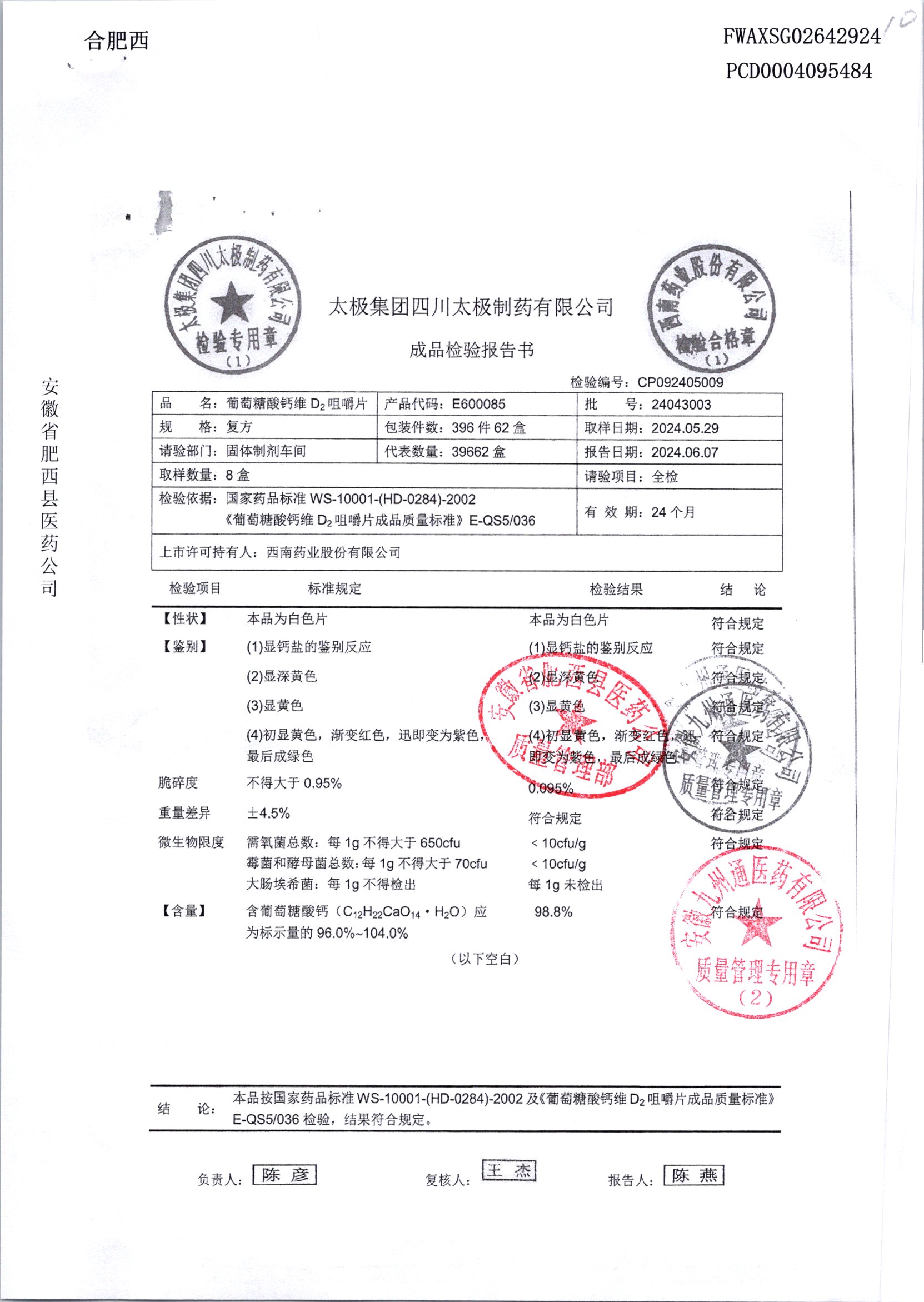 葡萄糖酸钙维D2咀嚼片 | 48片 | 24033002/2 | 查看详情 |