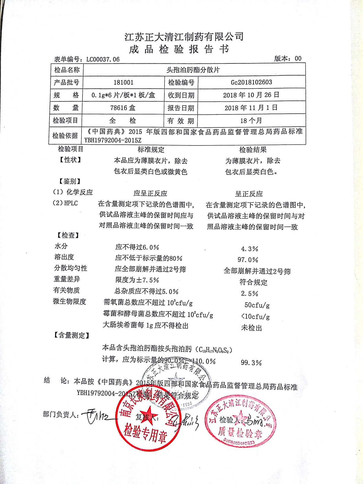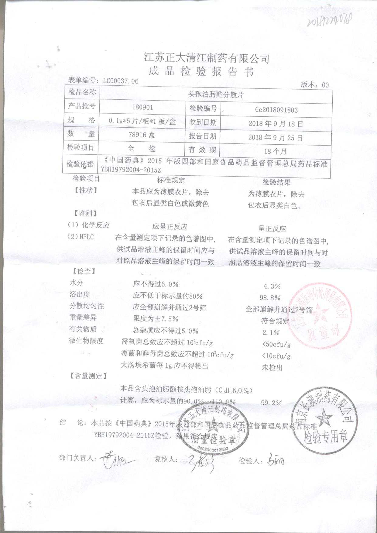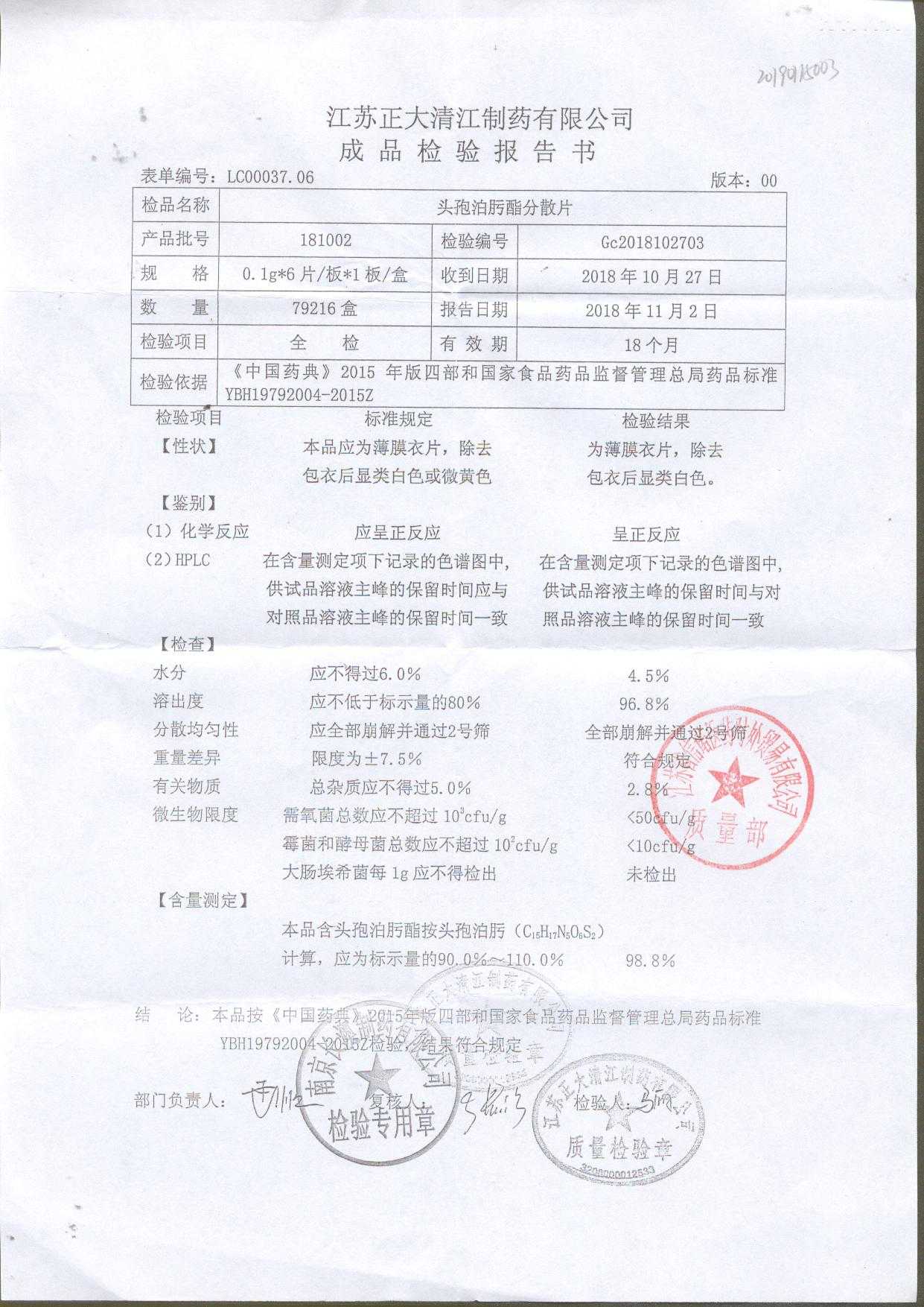 | 头孢泊肟酯分散片 | 0.1g*6s | 180901 | 查看详情 |