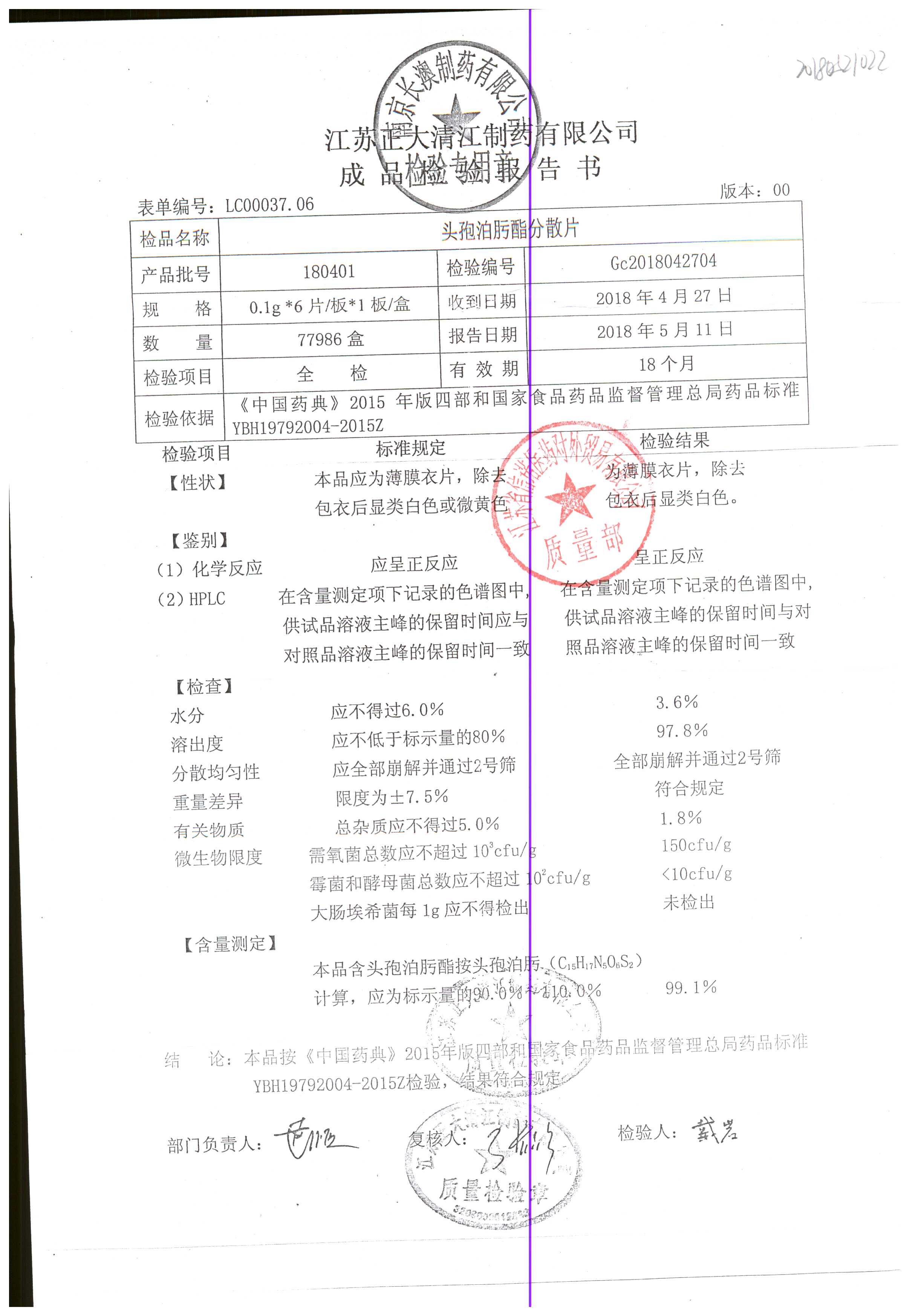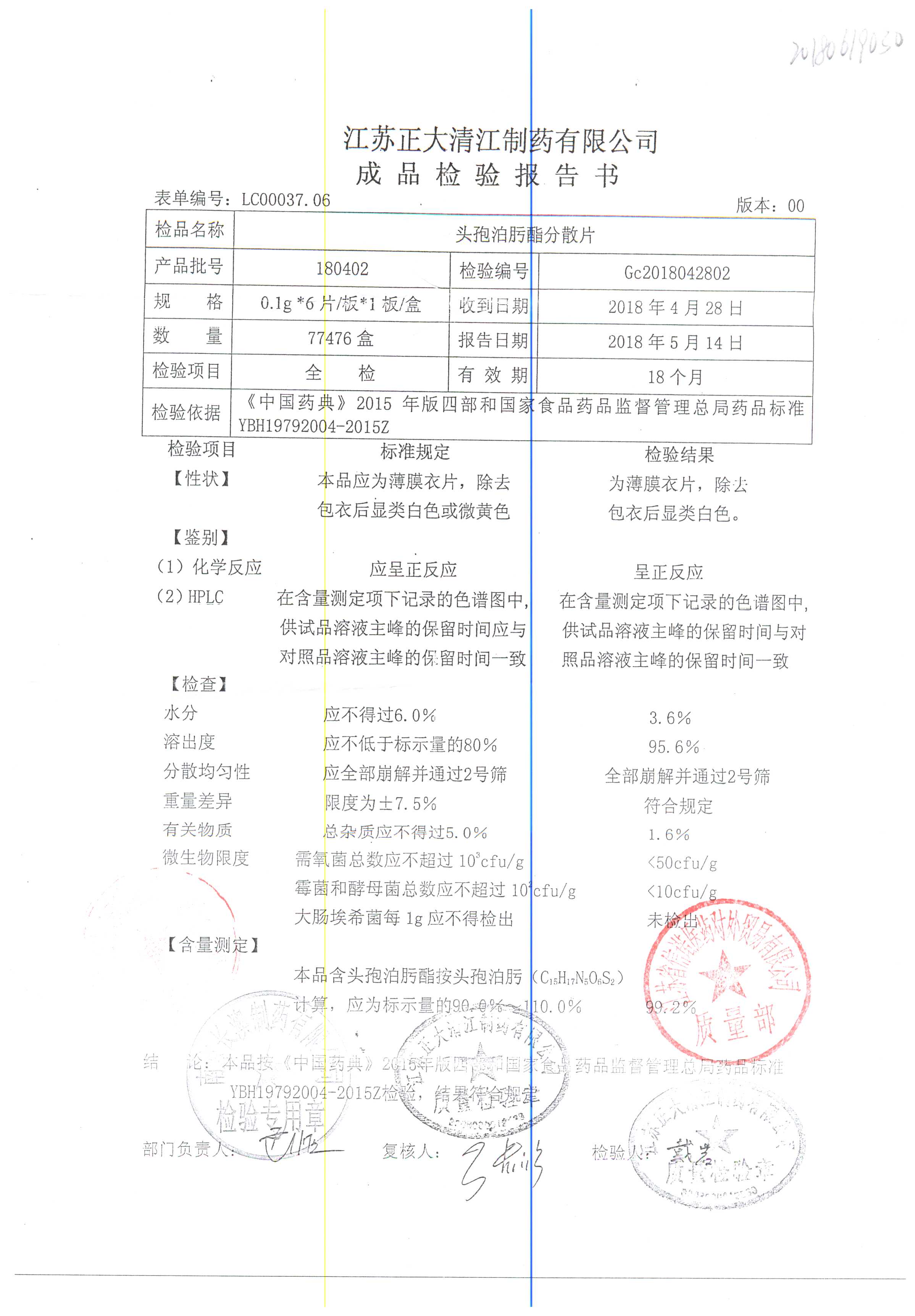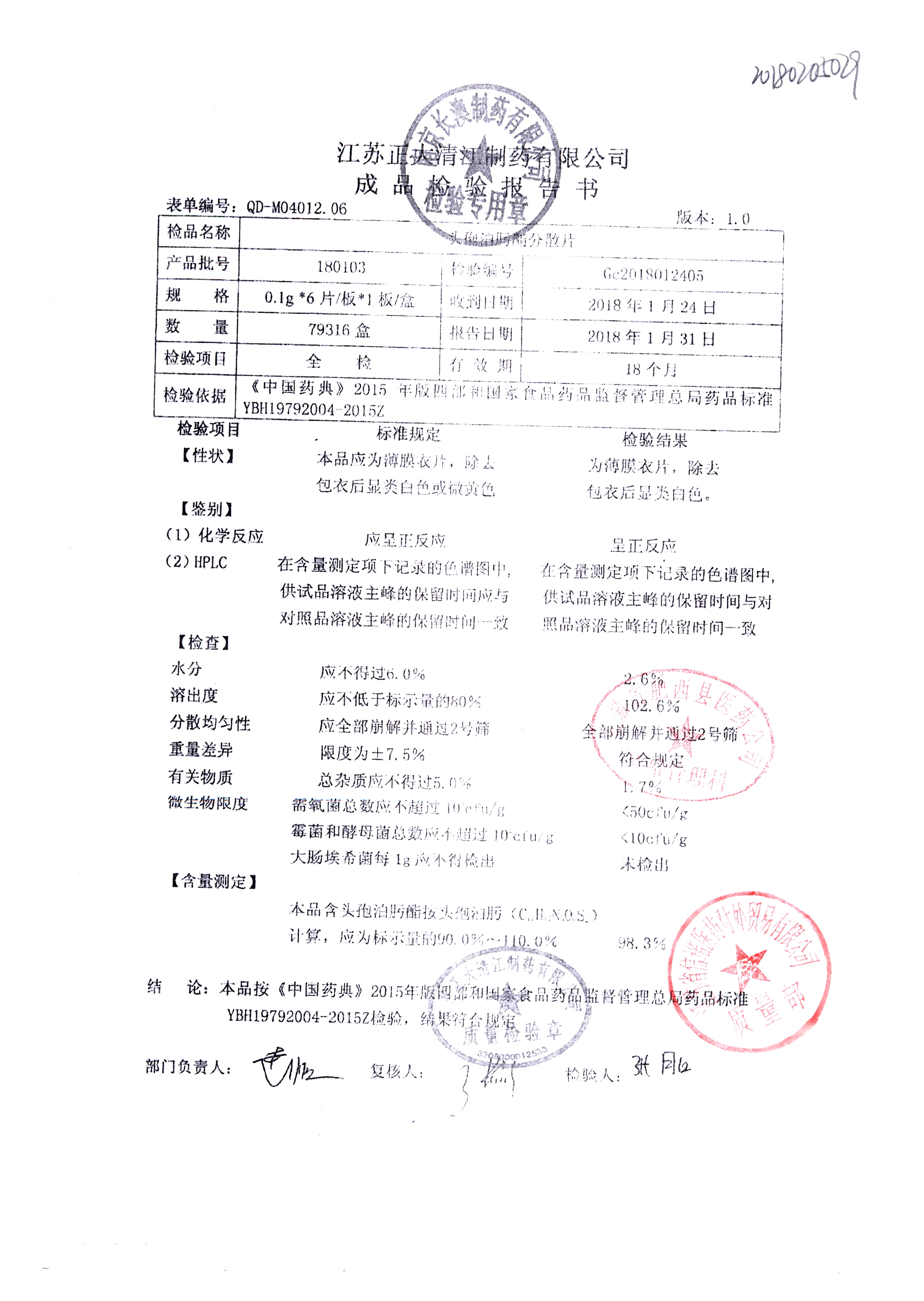 | 头孢泊肟酯分散片 | 0.1g*6s | 180401 | 查看详情 |