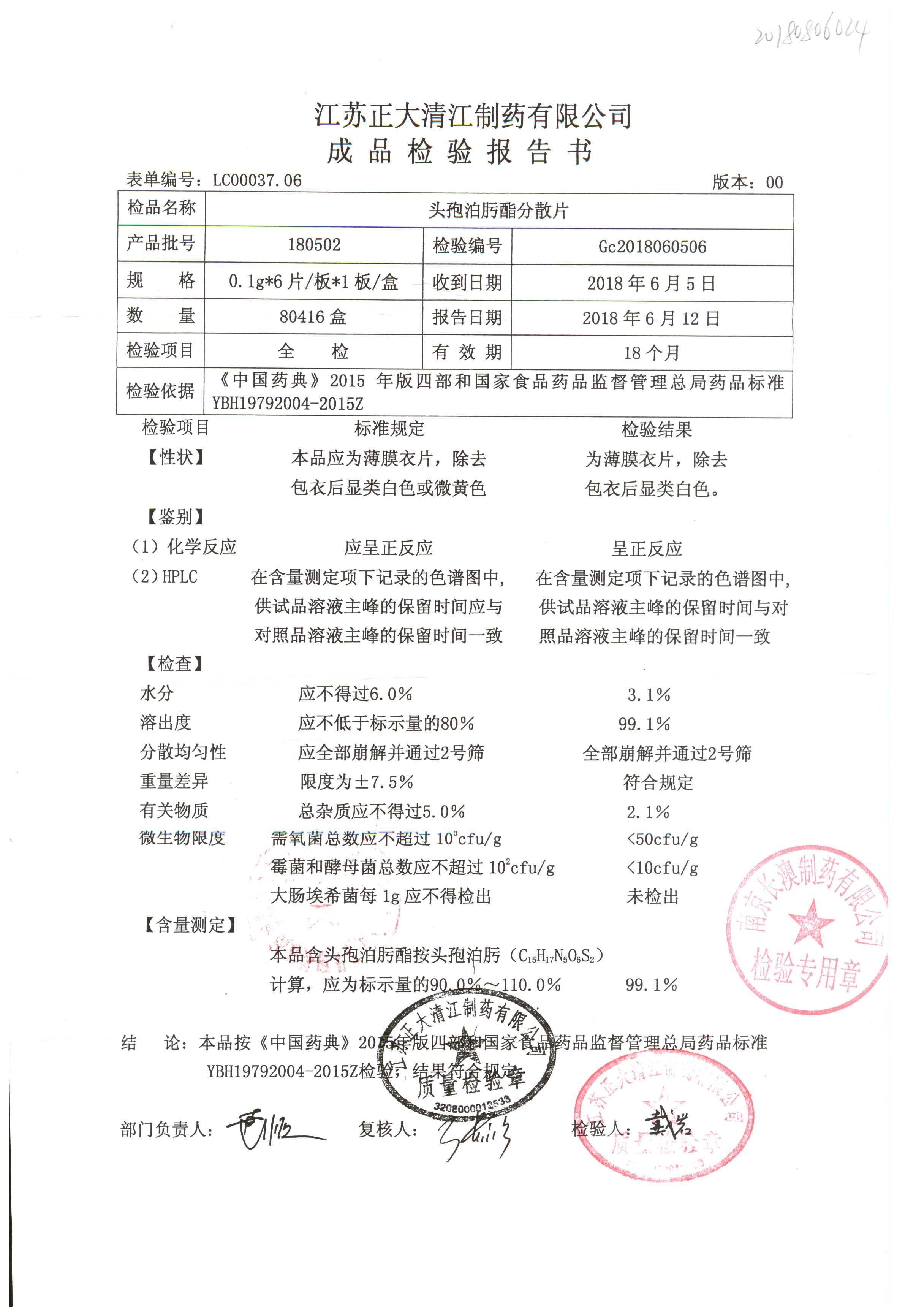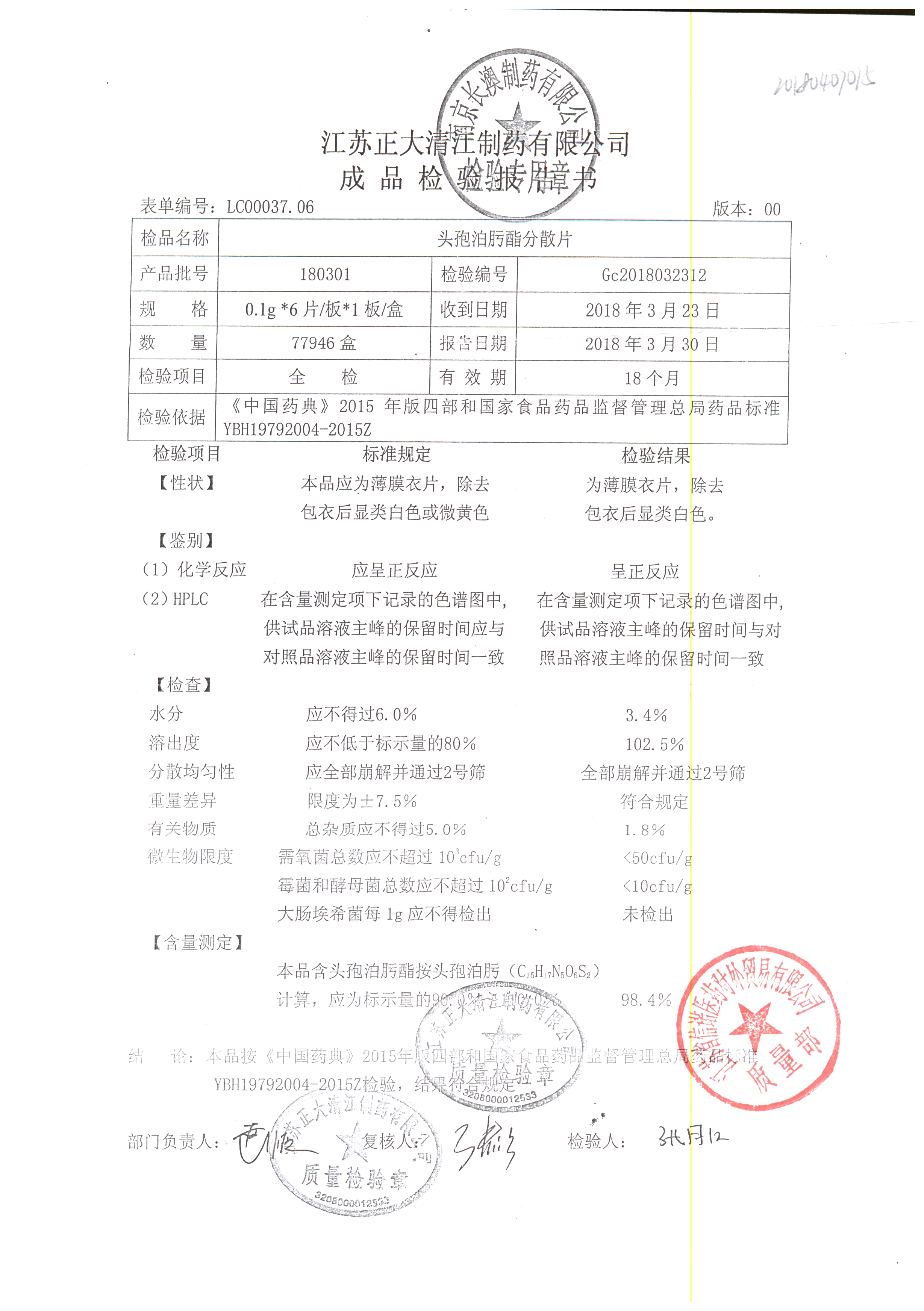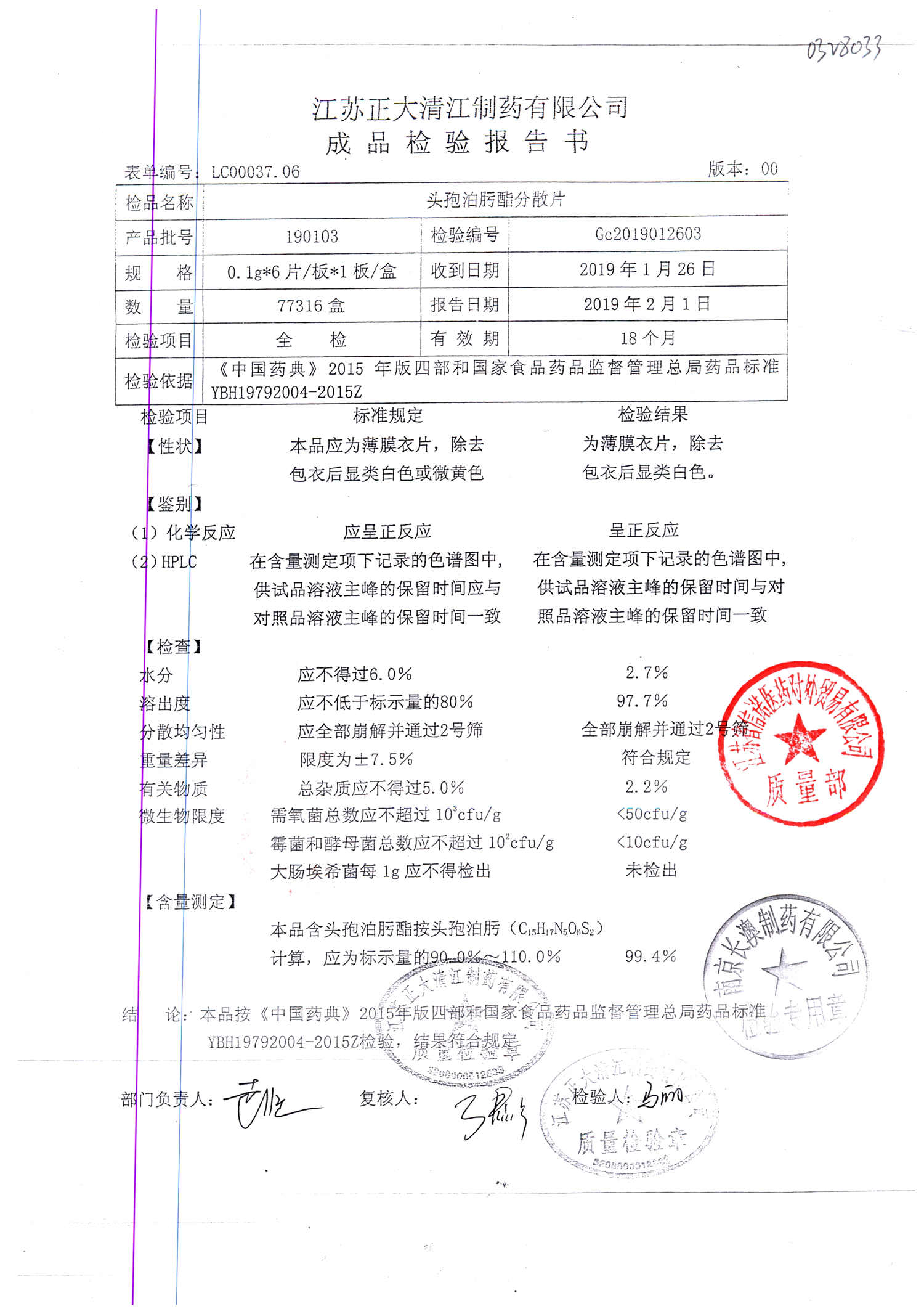 | 头孢泊肟酯分散片 | 0.1g*6s | 180401 | 查看详情 |