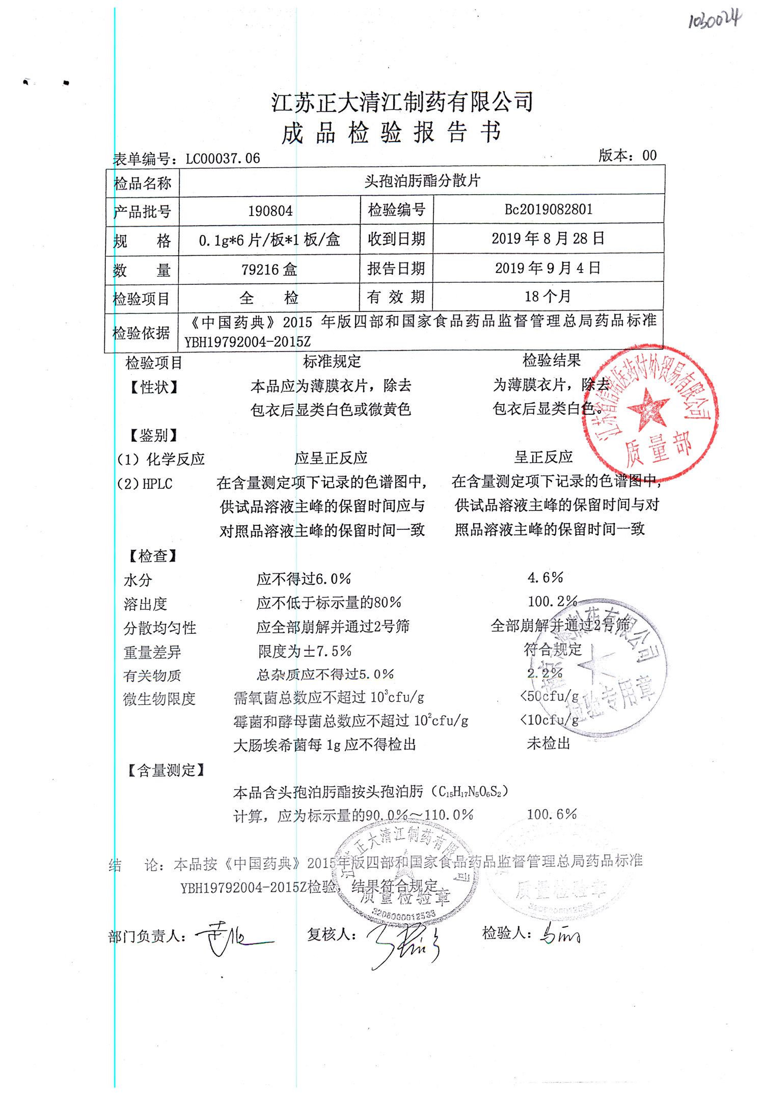 | 头孢泊肟酯分散片 | 0.1g*6s | 190803 | 查看详情 |
