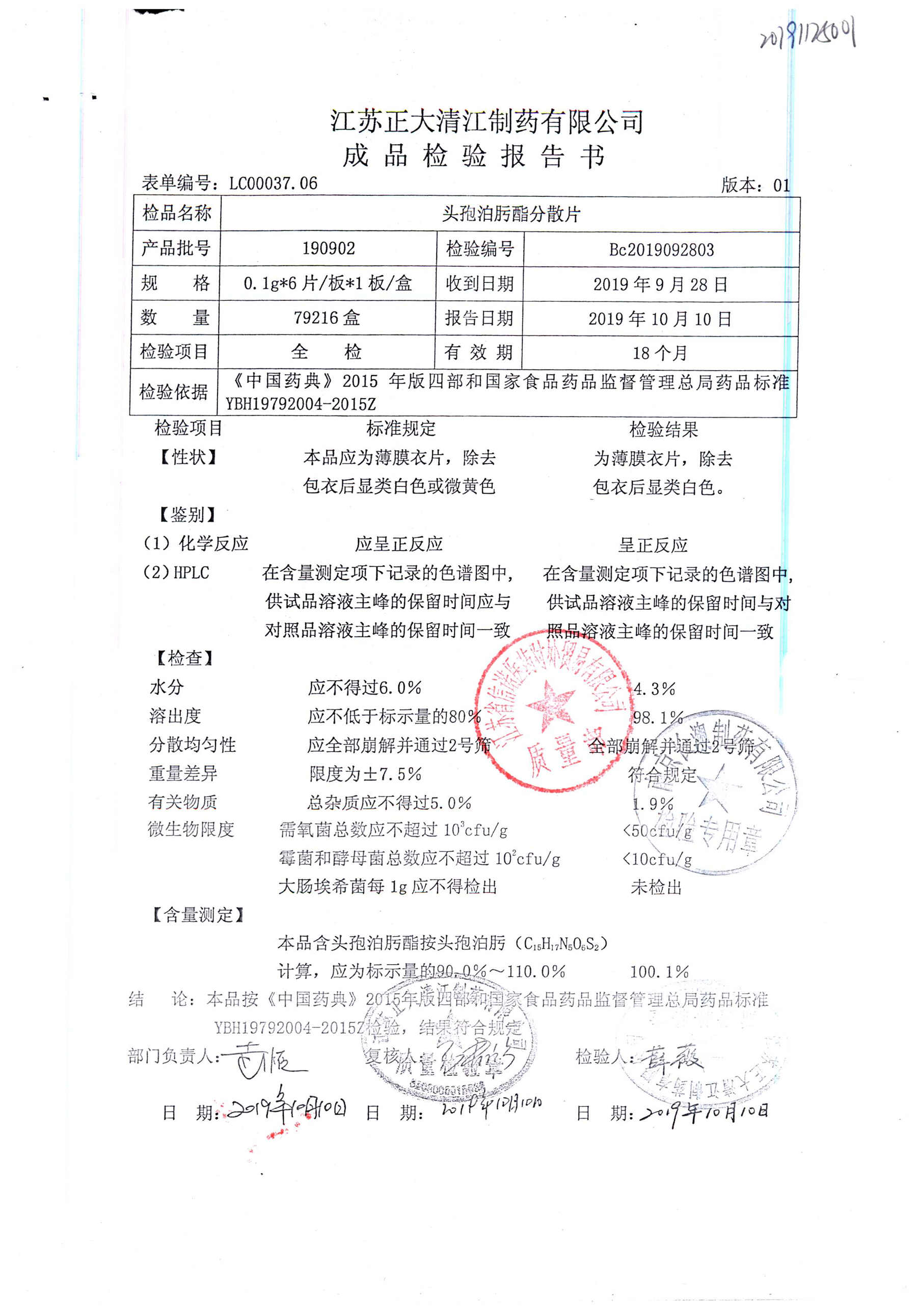 | 头孢泊肟酯分散片 | 0.1g*6s | 190902 | 查看详情 |