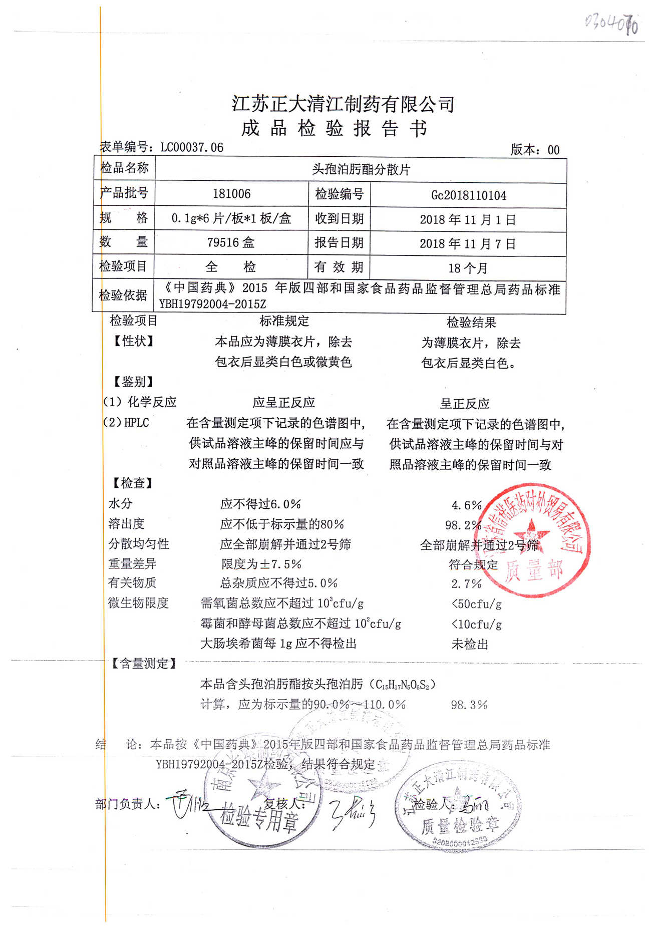 | 头孢泊肟酯分散片 | 0.1g*6s | 180804 | 查看详情 |