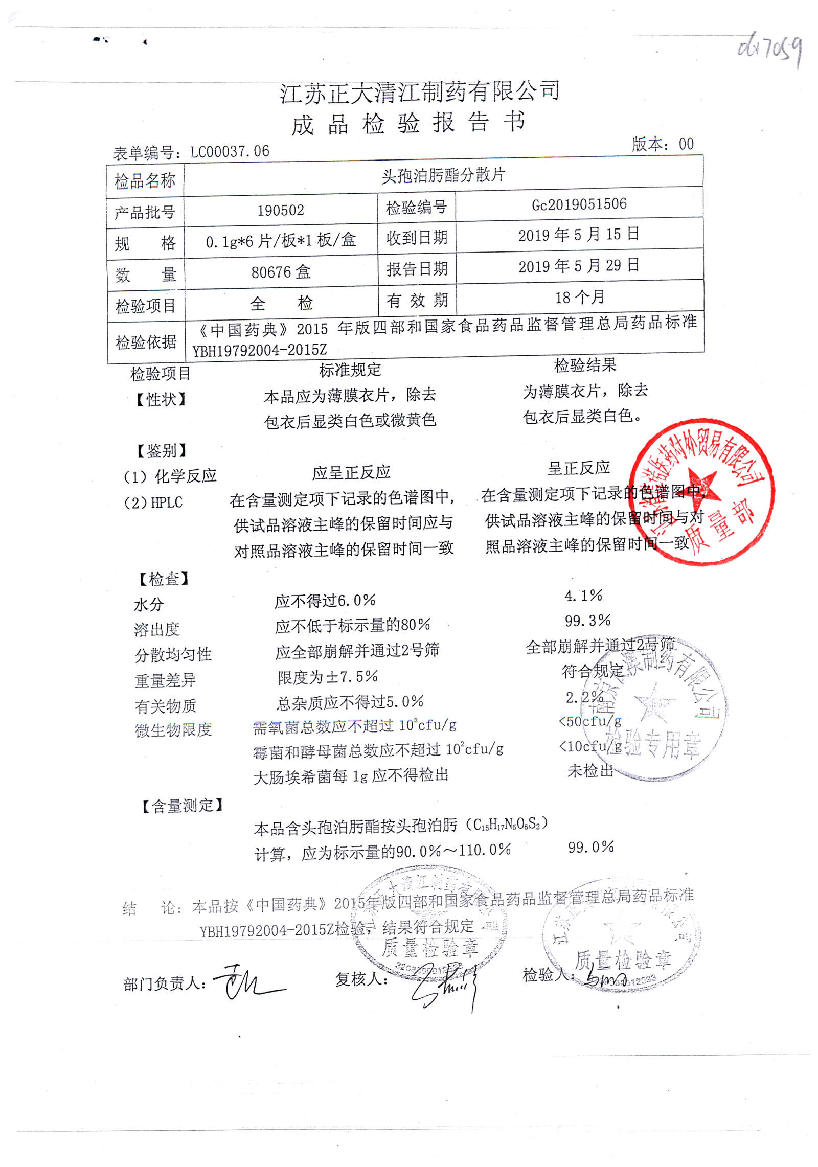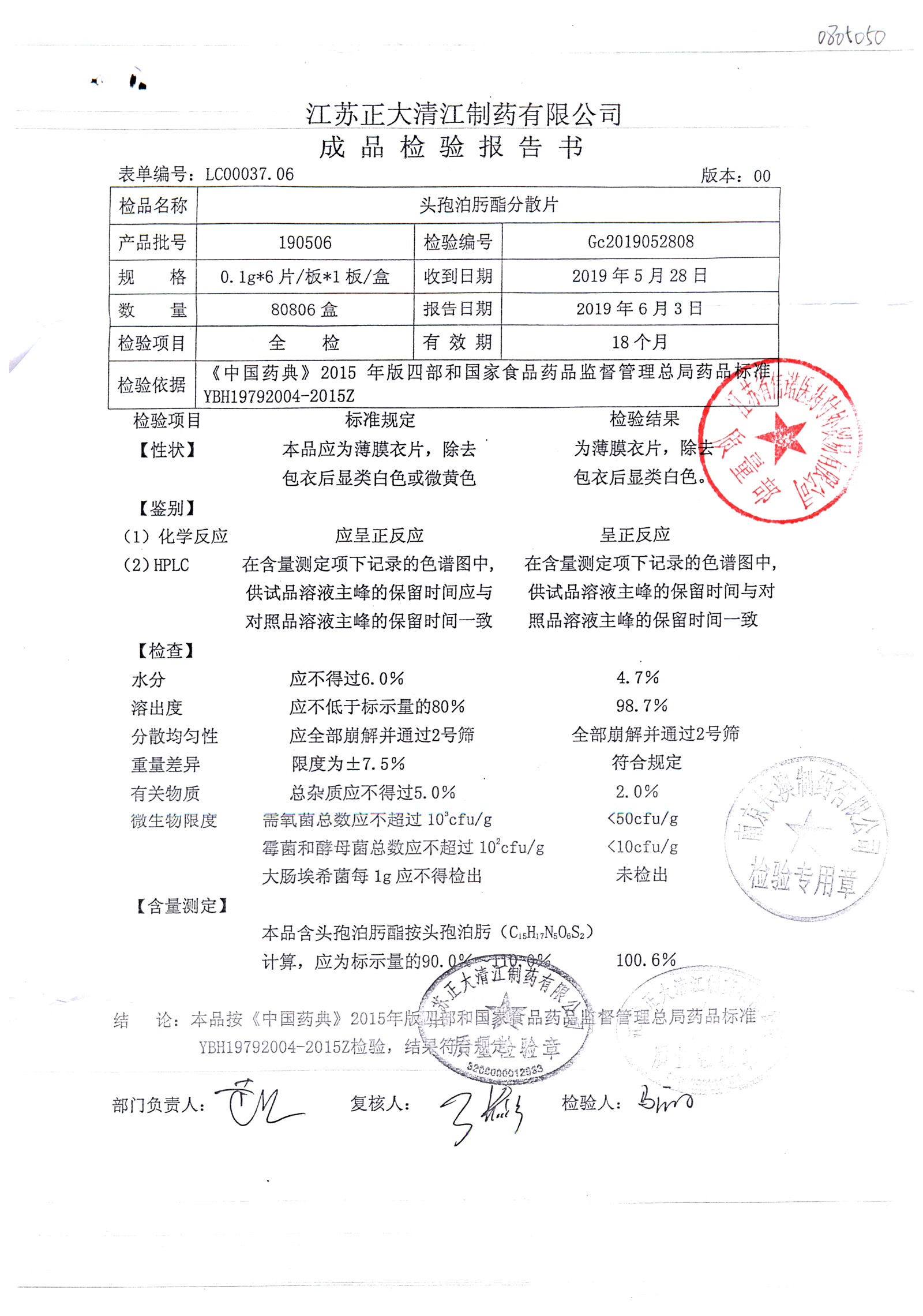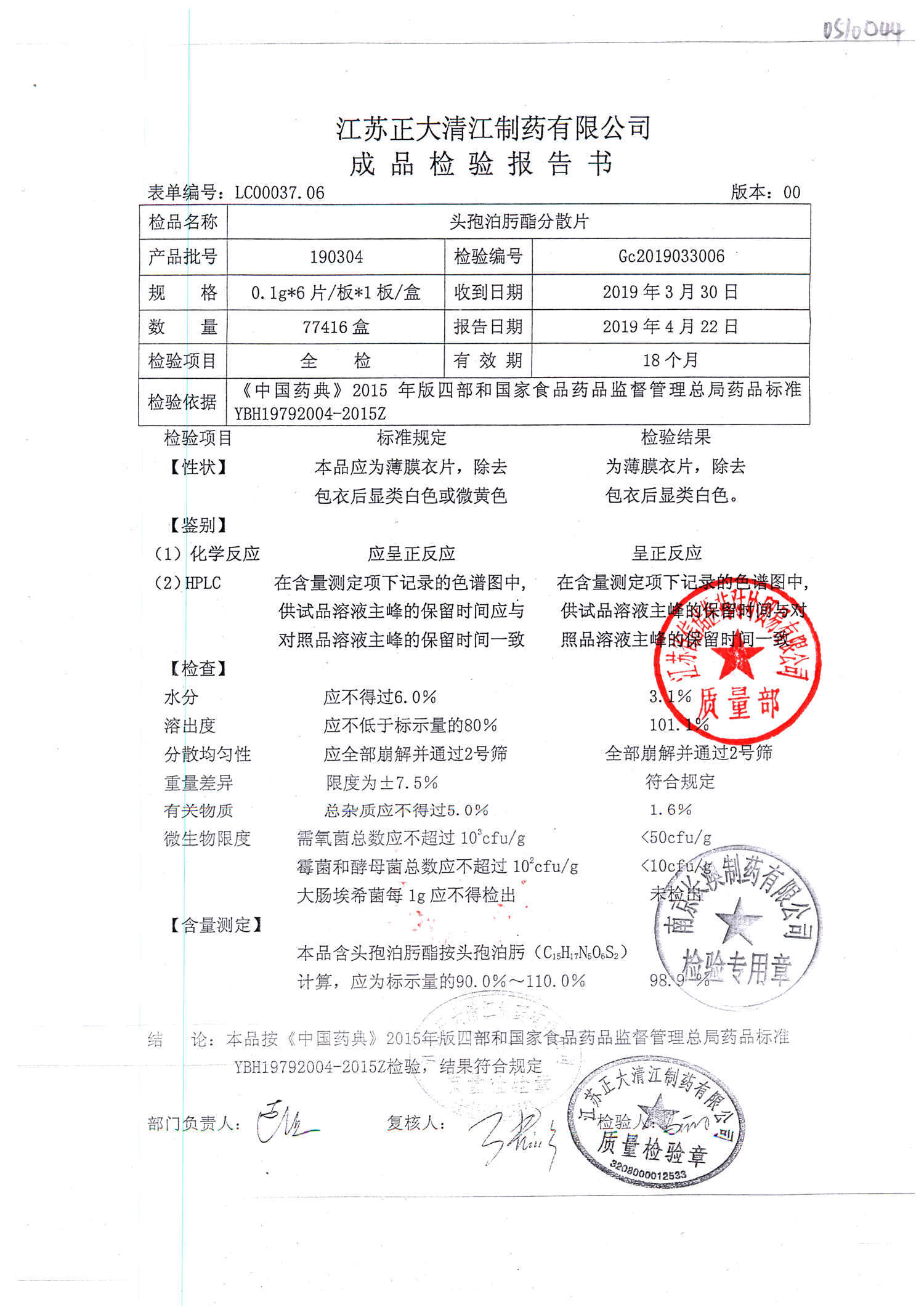 | 头孢泊肟酯分散片 | 0.1g*6s | 190506 | 查看详情 |