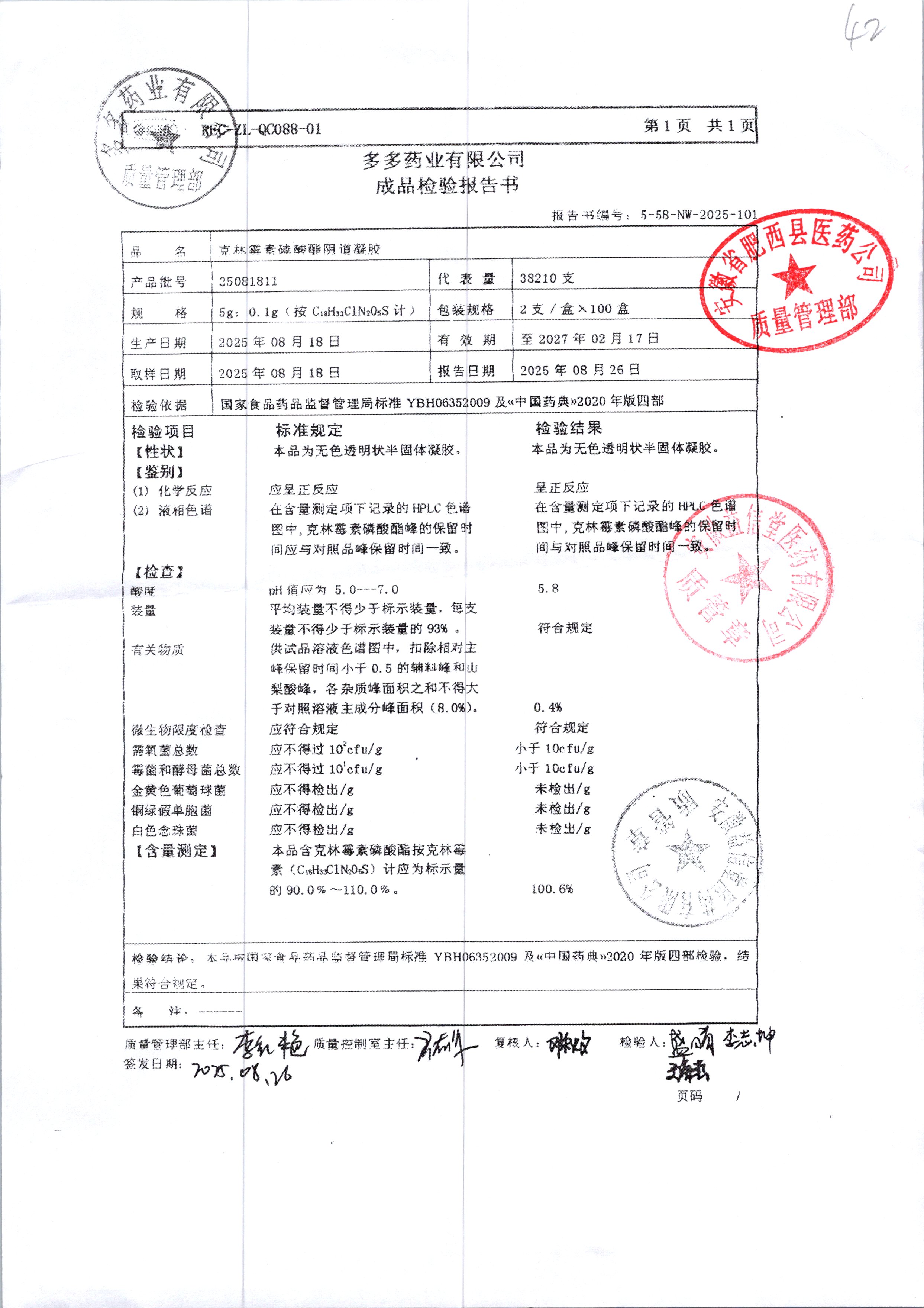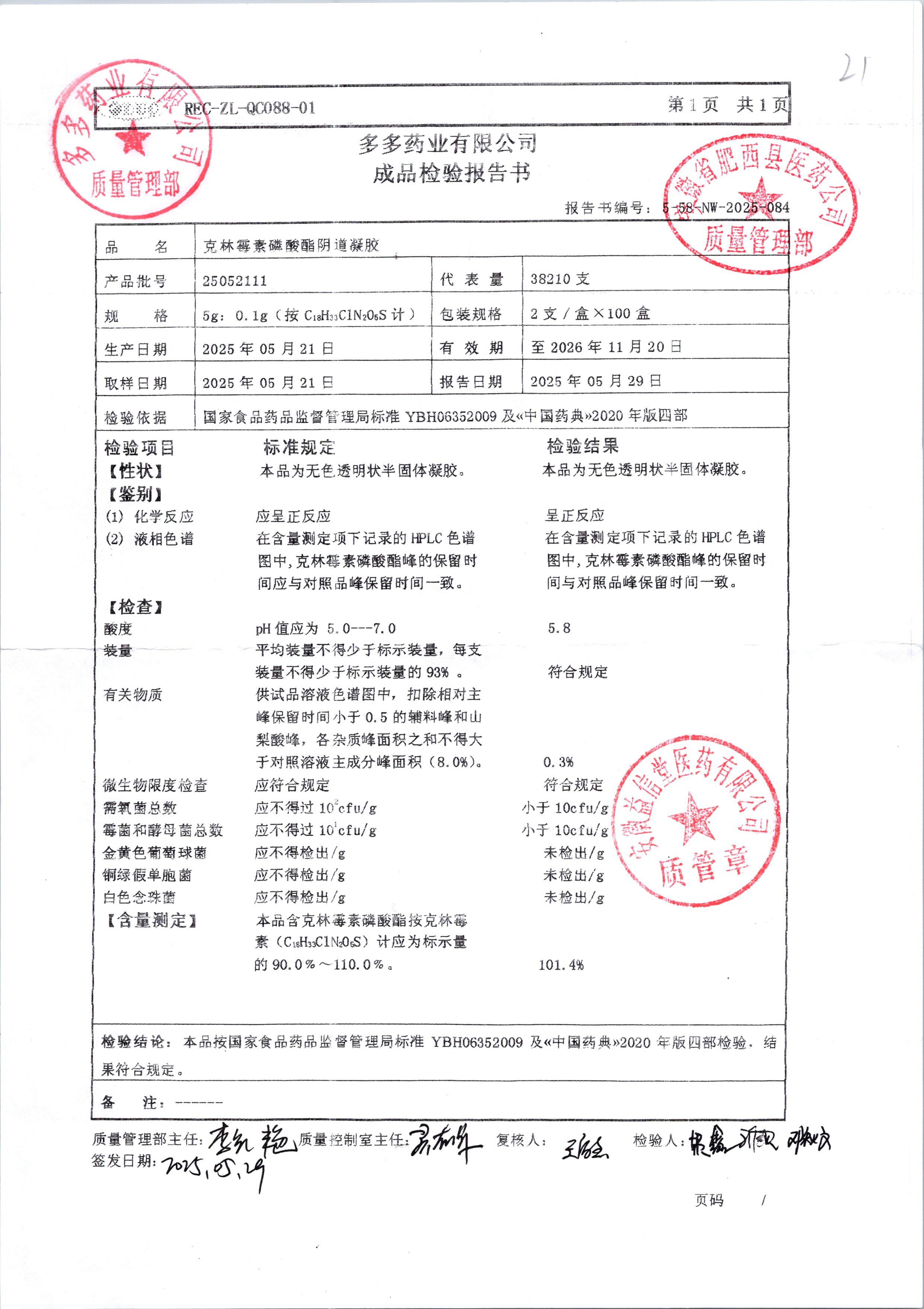 | 克林霉素磷酸酯阴道凝胶 | 5g:0.1g | 25092011 | 查看详情 |