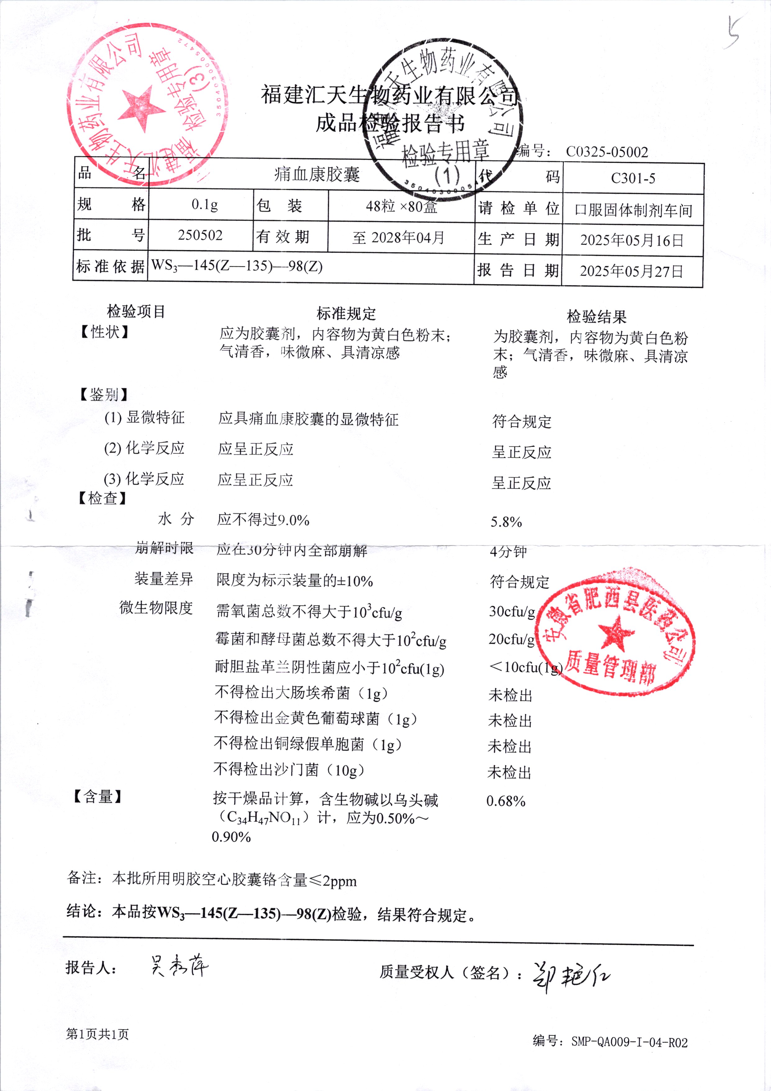 | 痛血康胶囊 | 0.1g*48粒 | 250501 | 查看详情 |