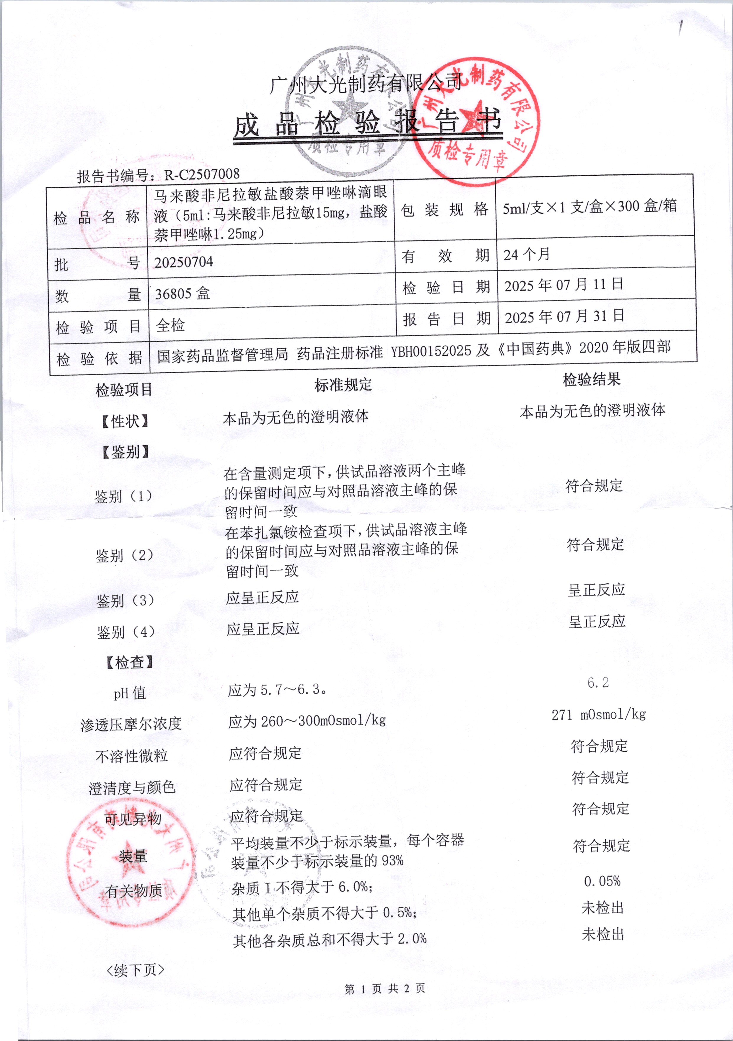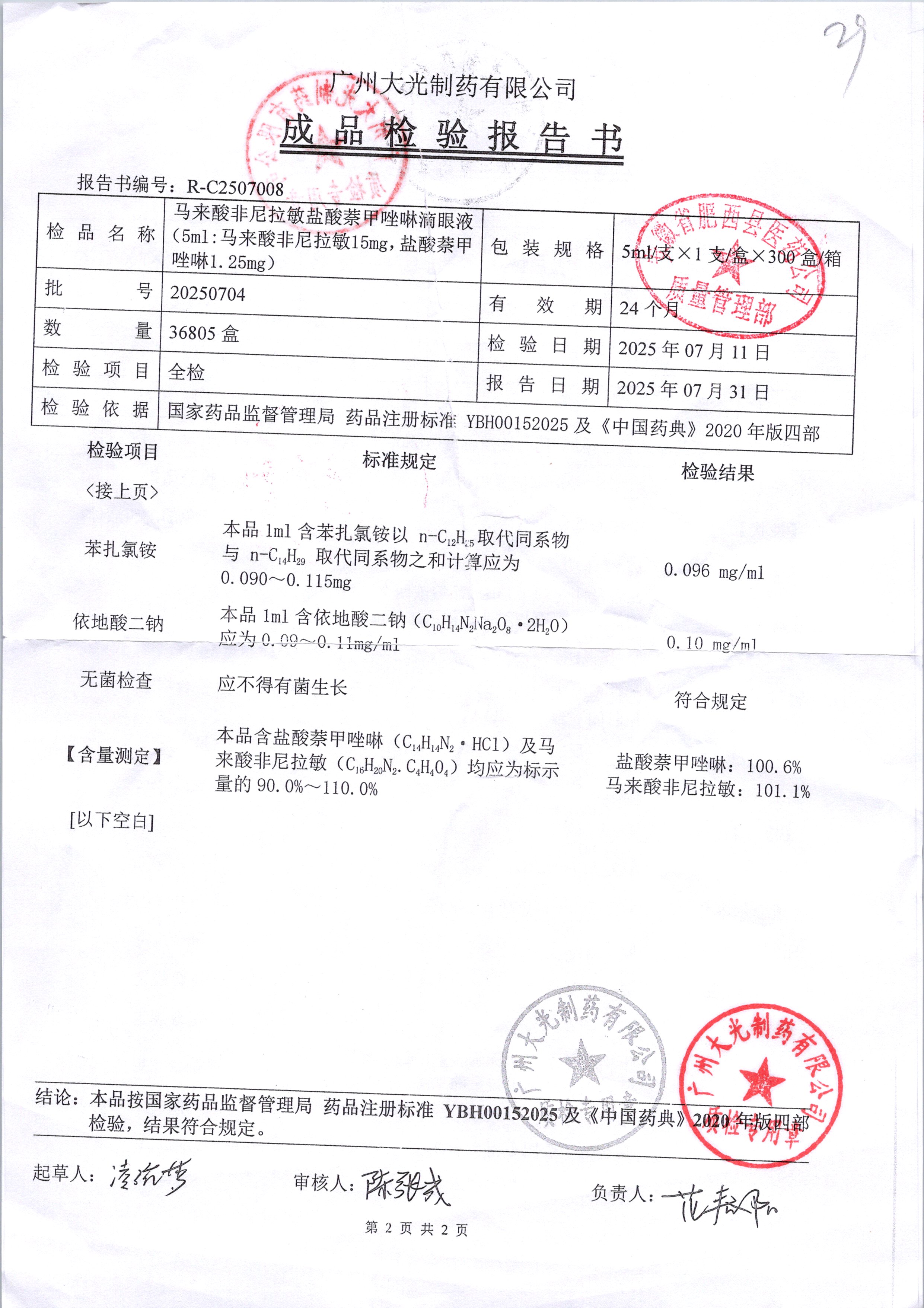 | 马来酸非尼拉敏盐酸萘甲唑啉滴眼液 | 5ml | 20250706 | 查看详情 |